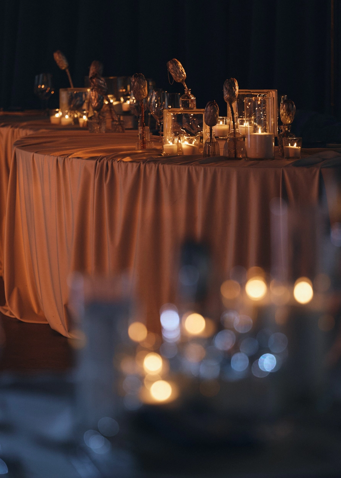 За основу взяли сочетание синего и белого цветов. Весь декор состоял из огромного количества свечей, ледяных блоков и монофлористики в виде протеи с пирсингами.