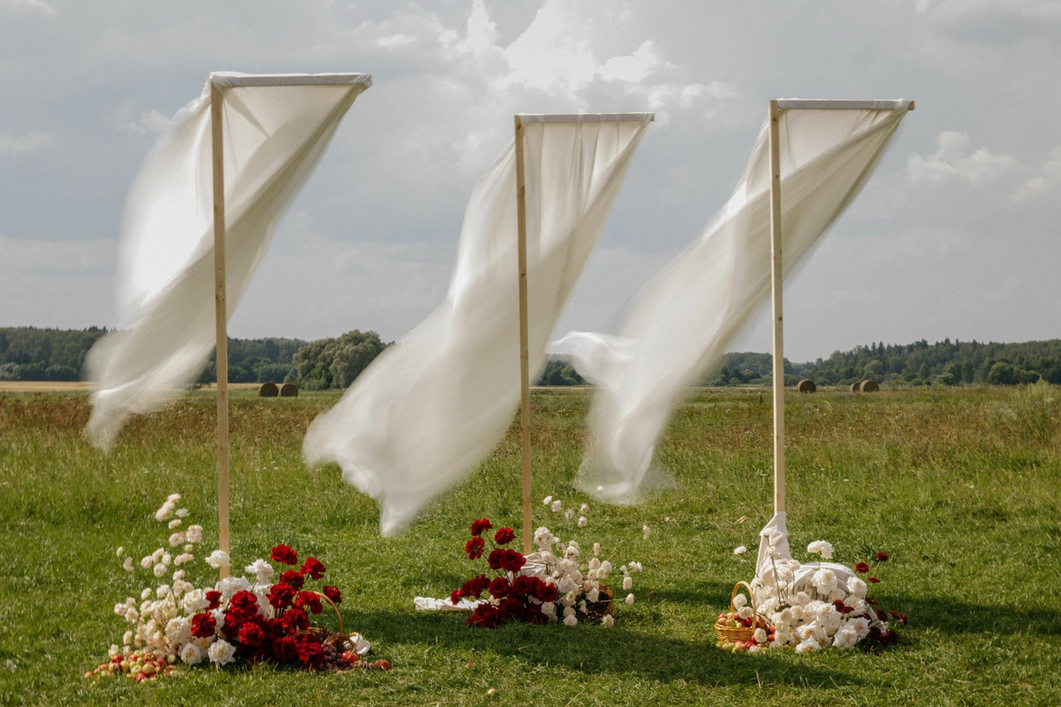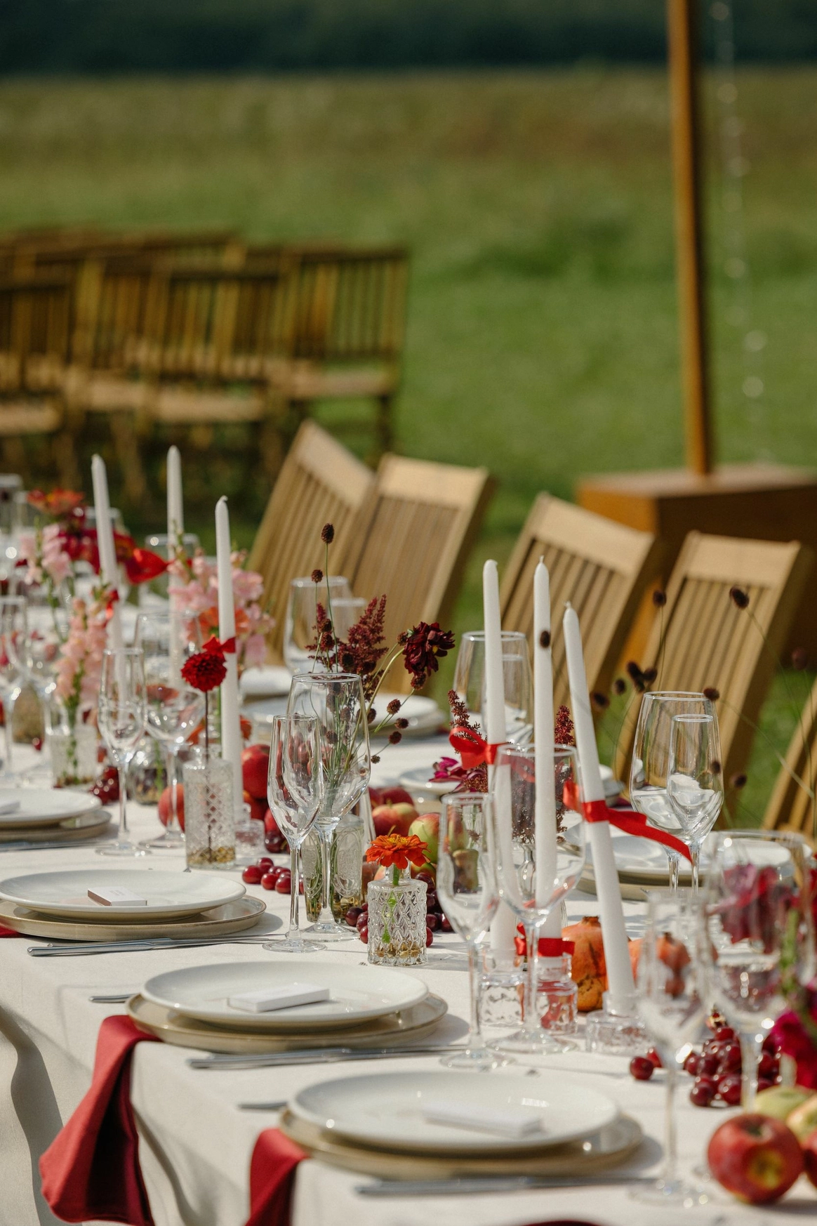 Французские мотивы в декоре и атмосфера прованса идеально вписались в пространство открытого поля, а французская музыка, меню и отсылки в программе церемонии дополнили весь смысл.
