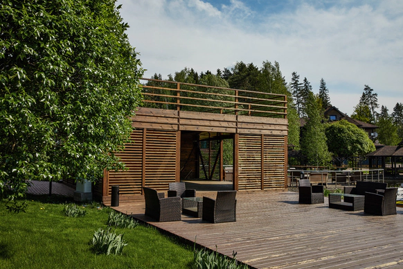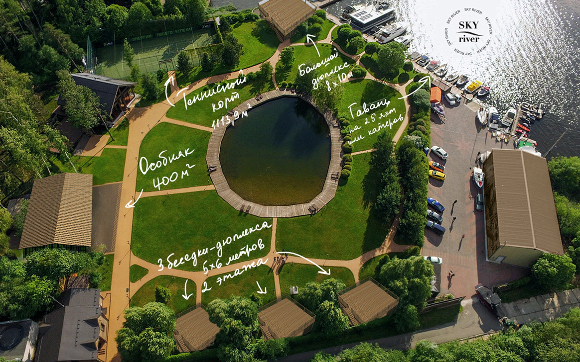 SKYRIVER Yacht & Country Club — это загородная площадка, расположенная в экологически чистом районе, на берегу Клязьминского водохранилища, среди живописной зелёной природы. На территории комплекса находятся просторный особняк, двухуровневые беседки, причал для яхт, теннисный корт и собственная парковка. Это ухоженная и охраняемая зона, где команда заботится о безопасности и комфорте гостей. Особенность площадки в том, что она предоставляет возможность индивидуального оформления и застройки территории, что позволяет воплотить самые смелые и оригинальные идеи для вашего мероприятия. SKYRIVER Yacht & Country Club — идеальное место для проведения запоминающихся событий любого формата и уровня.