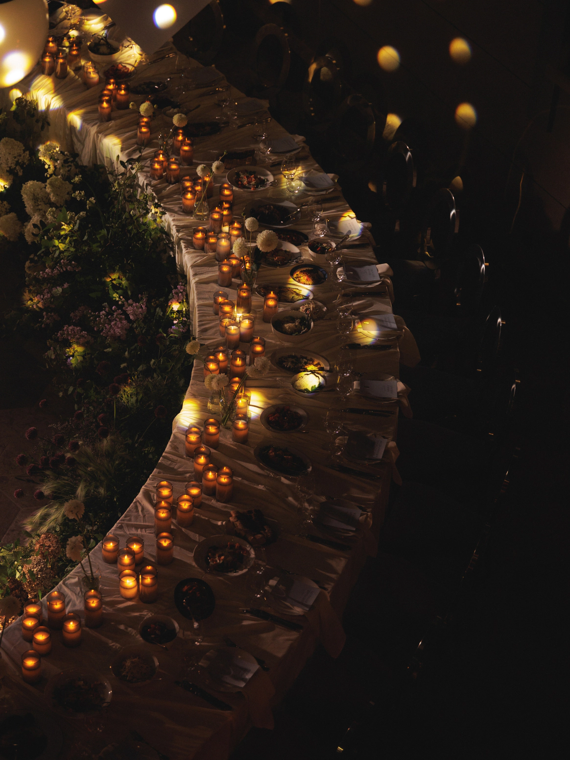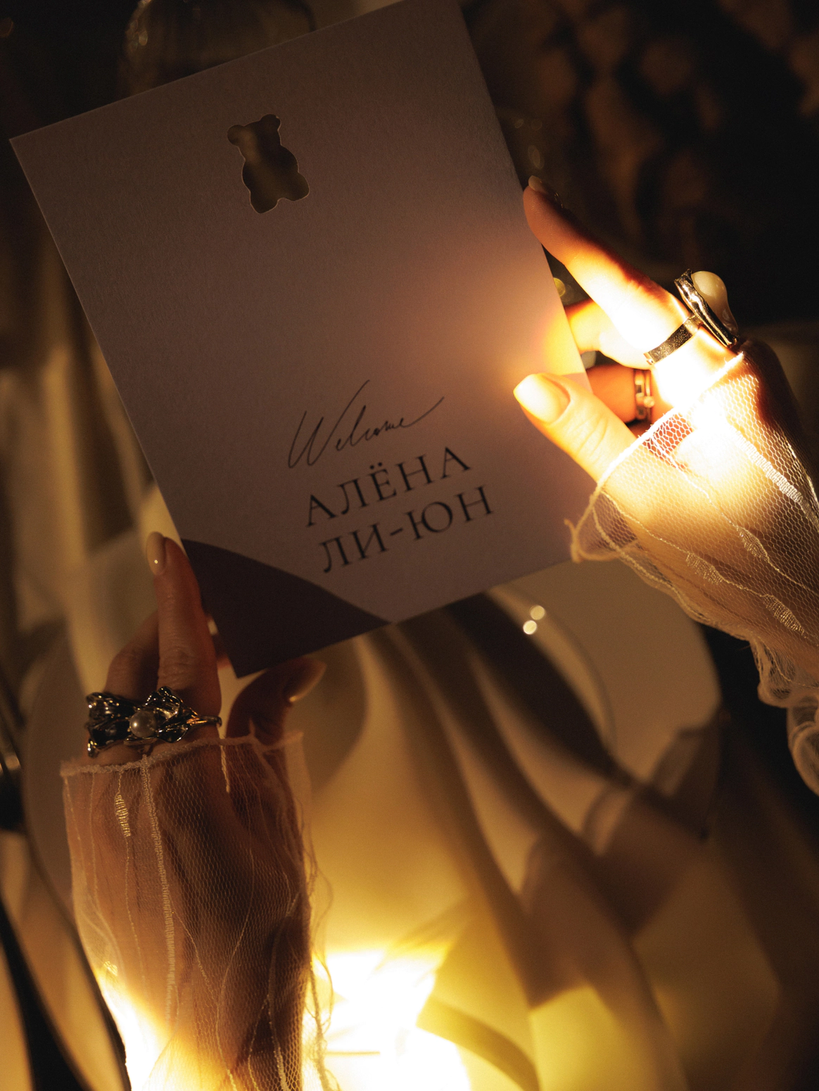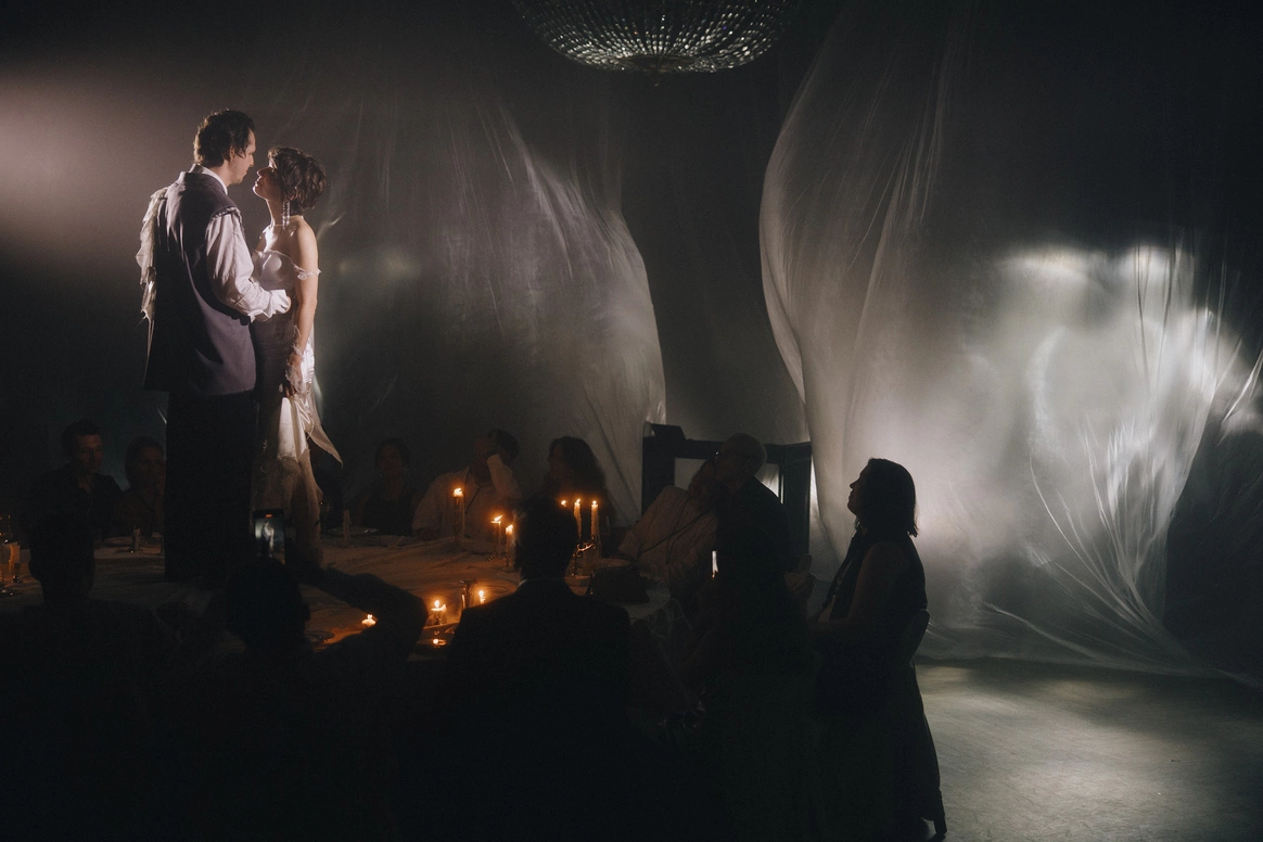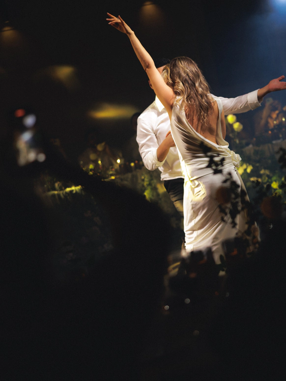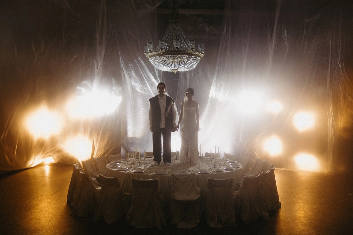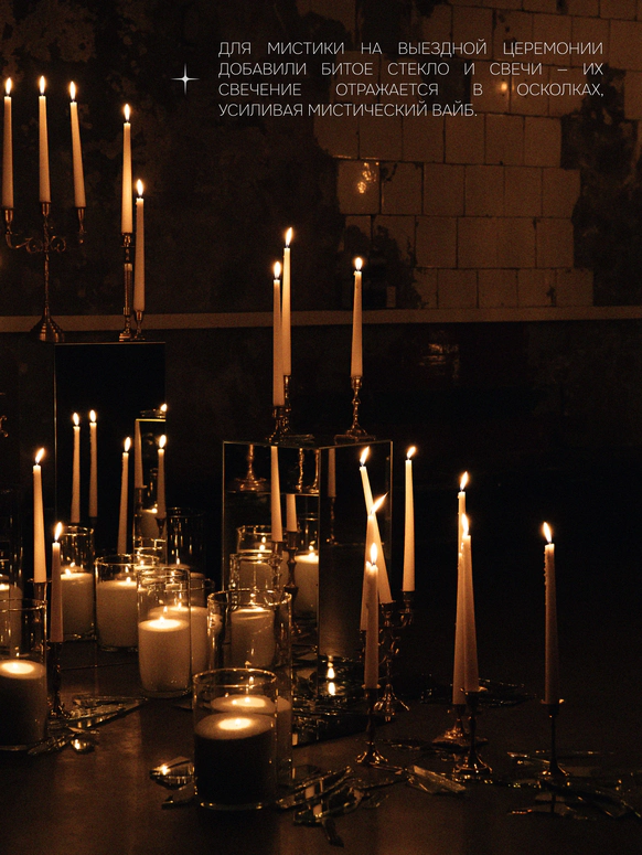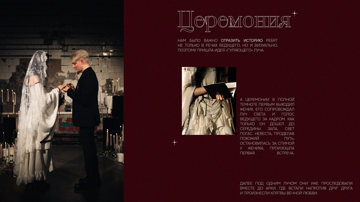 Моментом погружения гостей в тематику была выездная церемония в темноте с необычной сценографией выходов жениха и невесты. Поддерживали всю эту историю специально подобранным плейлистом.