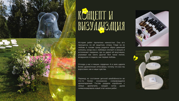 Переход из состояния детской влюбленности во что-то более осознанное, сопровождался ароматерапией. Гостям раздали коробочки с семью ароматами, каждая нотка духов символизировала новый этап жизни ребят.