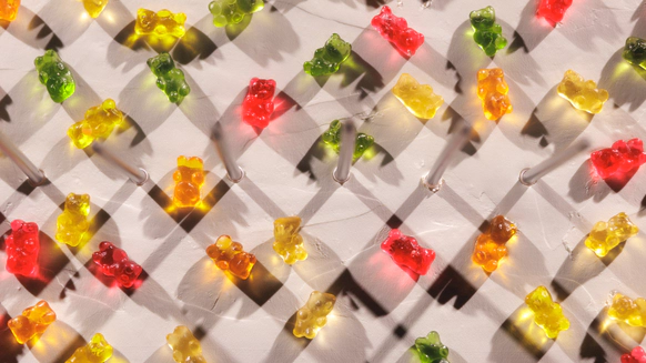 Мишки были придуманы еще до всех новостей и мы рискнули их оставить, несмотря на переживания команды, что это будет походить на детское мероприятие. Докрутили идею и развесили в зале под потолком сердечки, напоминающие конфетки.
