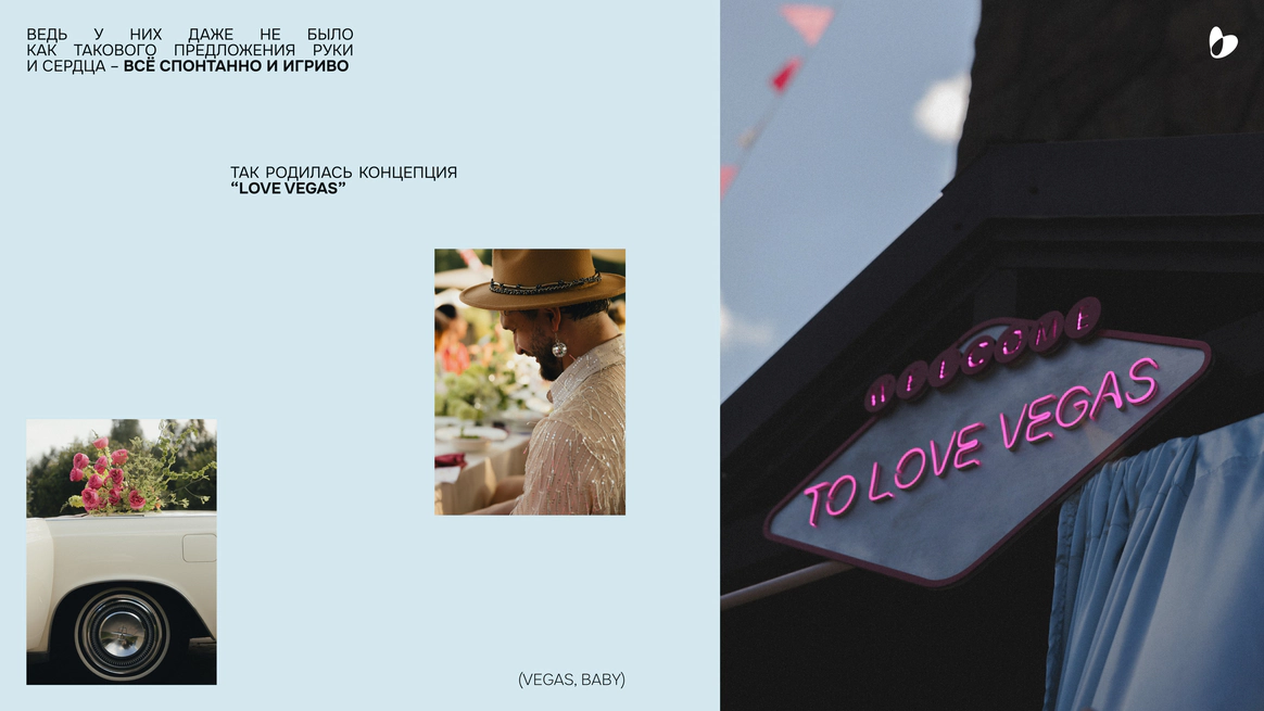 Но чем больше мы узнавали их как парочку, тем сильнее хотелось добавить чего-то заводного и лёгкого, ведь у них даже не было как такового предложения руки и сердца — всё произошло спонтанно и игриво. Так родилась концепция LOVE VEGAS.