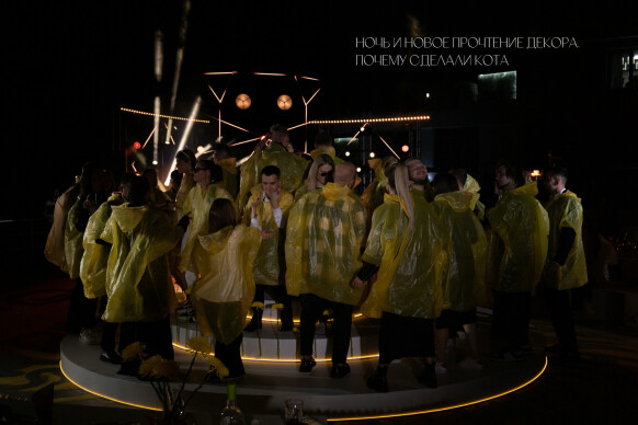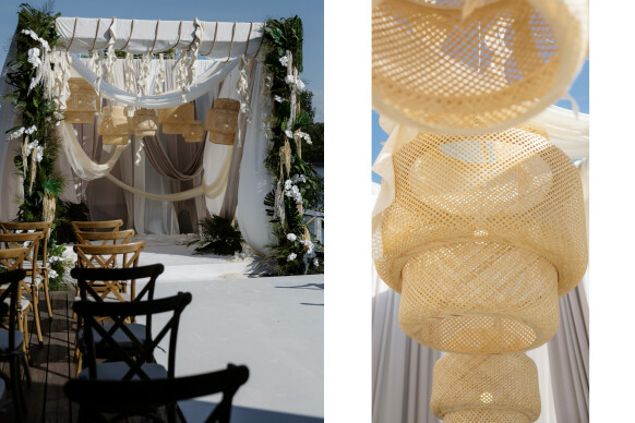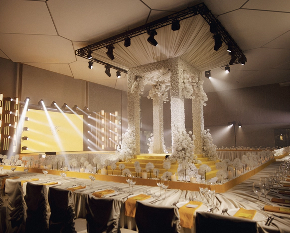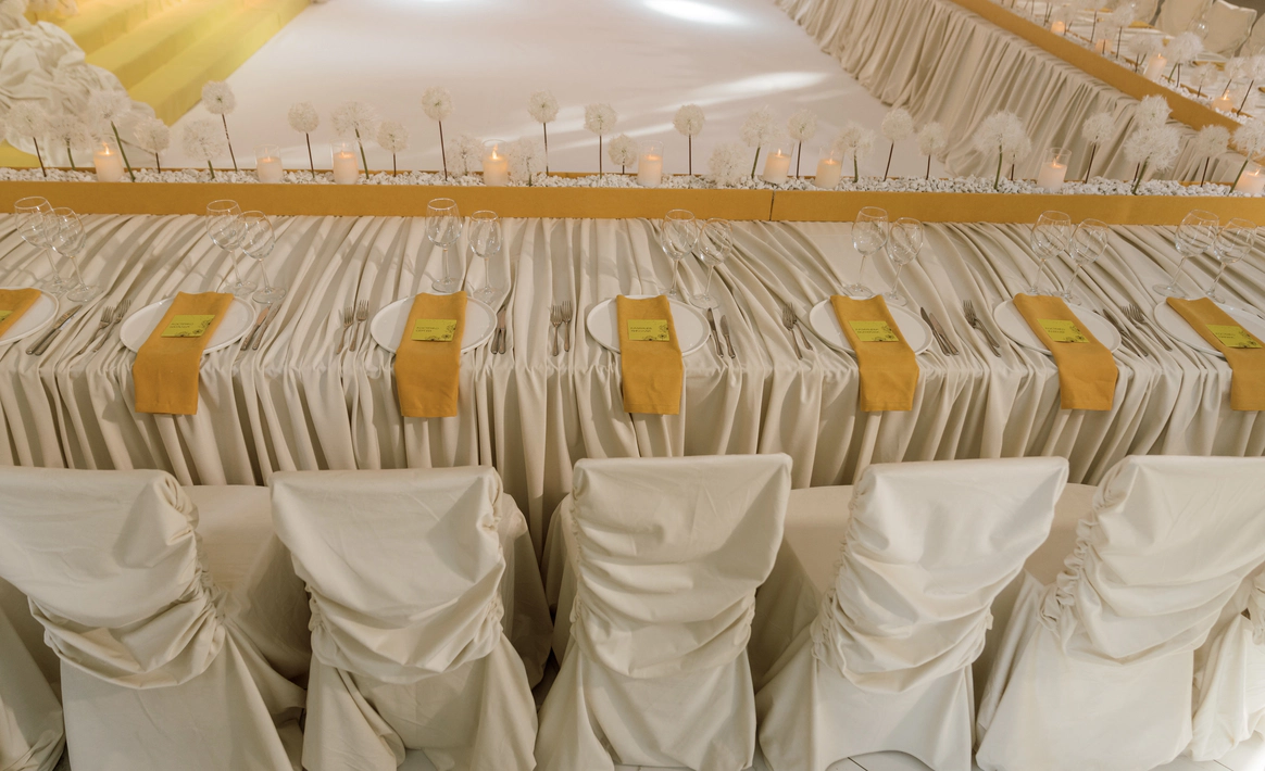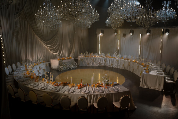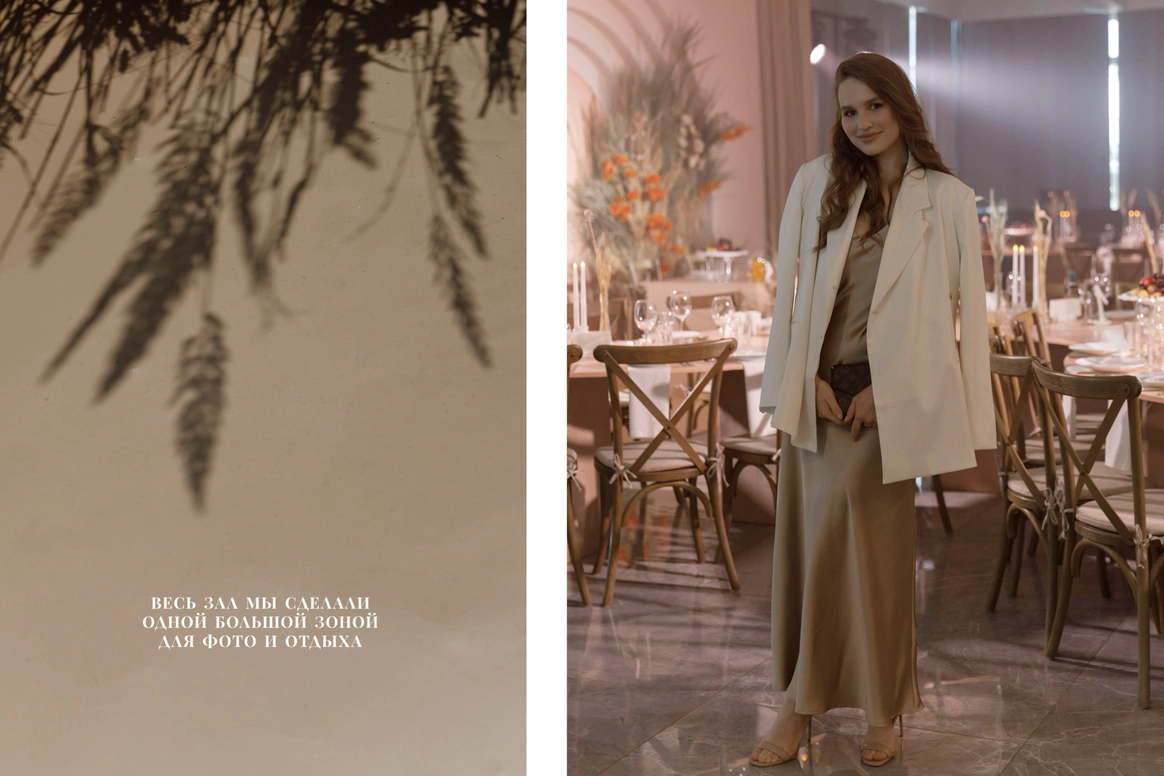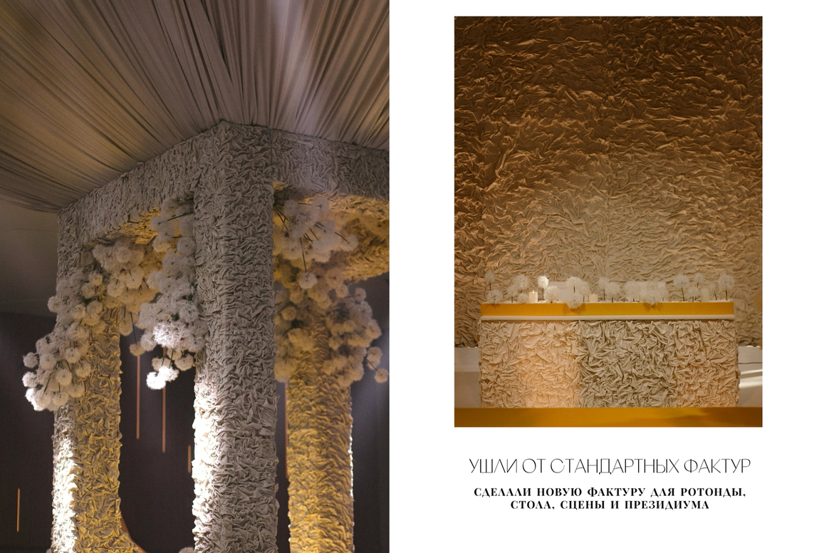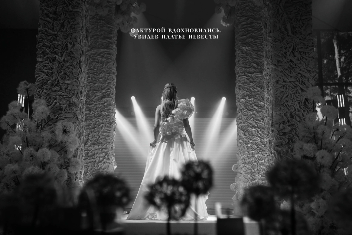 Невеста мечтала о церемонии у ротонды (которой, к слову, в Челябинске просто не существует). Мы спроектировали ротонду внутри зала, сделав её точкой притяжения на площадке и выполняющую функции зоны церемонии, сцены и фотозоны.