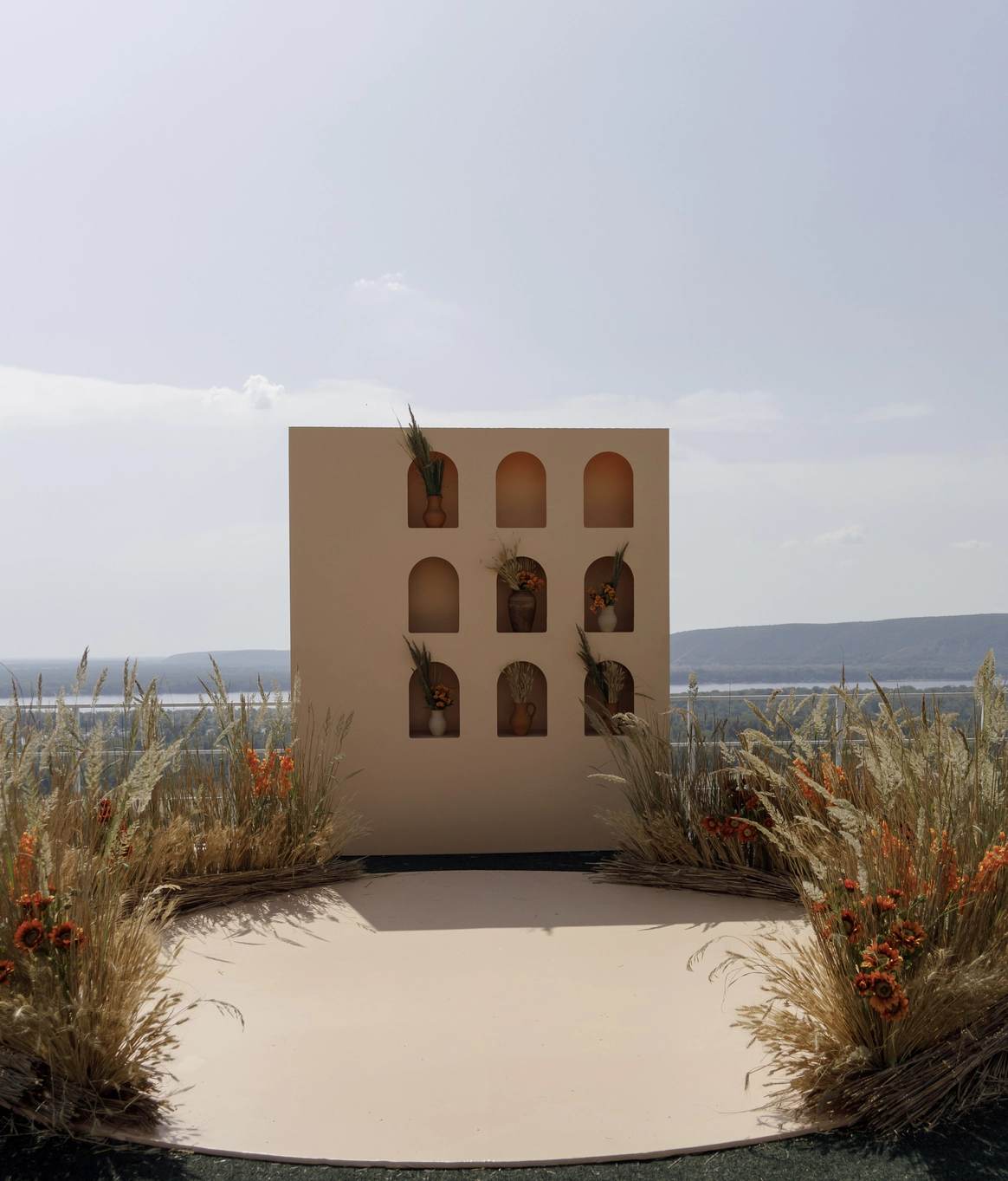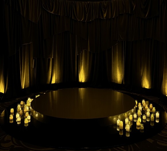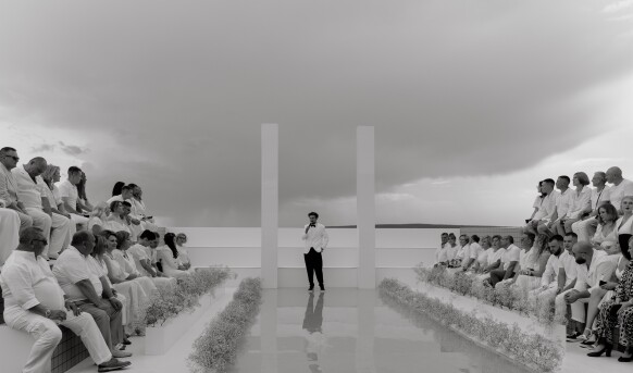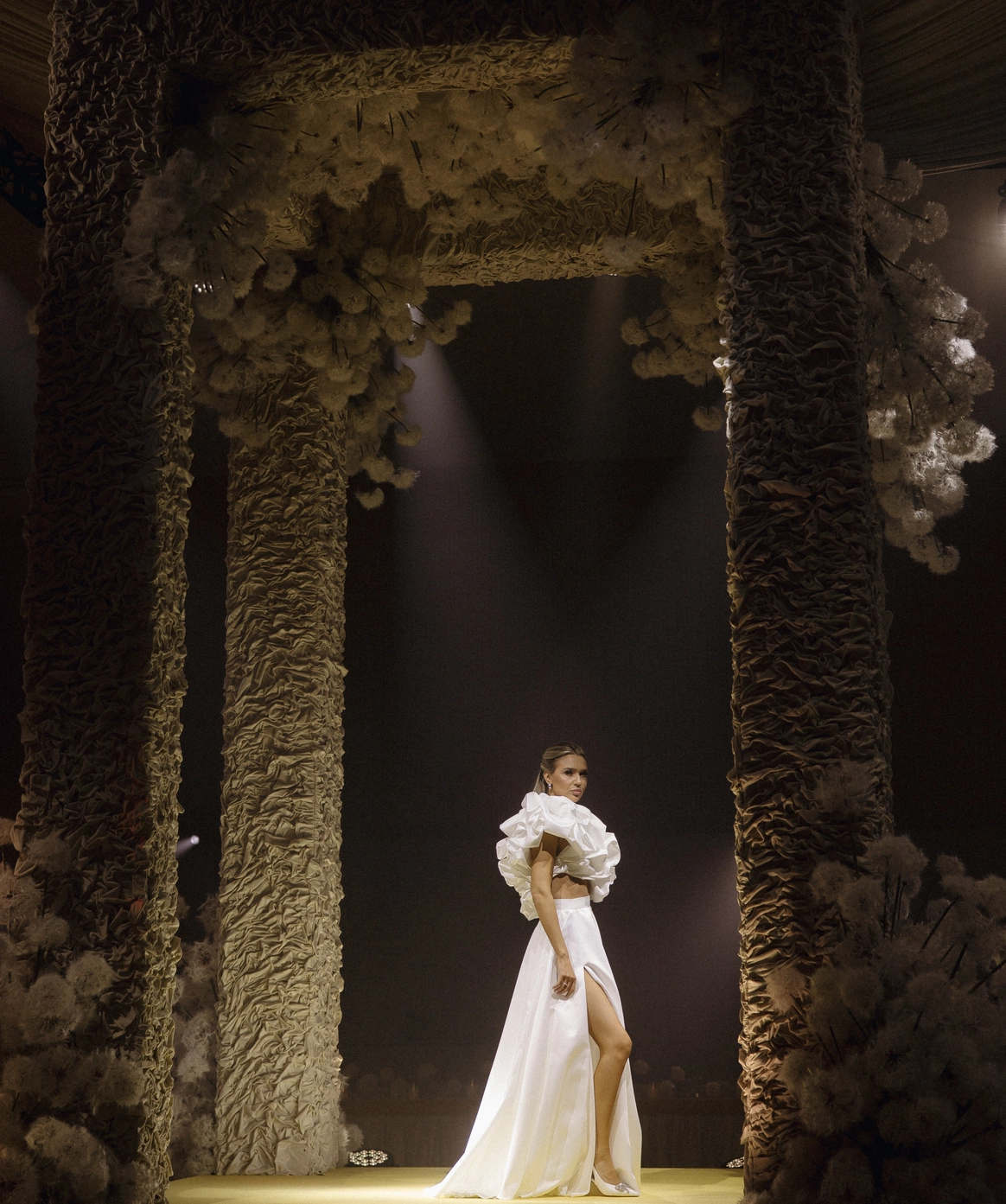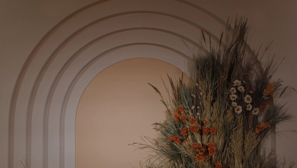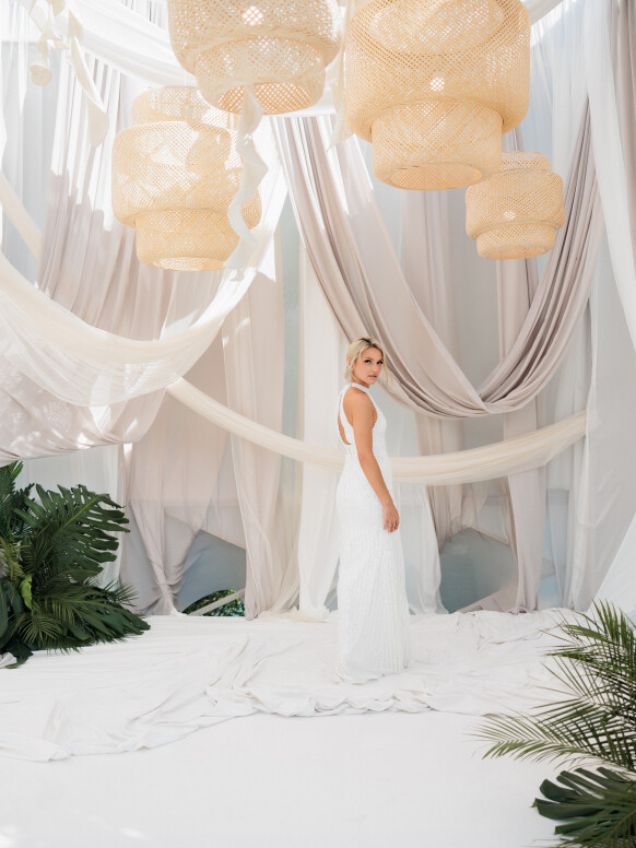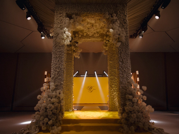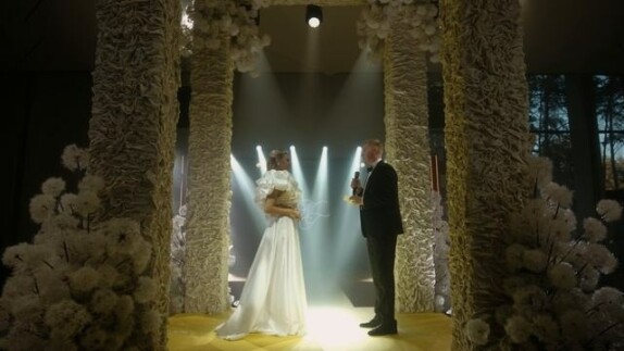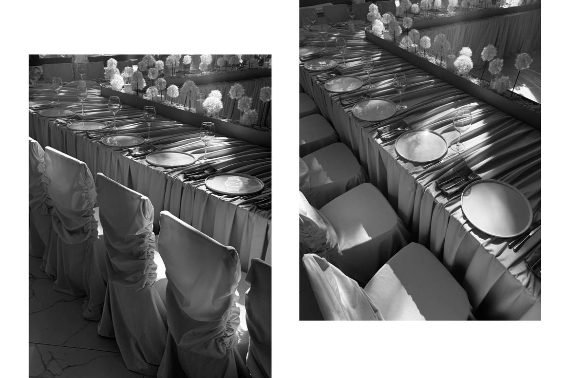 Невеста мечтала о церемонии у ротонды (которой, к слову, в Челябинске просто не существует). Мы спроектировали ротонду внутри зала, сделав её точкой притяжения на площадке и выполняющую функции зоны церемонии, сцены и фотозоны.