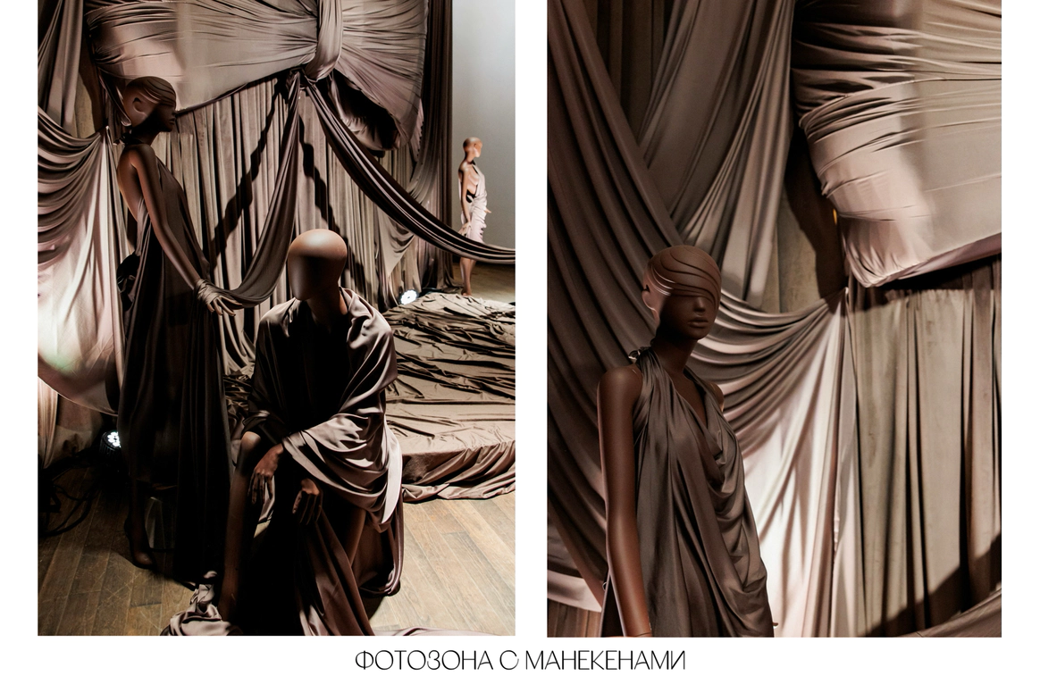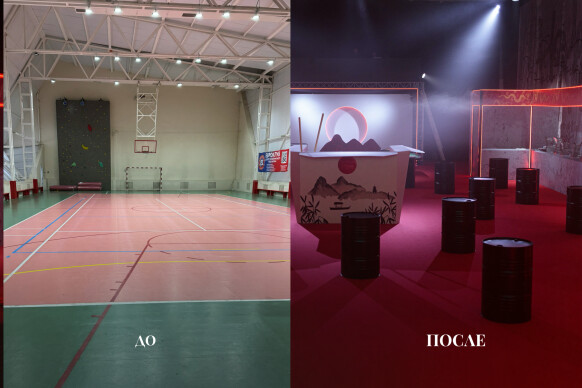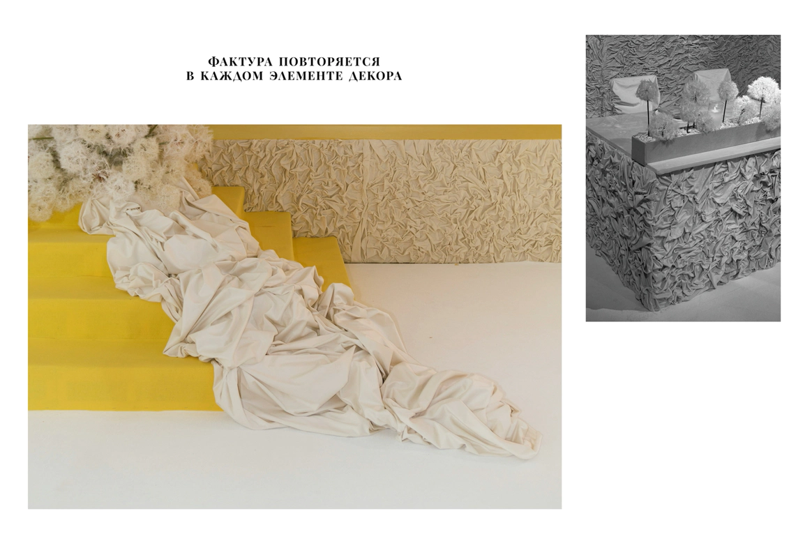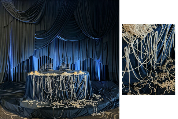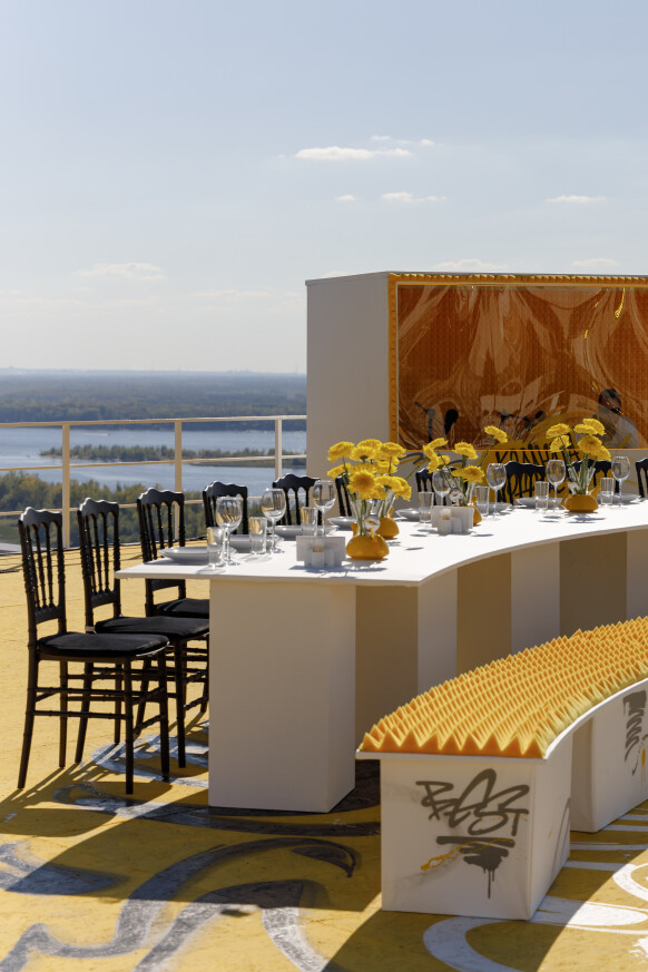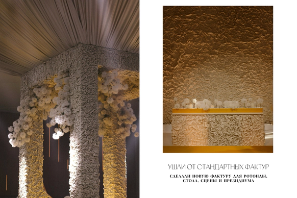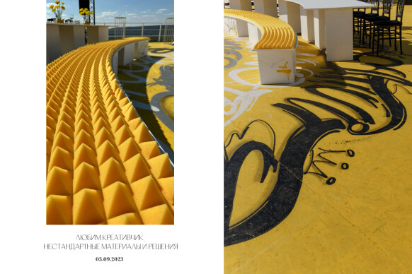 Для всех арт объектов и столов мы использовали натяжной потолок, который смотрелся стильной фактурой для наших форм.