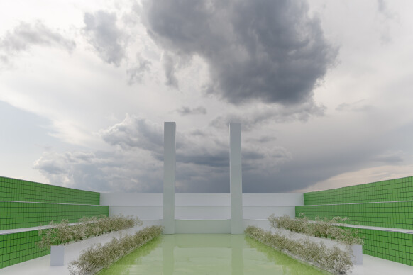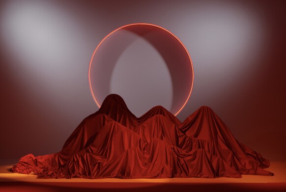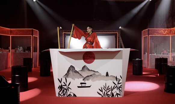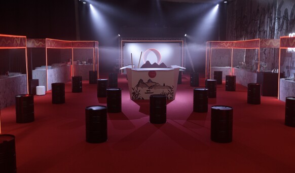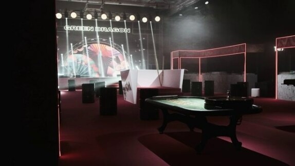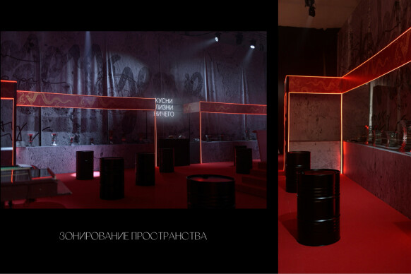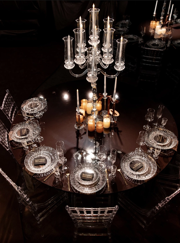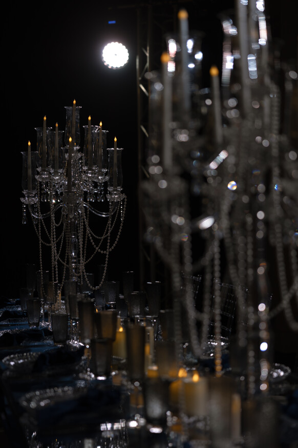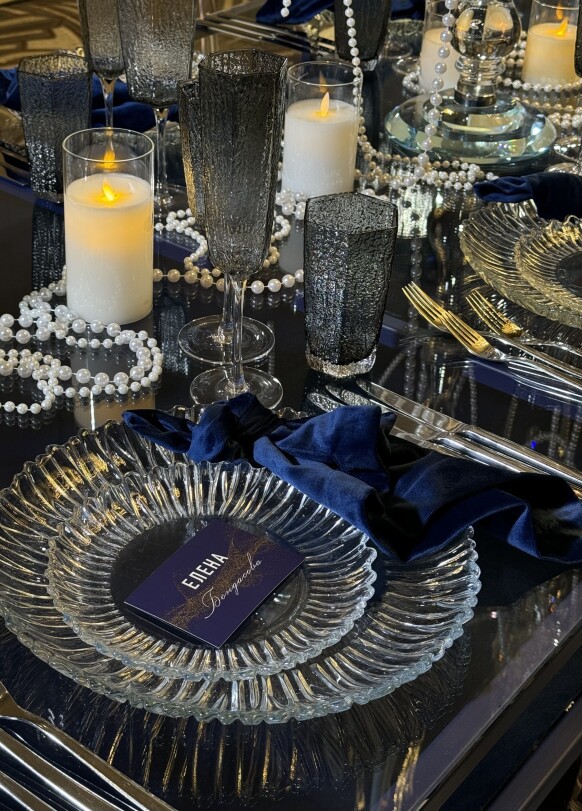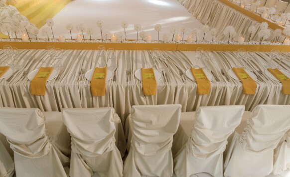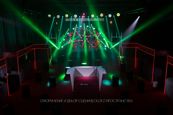 Для всех арт объектов и столов мы использовали натяжной потолок, который смотрелся стильной фактурой для наших форм.