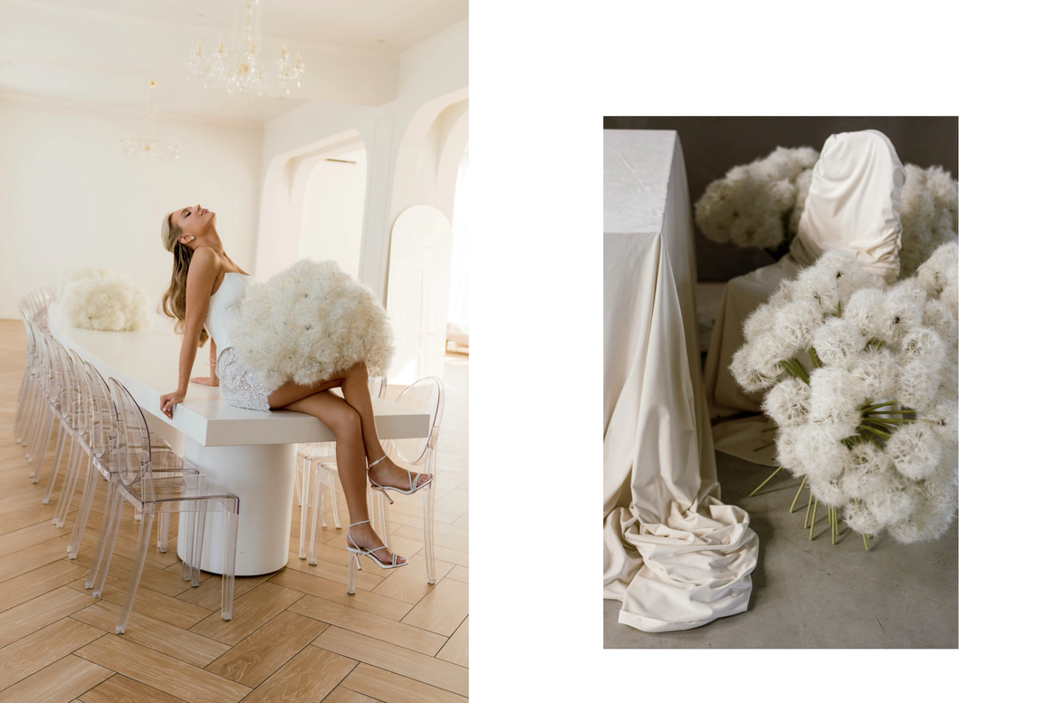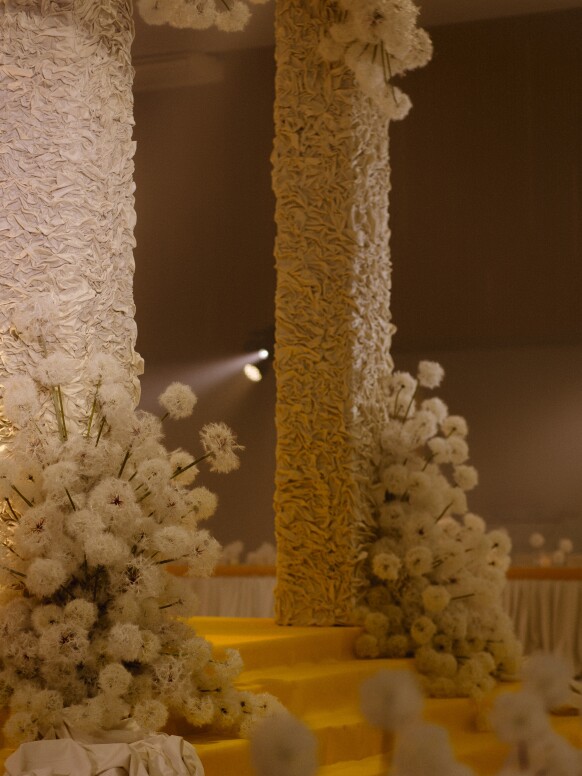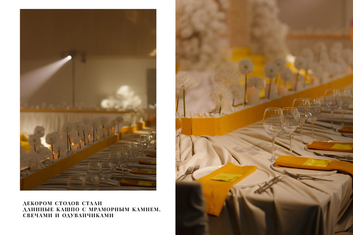 Но было одно "но" — ребята не хотели ввязываться в какие-то глубокие смыслы. Поэтому мы вложили в эту свадьбу мечту об одуванчиках, с которыми я мечтала создать проект 2 года (2500 тысячи штук). Но почему именно одуванчик? Да, просто потому что нам так захотелось. Отсюда, кстати, и желтый цвет.