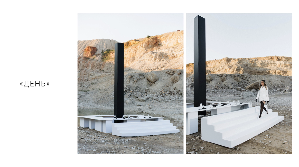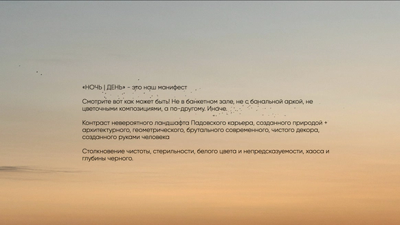 CONCEPT: Свадебный проект на грани контрастов. Симбиоз дикой природы и рукотворной геометрии. Падовский карьер - сложная, редкая, труднодоступная локация. Перепад высот, где строились локации, составлял высоту 9-ти этажного дома.