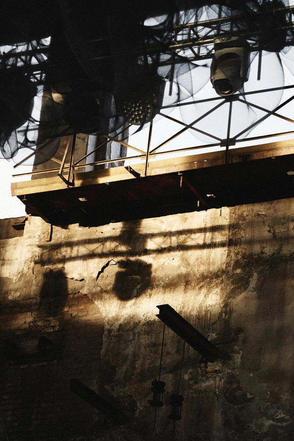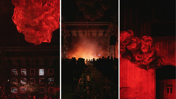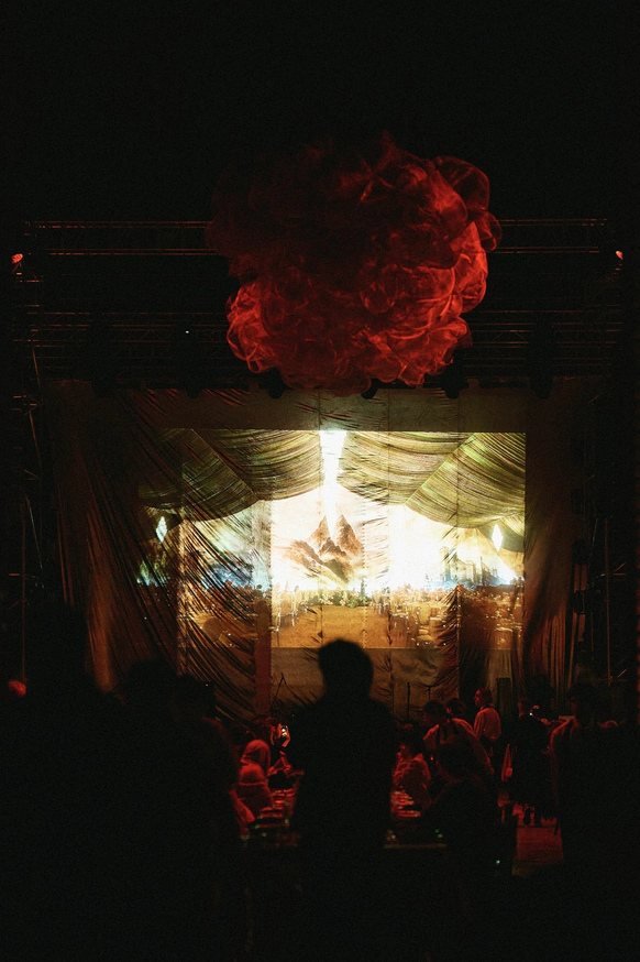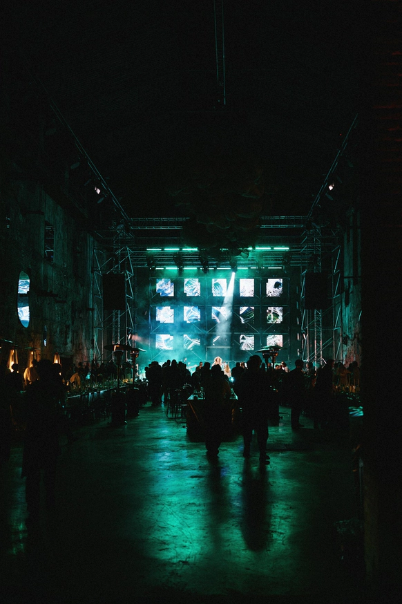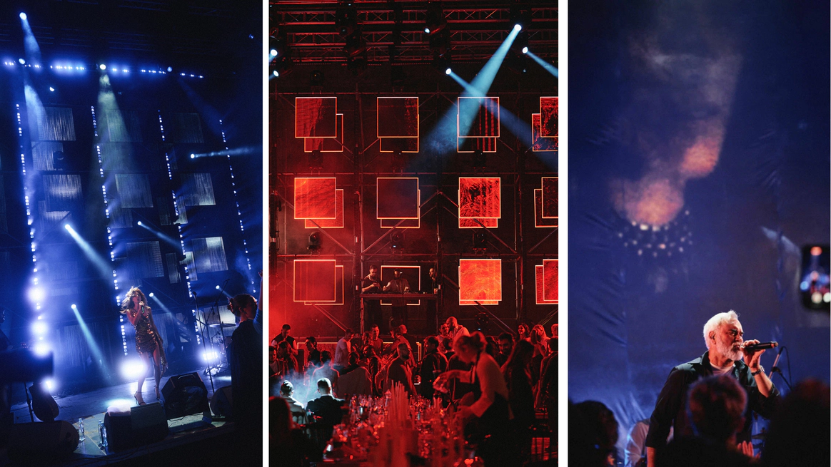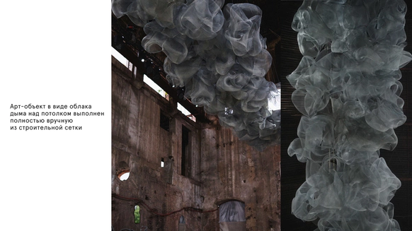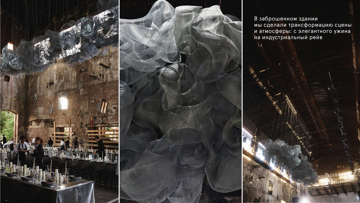 Элегантный ужин с трансформацией в «индустриальный рейв», где мы сознательно сохранили грубый металл сцены, бетон и кирпич, усилив их светом, медиа и декором ручной работы. Ключевым объектом стало «облако дыма»: арт-инсталляция 25х12 м из строительной сетки, меняющаяся вместе с музыкой и сценарием.