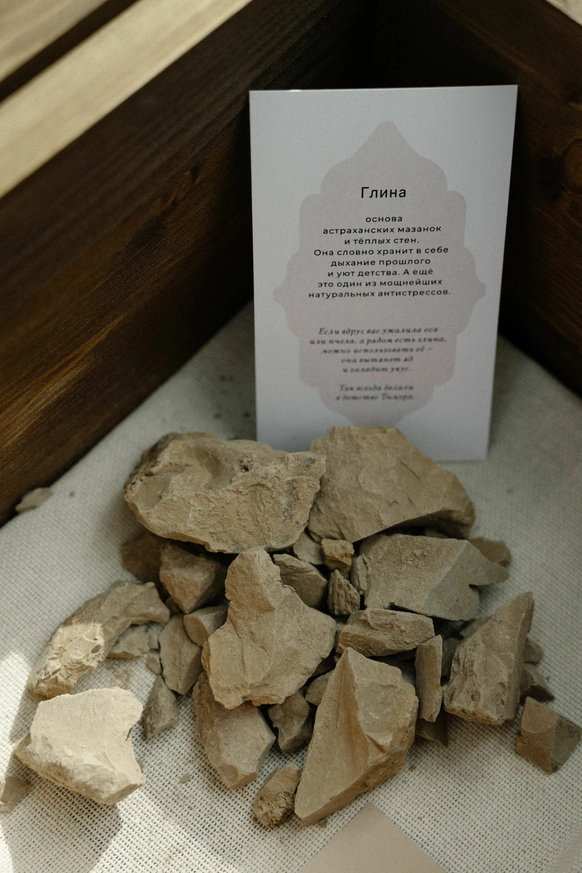 3. Особая деталь - интерактивные шкатулки с глиной, лотосами, ветками и другими символами региона и пары, которые дополняли карточки-истории: гости могли смотреть, трогать, вдыхать ароматы и читать, как каждый объект связан с Астраханью и героями.