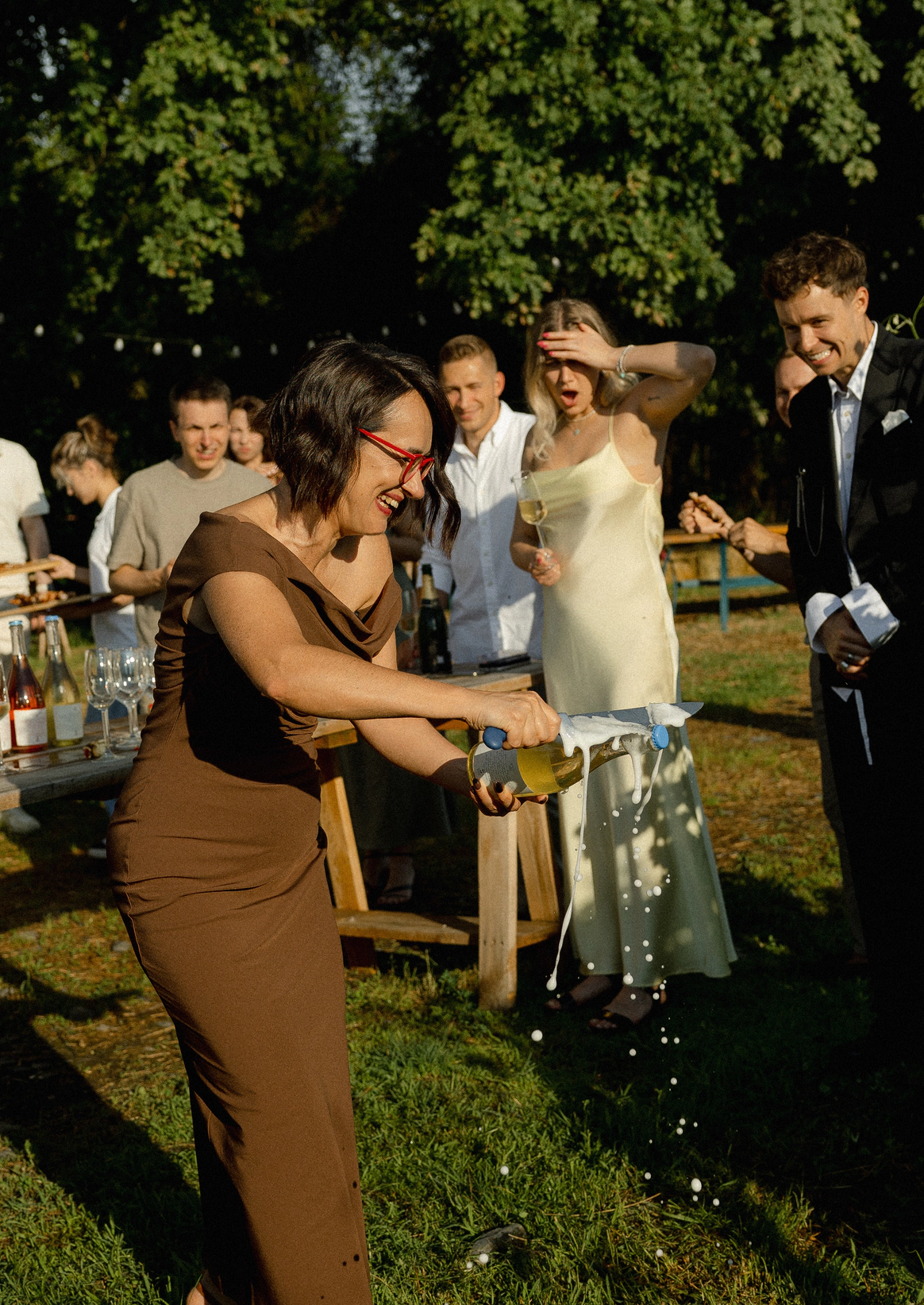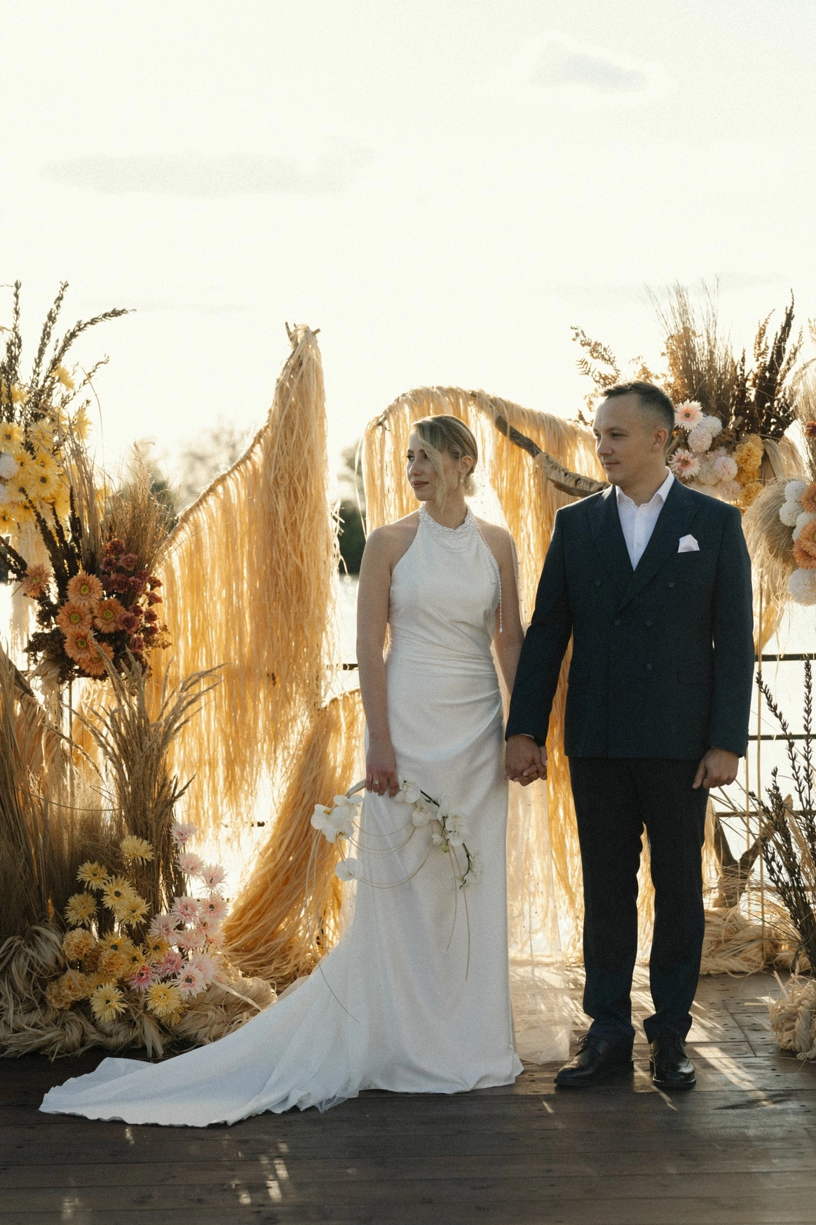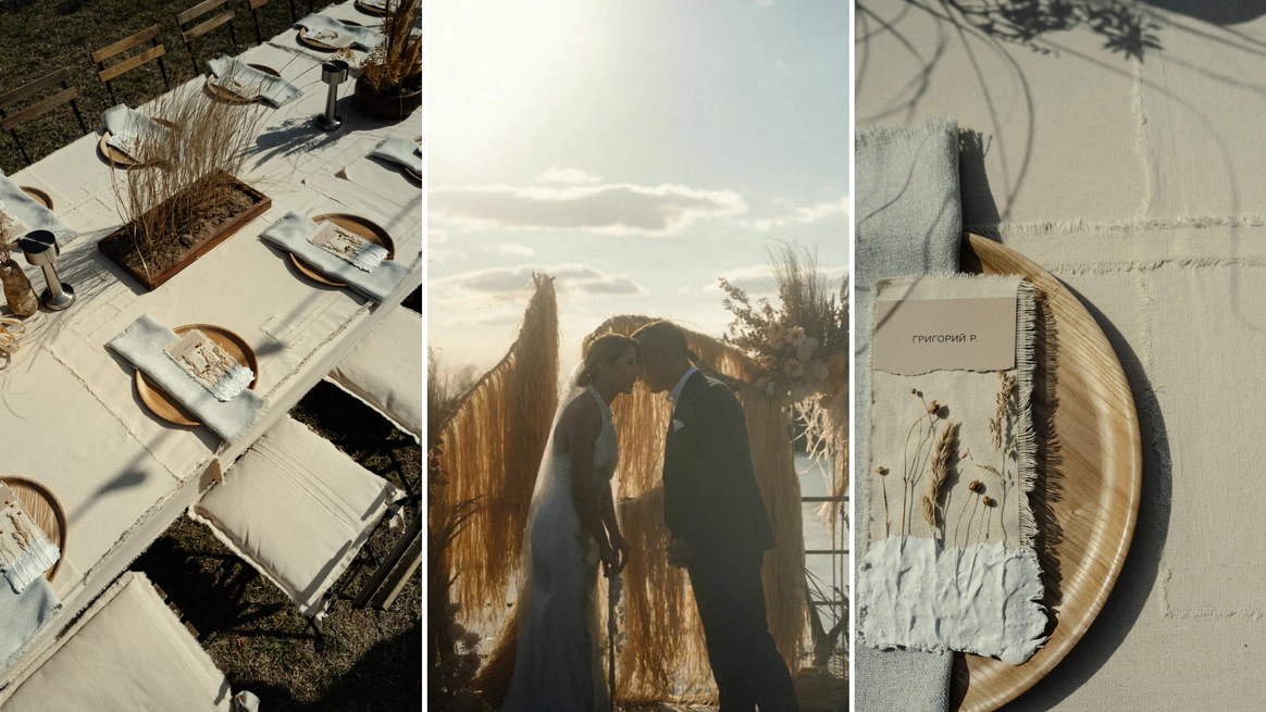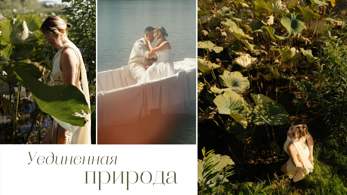 Свадьба Тимура и Алины прошла на рыболовной турбазе под Астраханью. Гости заселялись на базу, ходили в баню, завтракали на берегу с таранкой, а день свадьбы строился как маршрут по нескольким зонам: фуршет, церемония на пирсе среди лотосов, ужин на поляне и кинотеатр под звёздами.
