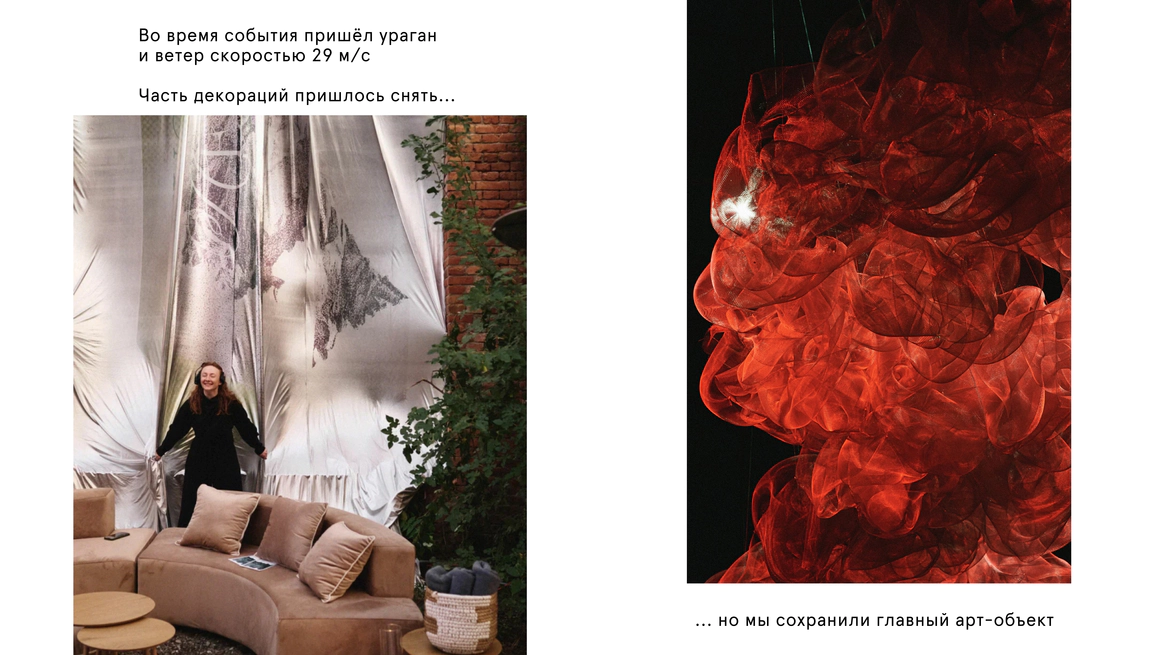 6. Ветре до 29 м/с, который сносил скатерти с посудой и рвал полотна на фасаде, вся ключевая конструкция - облако, сцена, свет, экраны осталась стабильной за счёт инженерных креплений и оперативной перестройки.