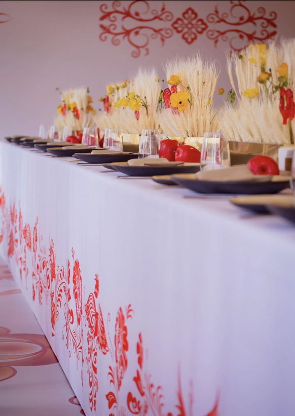 Центральным элементом стал 25-и метровый общий стол - метафора объединения всех гостей в одном кадре и едином действии.