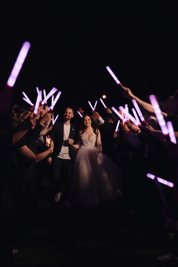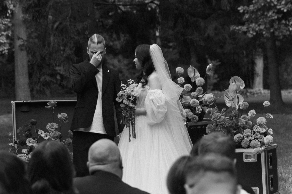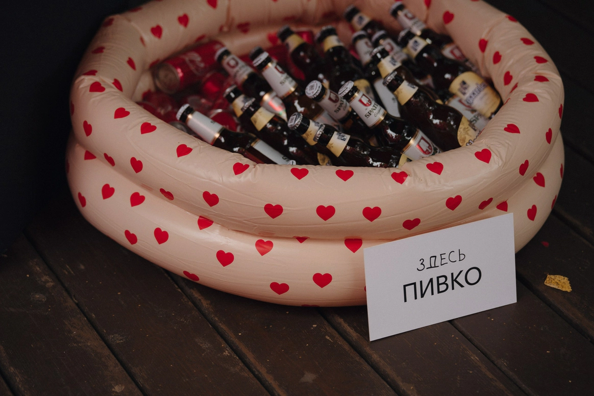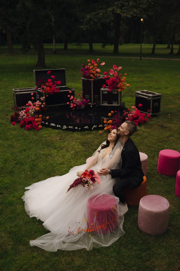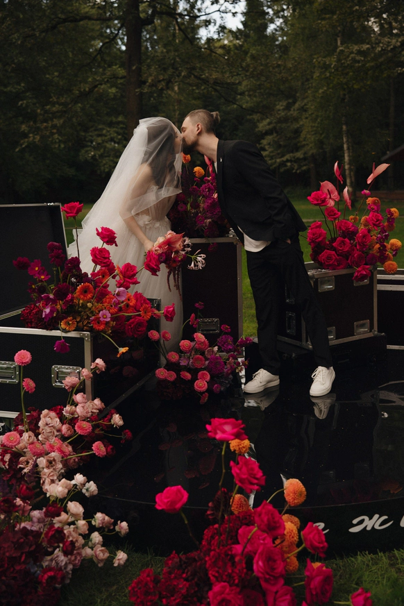 Для нашей пары - фанатов концертов и группы The Hatters мы превратили свадьбу в настоящий фестиваль. Открыли магазин мерча, бросали ледяные шоты, сделали церемонию с декором из музыкальных кофров и построили концертную сцену.