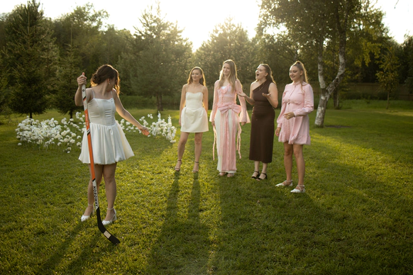 Отсылки к жизни пары появлялись и в активностях: жених работает в авиации, поэтому парням бросали бумажный самолётик, девушкам - хоккейную шайбу, отражая любовь пары к хоккею