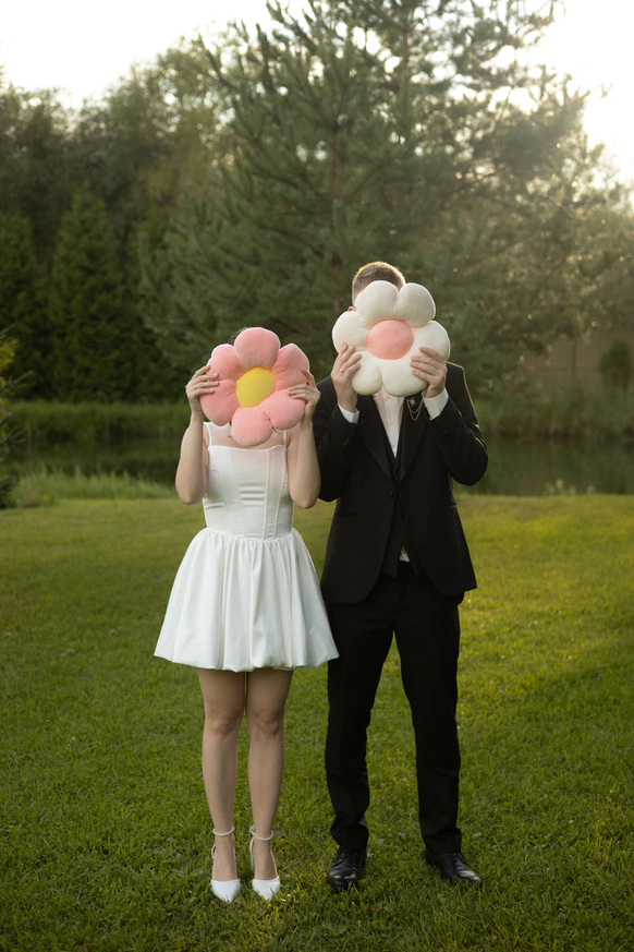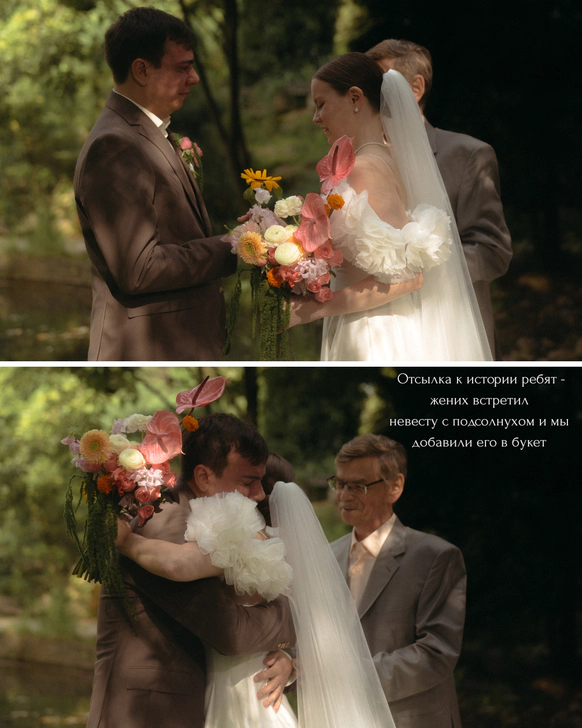 Как-то Таня прилетела к Ване на отдых, он встретил её с огромным подсолнухом. На церемонии сюрпризом для ребят мы обыграли этот момент, Ваня встречал Таню с подсолнухом на выездной, и подсолнух дополнил букет.