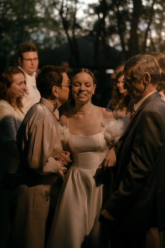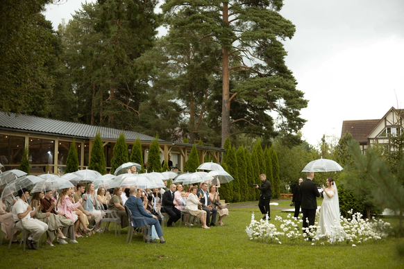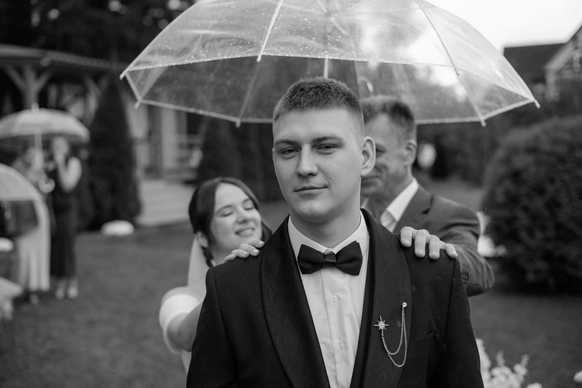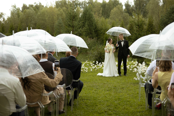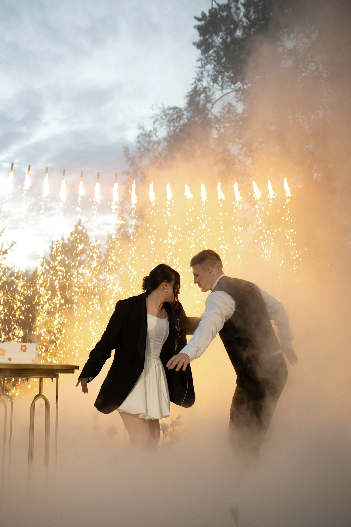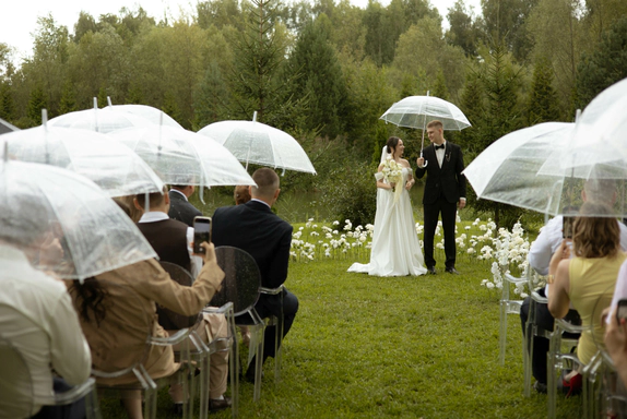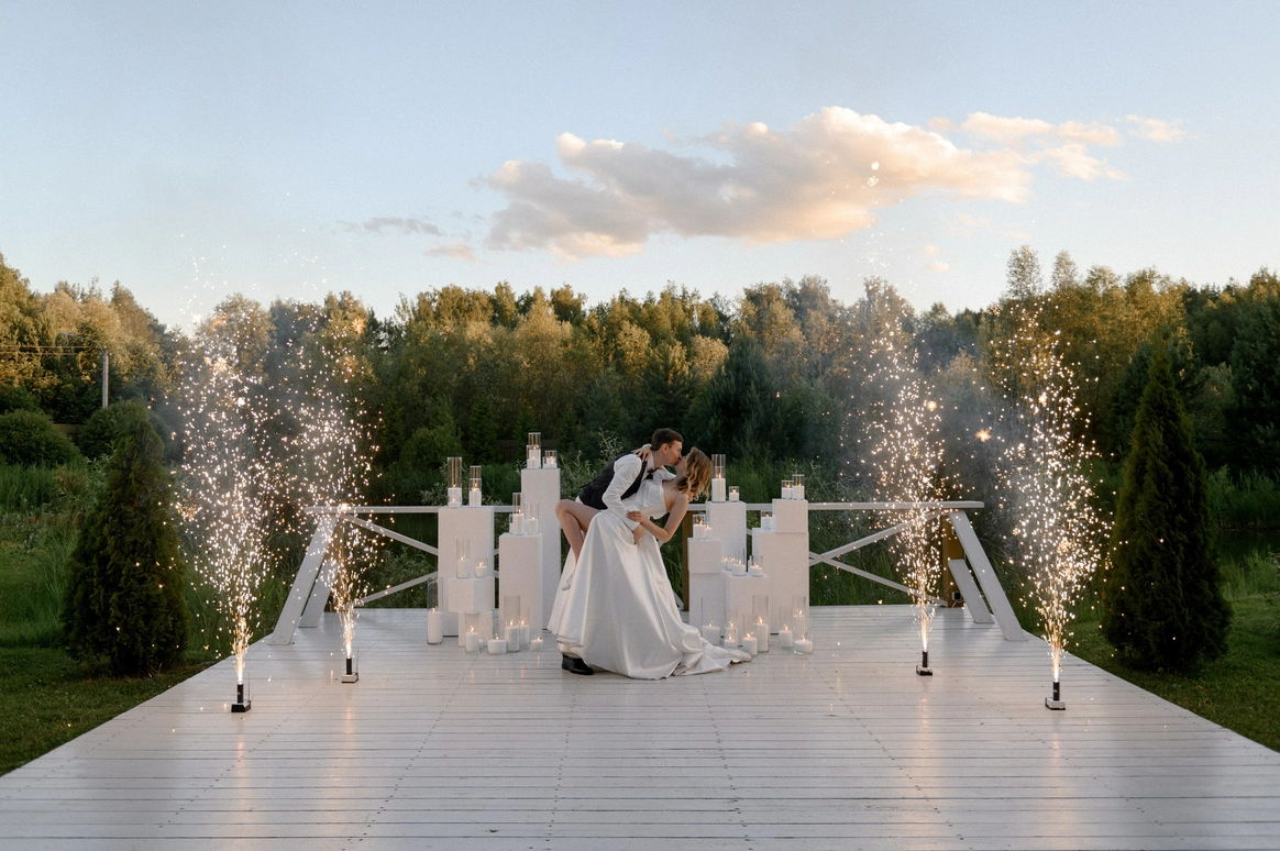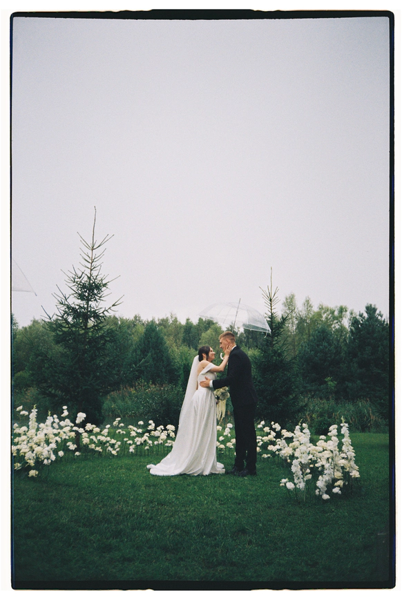 Несмотря на три ливня, мы смогли сохранить большую уличную программу и буквально ловили погодные окна между дождями: фотосессию на закате, переодевание платья, танец и подачу торта провели в короткие промежутки между ливнями