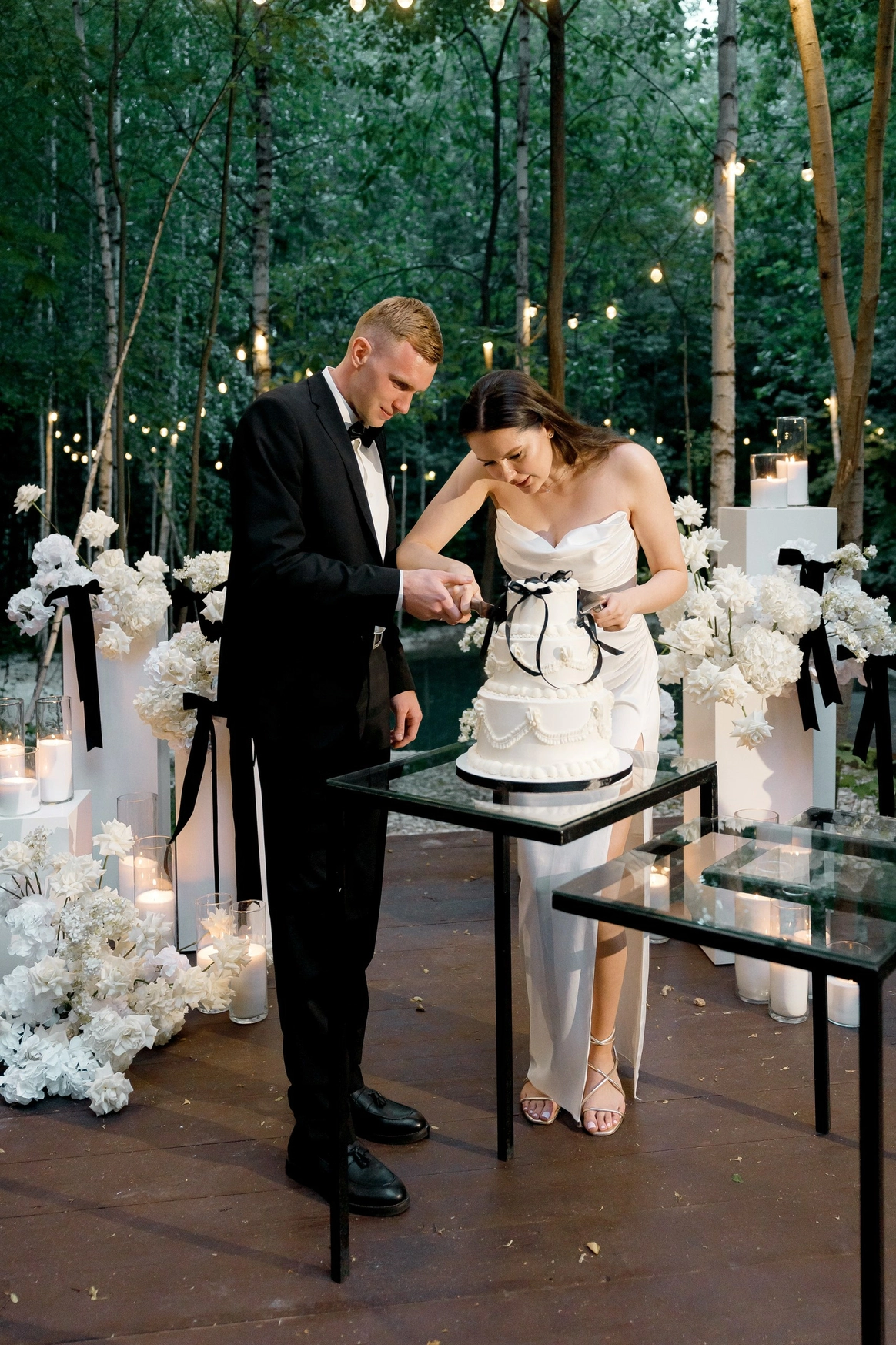 Отдельным вызовом стал свадебный торт, подрядчик был от пары: из-за неверного размера подложки, он не помещался в холодильник. Во время церемонии нашли решение - торт мы отвезли в ближайшее кафе с большим холодильником и позже вернули.