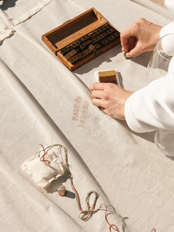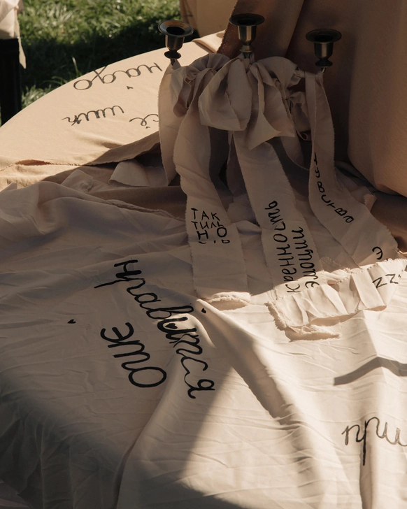 Лаундж-зона о создании свадьбы: от первого соприкосновения с нами, переписок и генерации идей, выбора материалов и форм, чтобы гости могли увидеть все шаги. Так же было важно дать возможность творчества для гостей, поэтому ключевой идеей было дать множество пространств, где они могут оставить послания с помощью вышивок - от скатерти до полотна, которое сейчас висит у пары на стене.