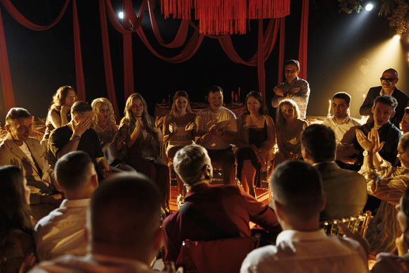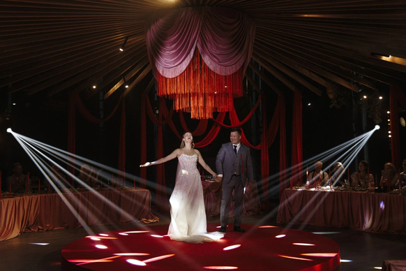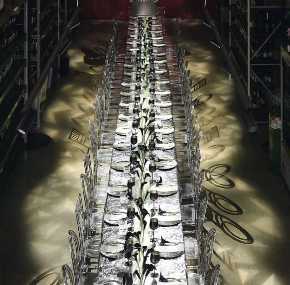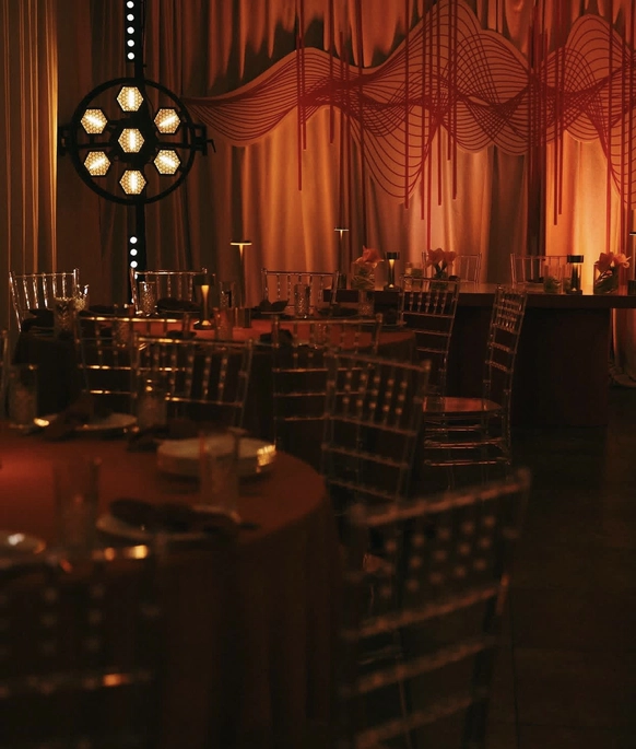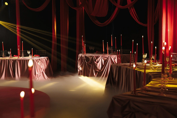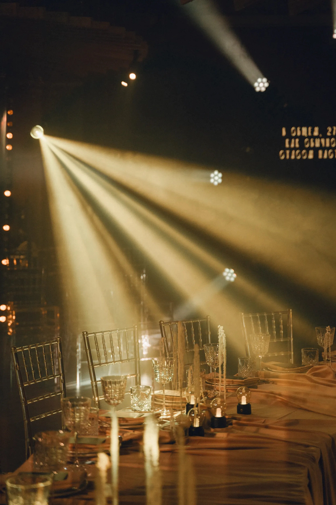 Все зелёные зоны и центральную люстру мы задрапировали ламбрекенами, а в центре зала расположили бархатный подиум для танцев и акустики. Сценография была реализована сегментированным экраном, который делал пространство глубже и интереснее за счёт контента, снятого в кинотеатре "Мираж". Ужин рошел в двух состояниях: