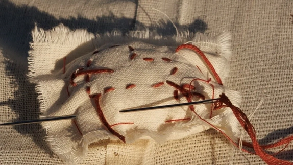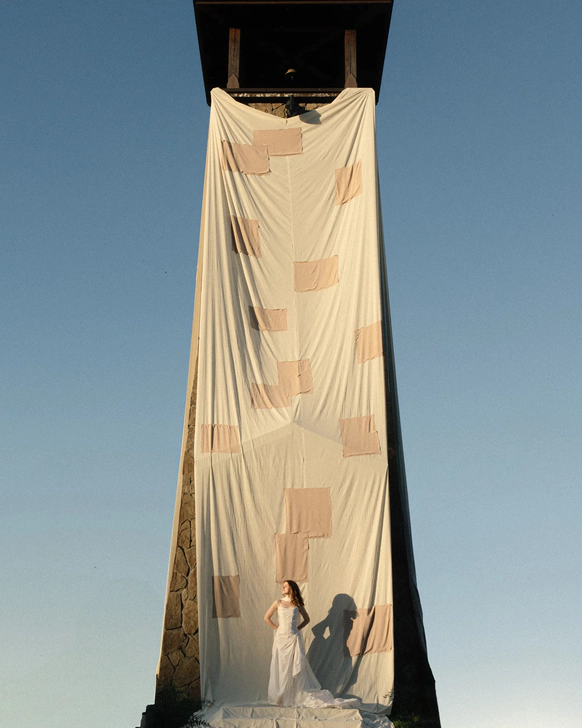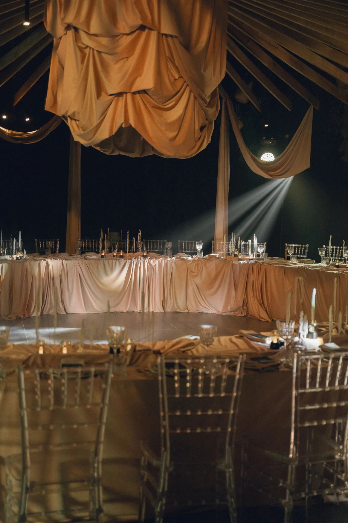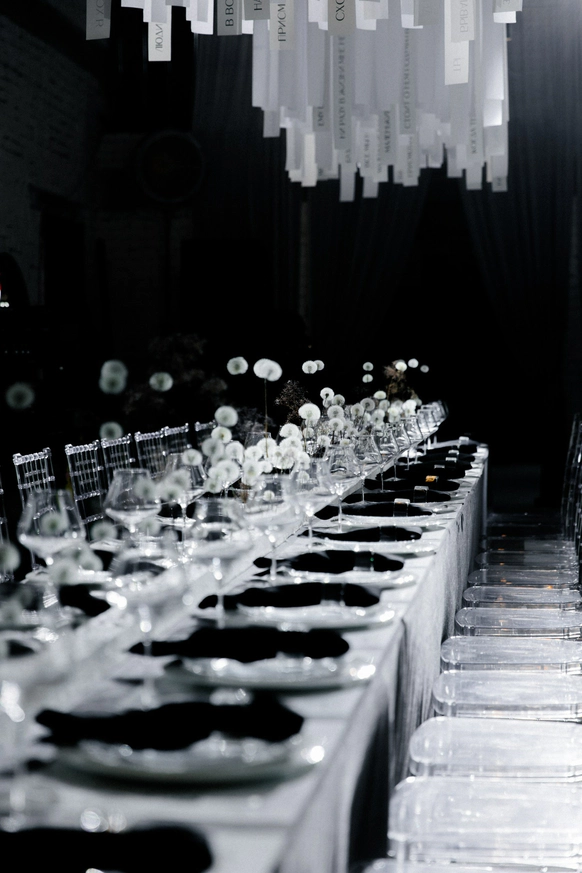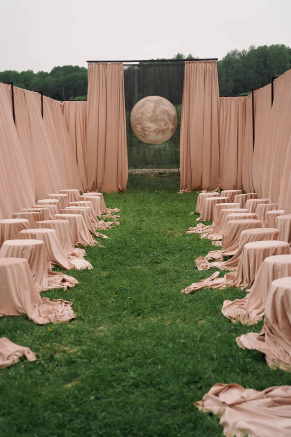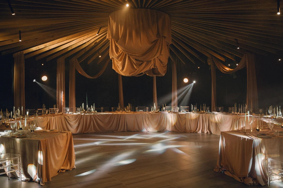 Ключевой объект вечера - башня на локации, задрапированная 280 метрами ткани, с обрезками ткани из мастерской невесты. Стол исполнили в виде ниточки и иголочки, с аналогичными церемонии текстильными вставками и рассадкой, проштампованной прямо на ткани.