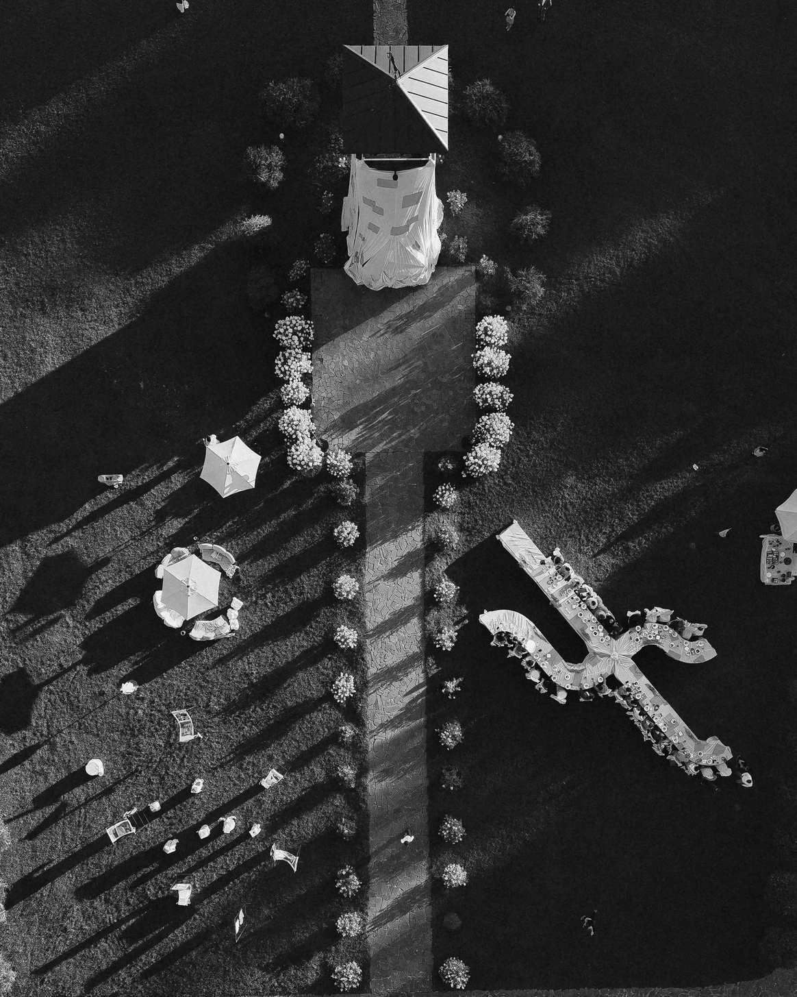 Изготовление уникального аэростата формате воздушного шарика и монтаж большой шахматной доски украсили зону церемонии. Уже знакомый вам зал мы снова пересмотрели с помощью блэкаута и акцентных полотен. Рассадка представляла собой сегментированный круг, разделённый на 4 гостевых стола и президиум.