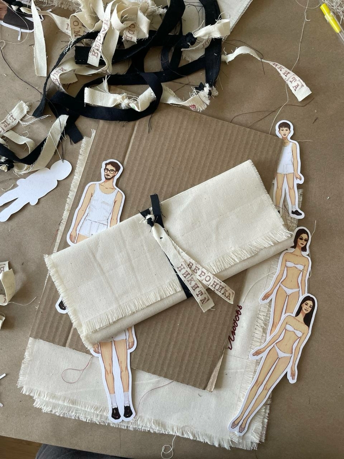 Вручную созданные текстильные приглашения с образцами дресс-кода и отрисованные художницей образы гостей по мотивам тех самых куколок, которые так вдохновляли в модных журналах.