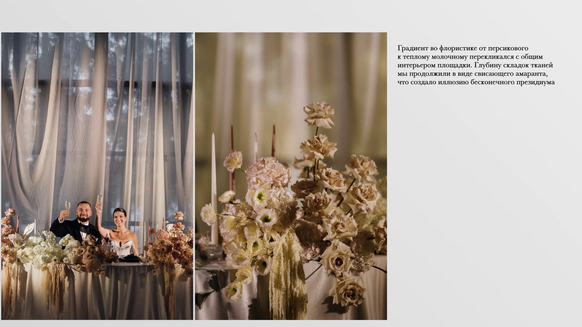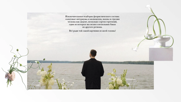 Flora Decora - симбиоз мастерства, видения декоратора и натуры невесты, её вовлечённости в процесс создания декора. Пять лет назад я шагнула из салонной флористики в эту индустрию, чтобы от цветочных композиций перейти к созданию пространств, где эстетика встречается с эмоциями. Для меня каждый стебель, каждый бутон – живой, со своим характером. Вместе с командой мы ищем баланс природной гармонии и безупречного вкуса: хрупкость цветов и мощь бетона, нежность лепестков и глубина бархата. Потому что наши проекты – это не просто декор, а живые эмоции, история и дыхание природы. Мы не оформляем залы — мы создаем атмосферу, в которой история пары или бренда звучит громче слов. И отвечаем за все пространство целиком: сложную колористику, безупречные фактуры и своевременную реализацию. Публикации - журнал Цветы, Weddywood. Обучение у отраслевых лидеров: Floral Style, SWS, Лены Романовой, Ирины Волковой.