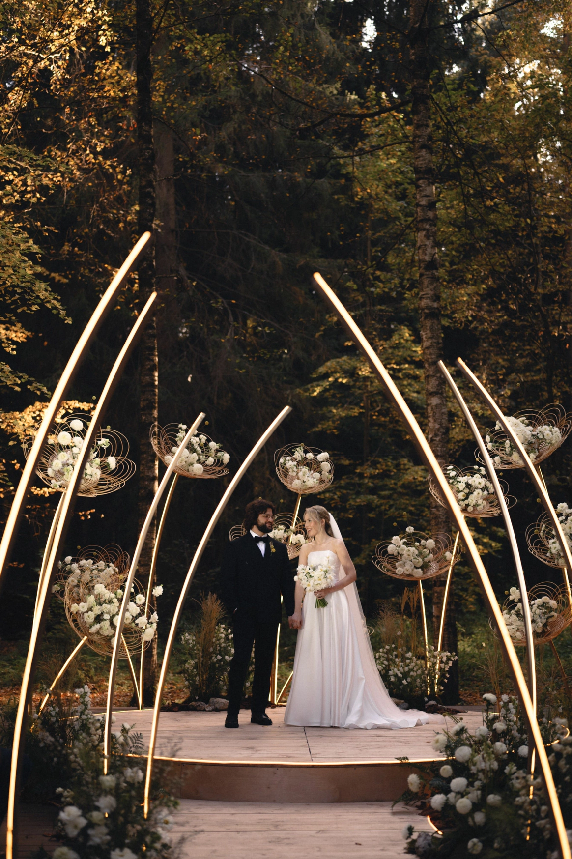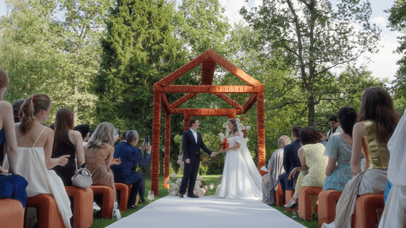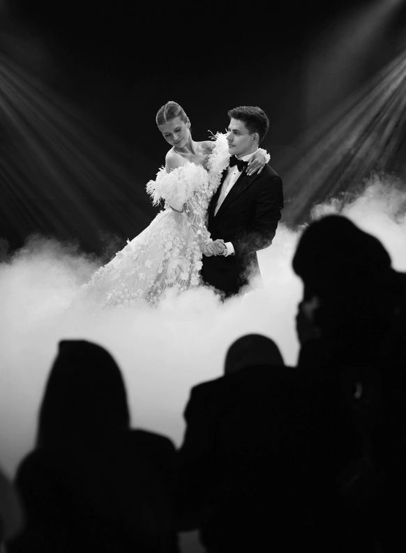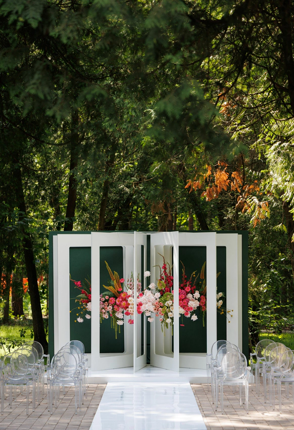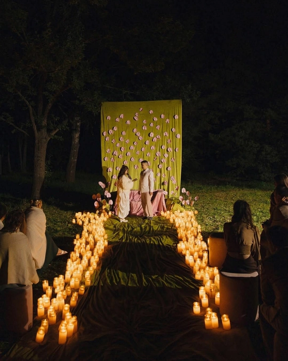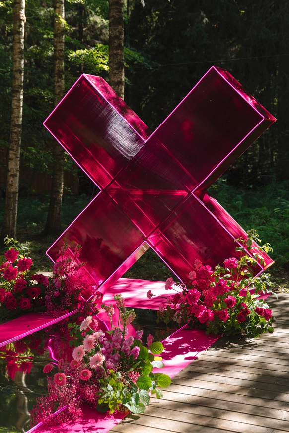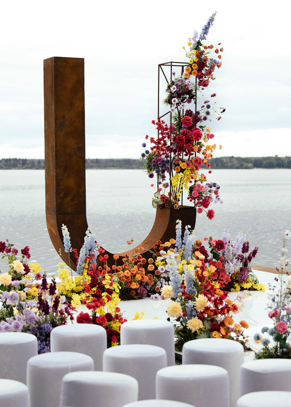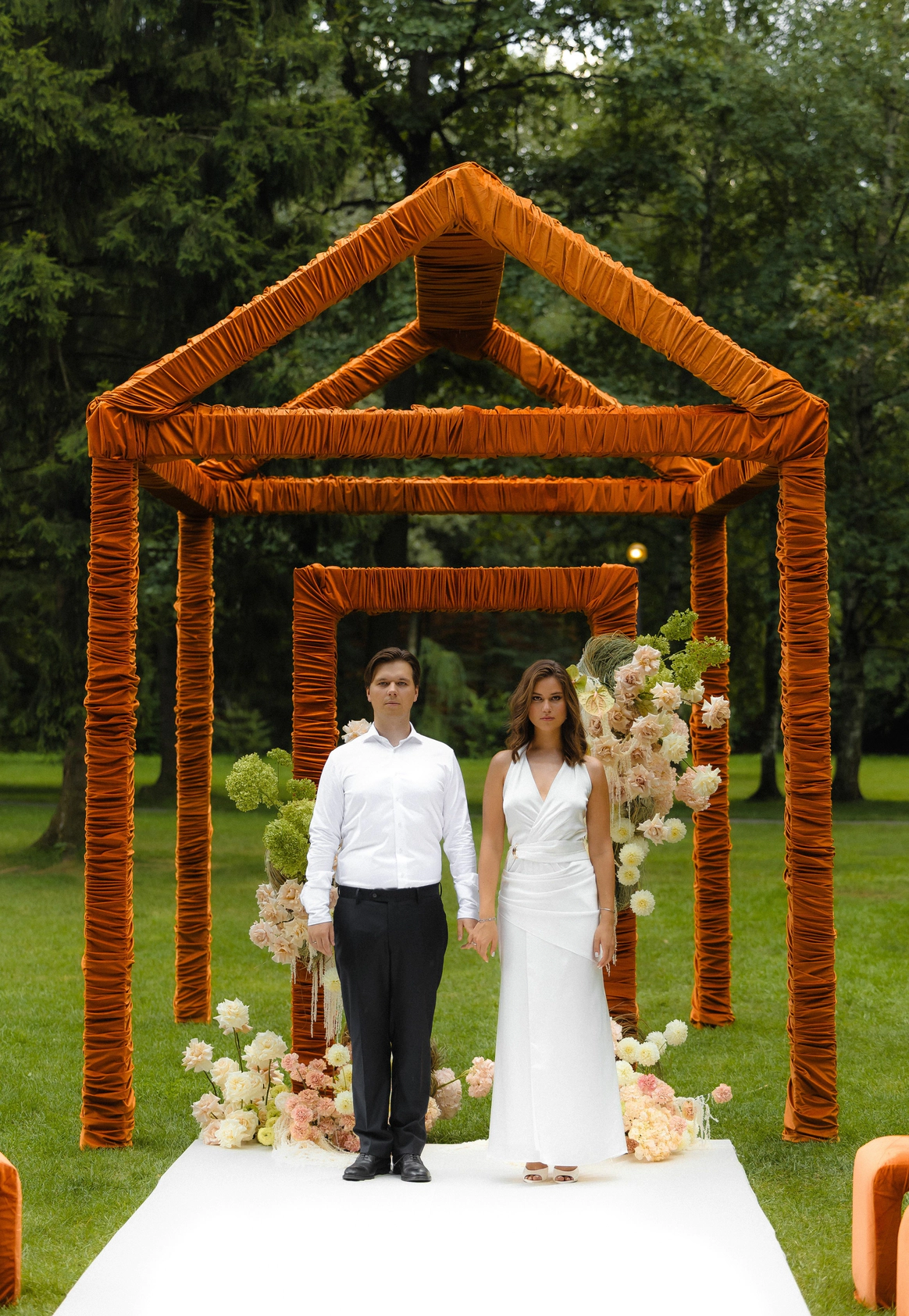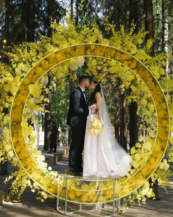 Пространство выстроено как путь: две линии сходятся в центре, где пара встречается лицом к лицу. Арка работает как портал - переход из «до» в «мы». Гости окружают этот момент, становясь свидетелями рождения семьи.