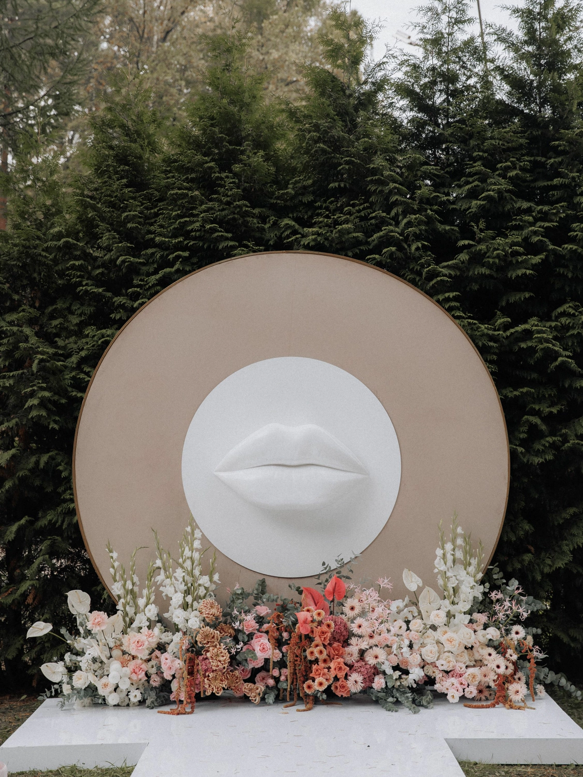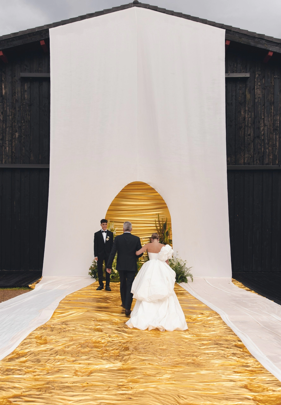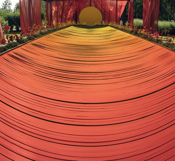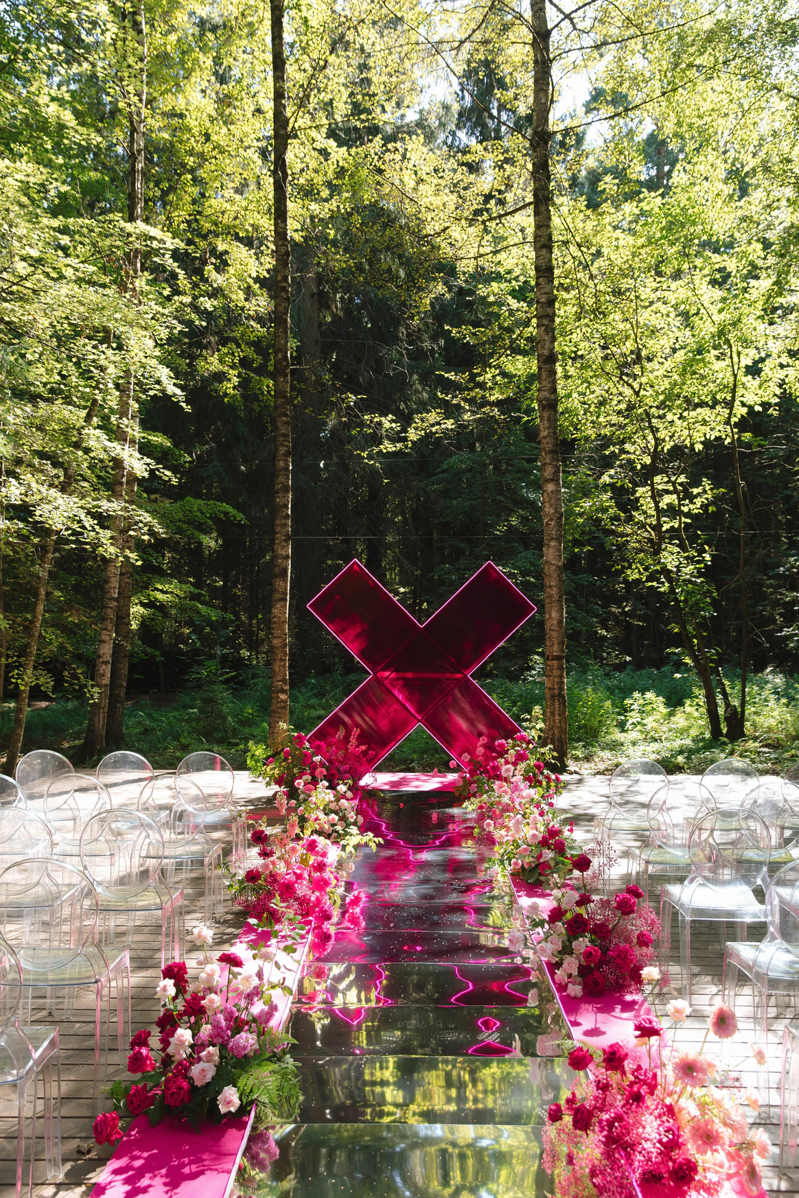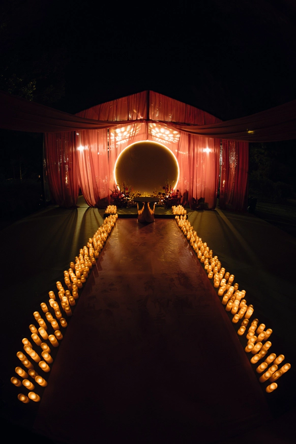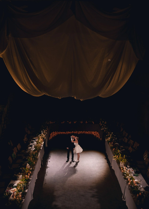 Пространство выстроено как путь: две линии сходятся в центре, где пара встречается лицом к лицу. Арка работает как портал - переход из «до» в «мы». Гости окружают этот момент, становясь свидетелями рождения семьи.
