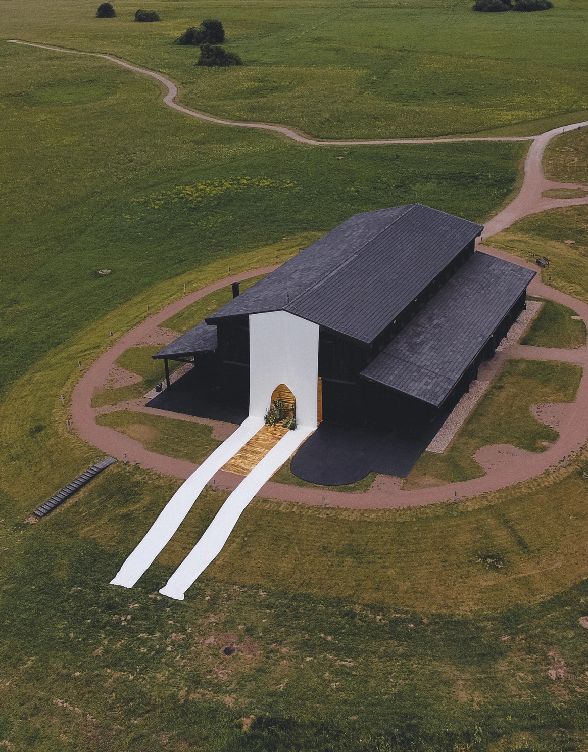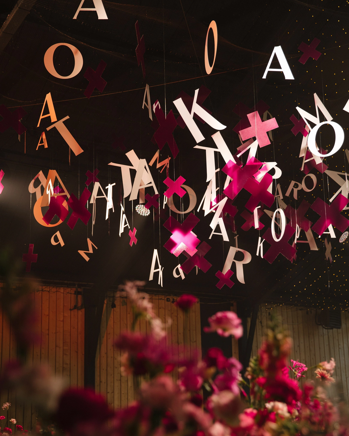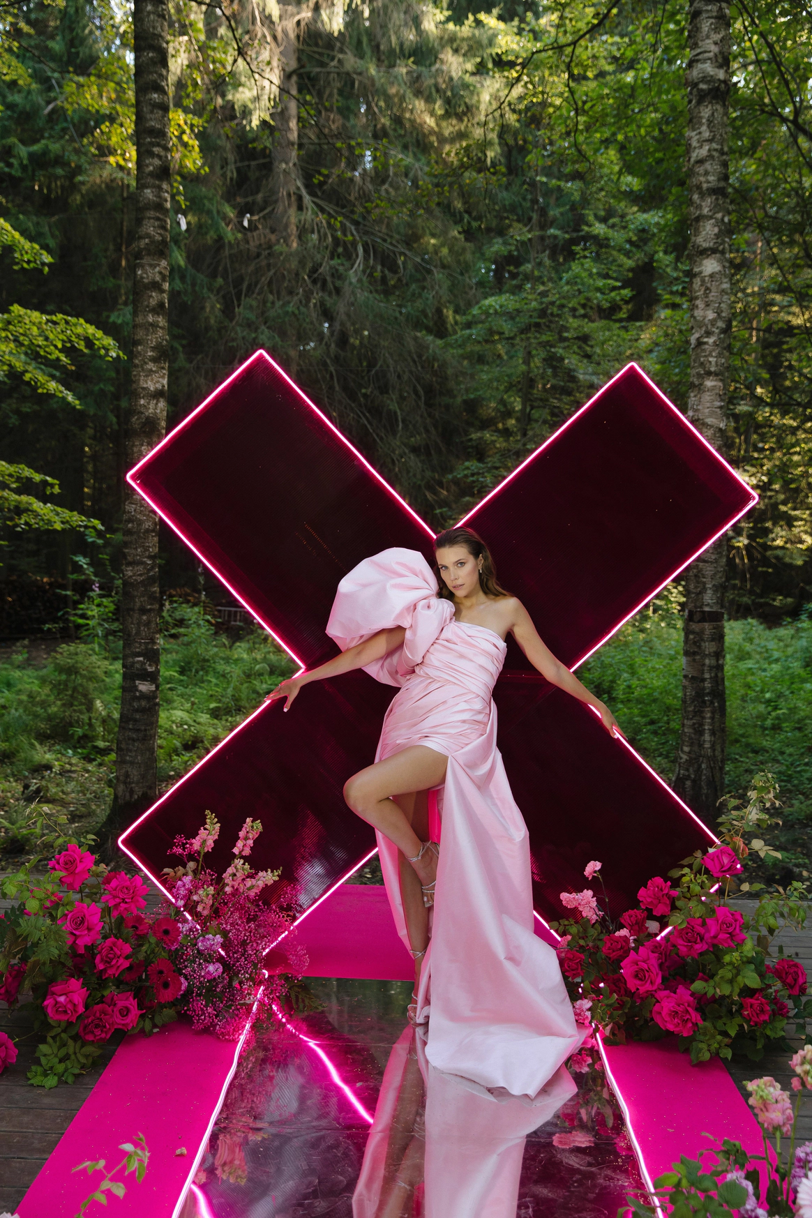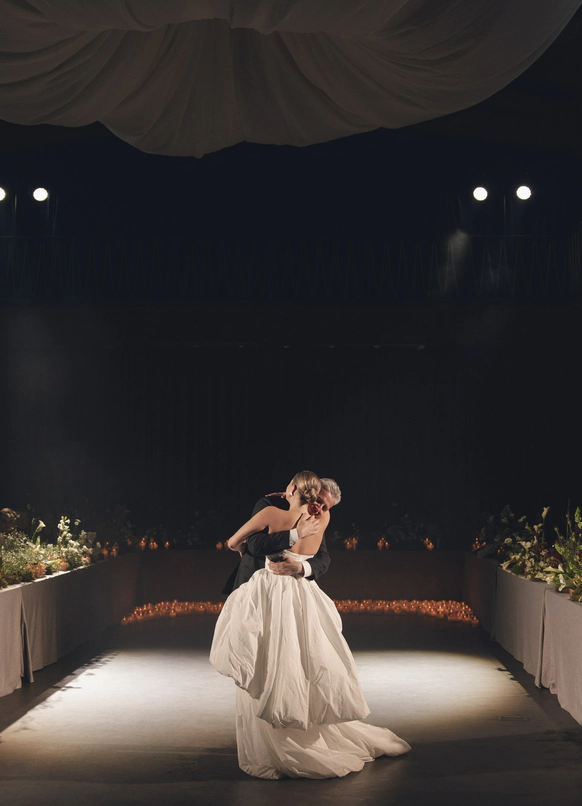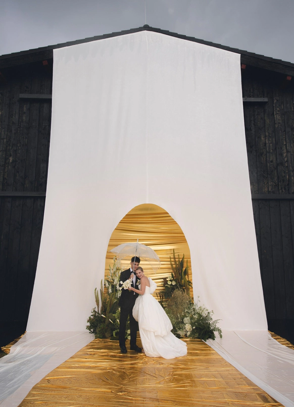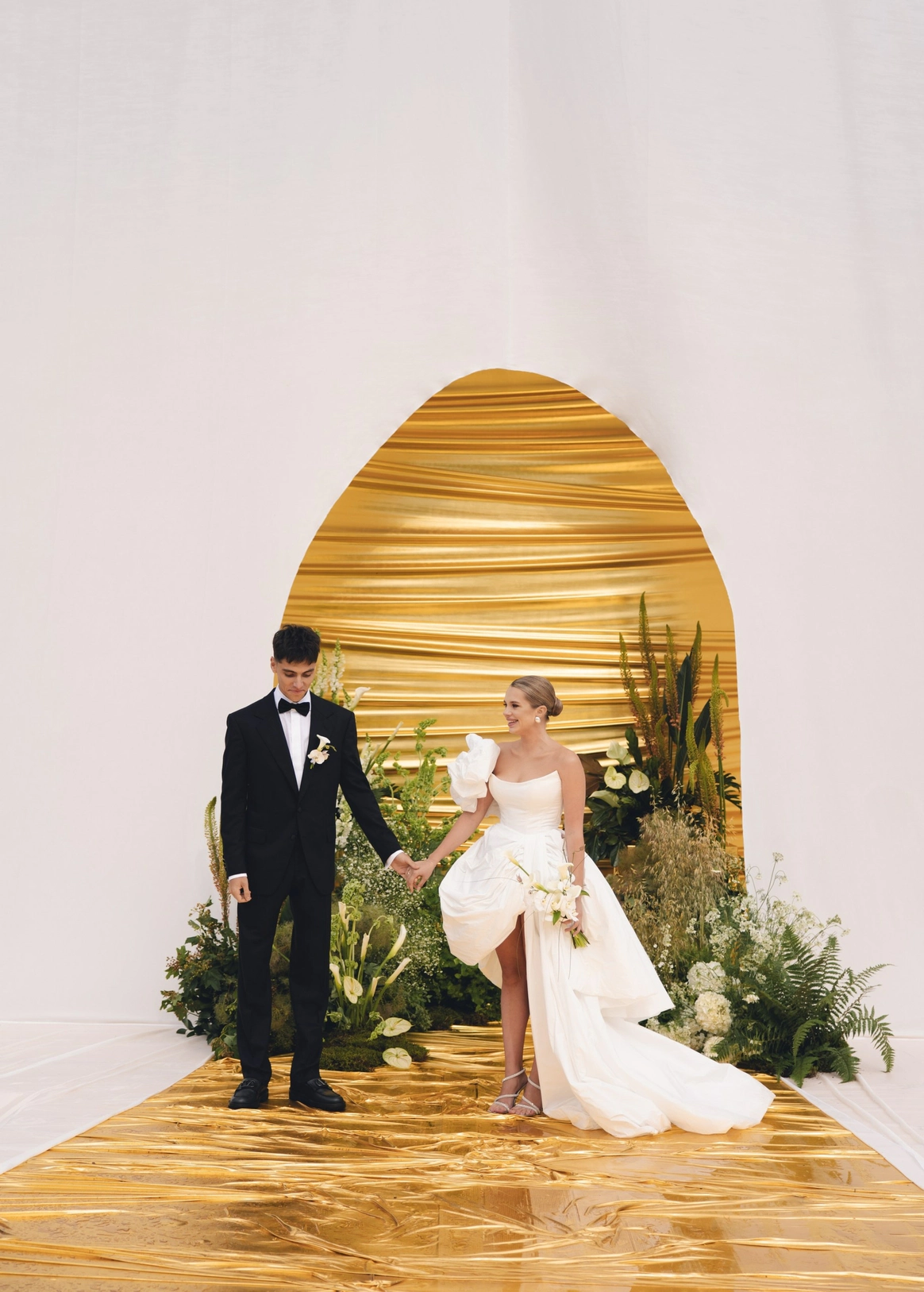 Пространство выстроено как путь: две линии сходятся в центре, где пара встречается лицом к лицу. Арка работает как портал - переход из «до» в «мы». Гости окружают этот момент, становясь свидетелями рождения семьи.