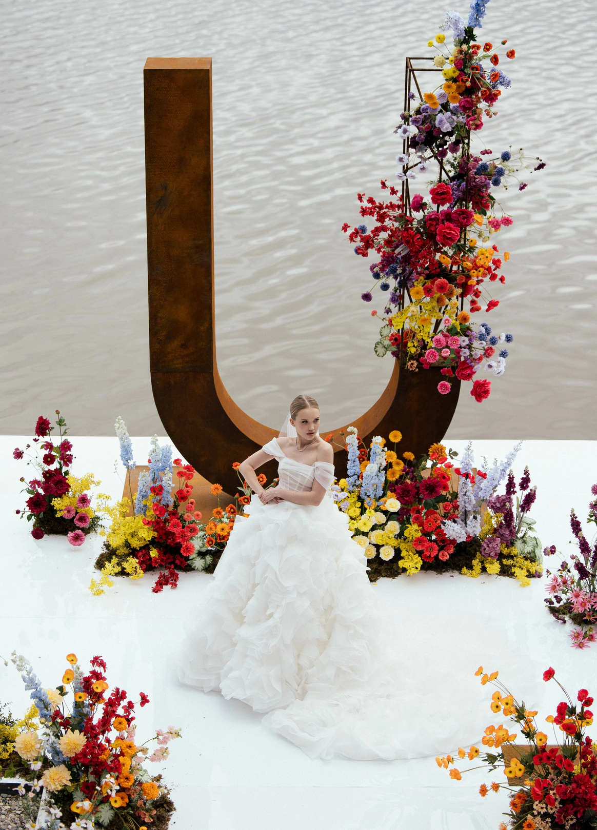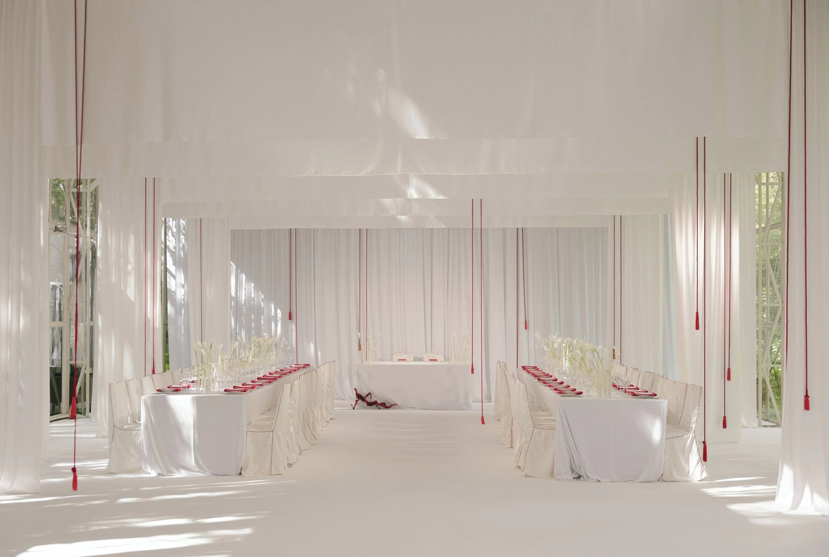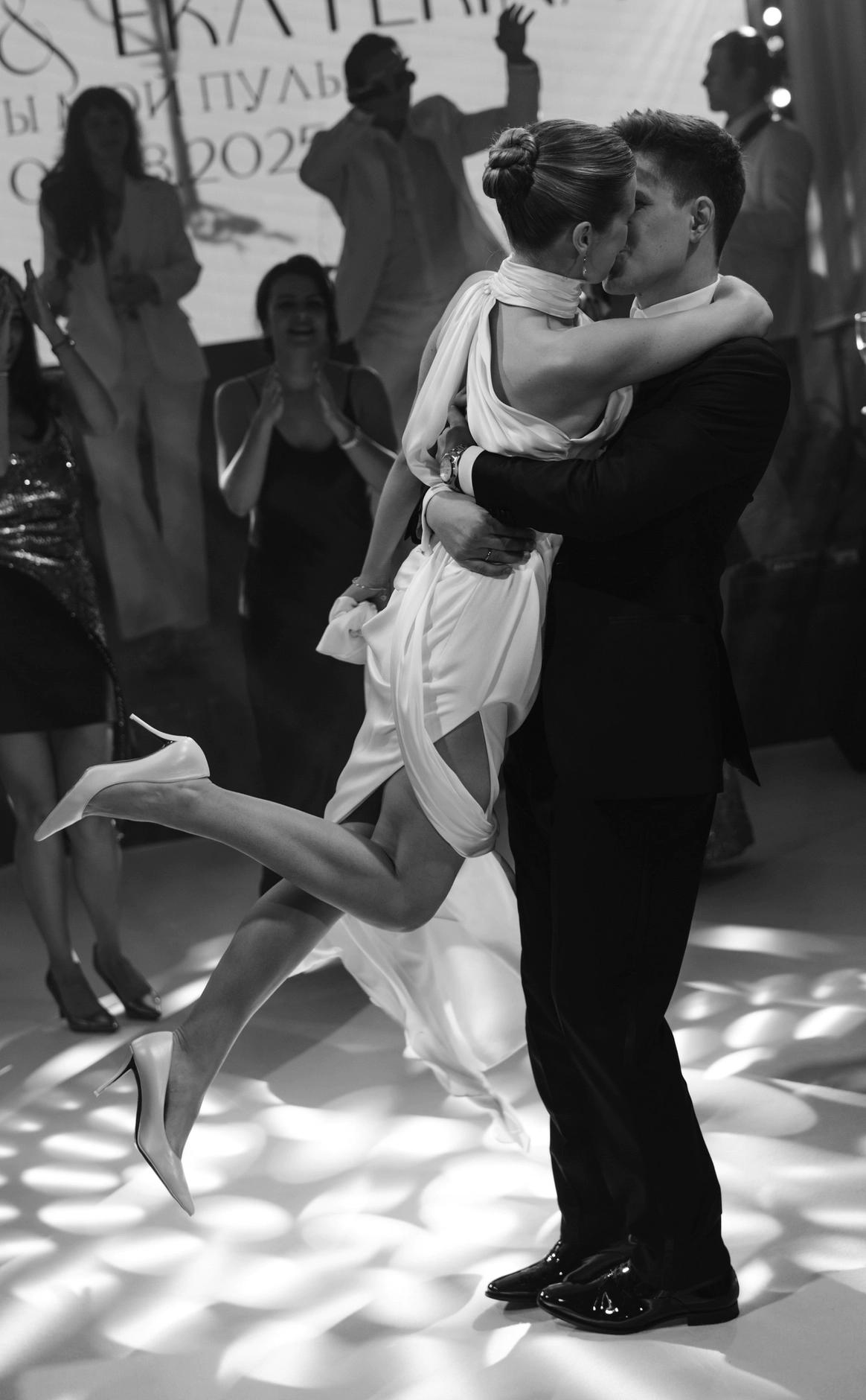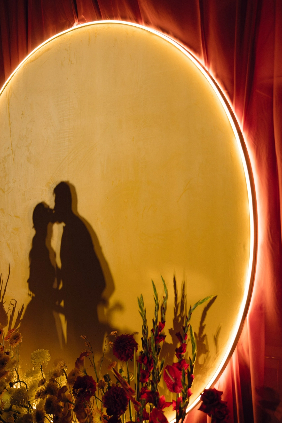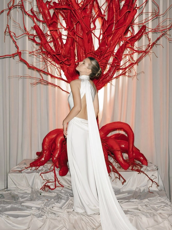 Пространство выстроено как путь: две линии сходятся в центре, где пара встречается лицом к лицу. Арка работает как портал - переход из «до» в «мы». Гости окружают этот момент, становясь свидетелями рождения семьи.