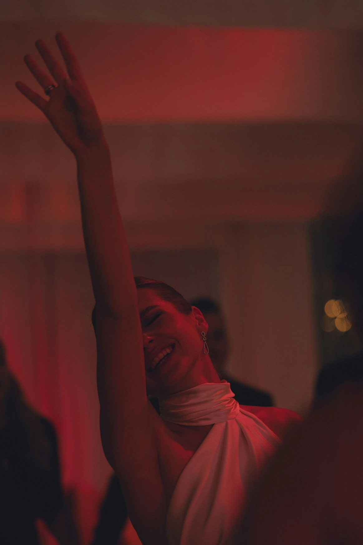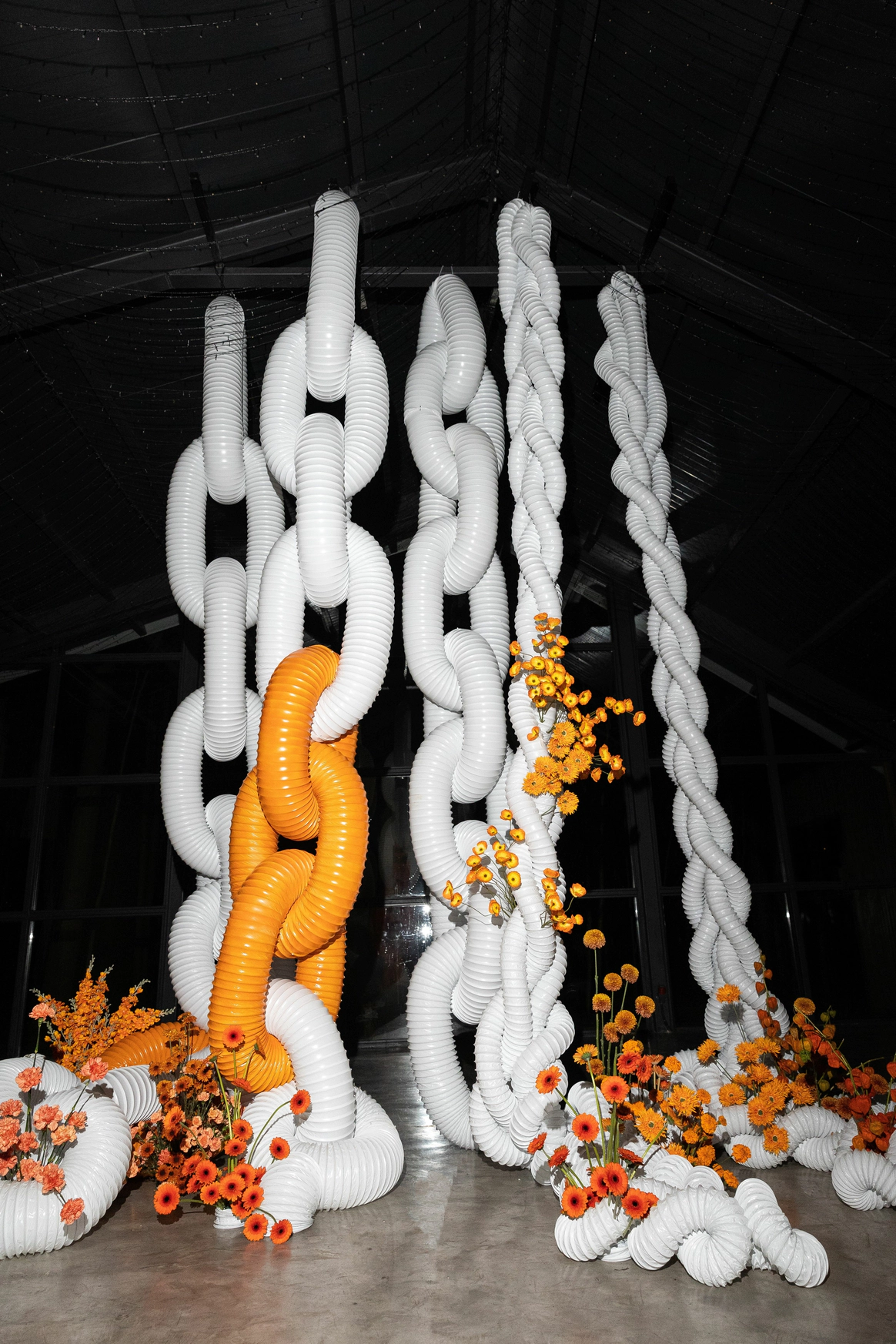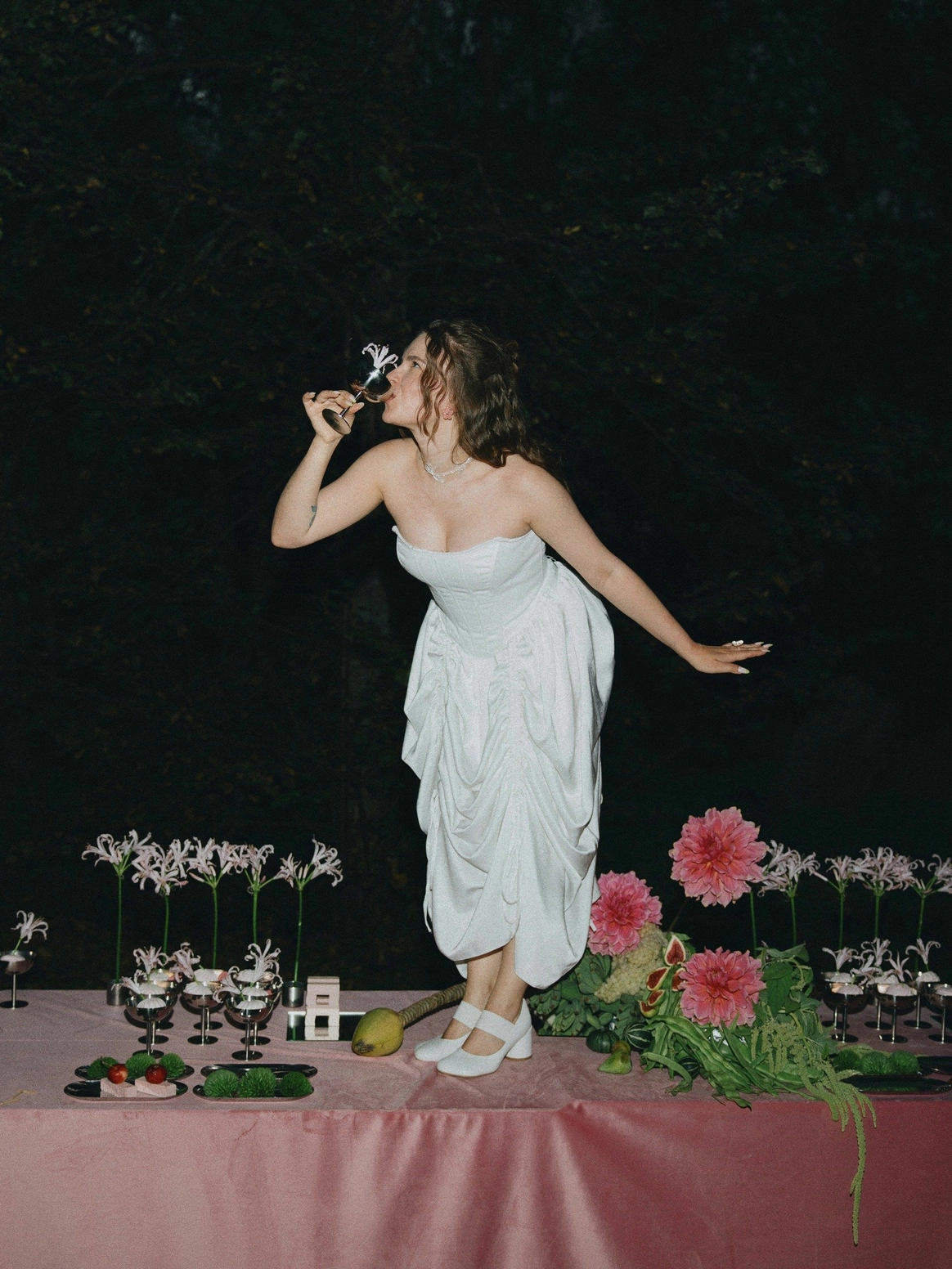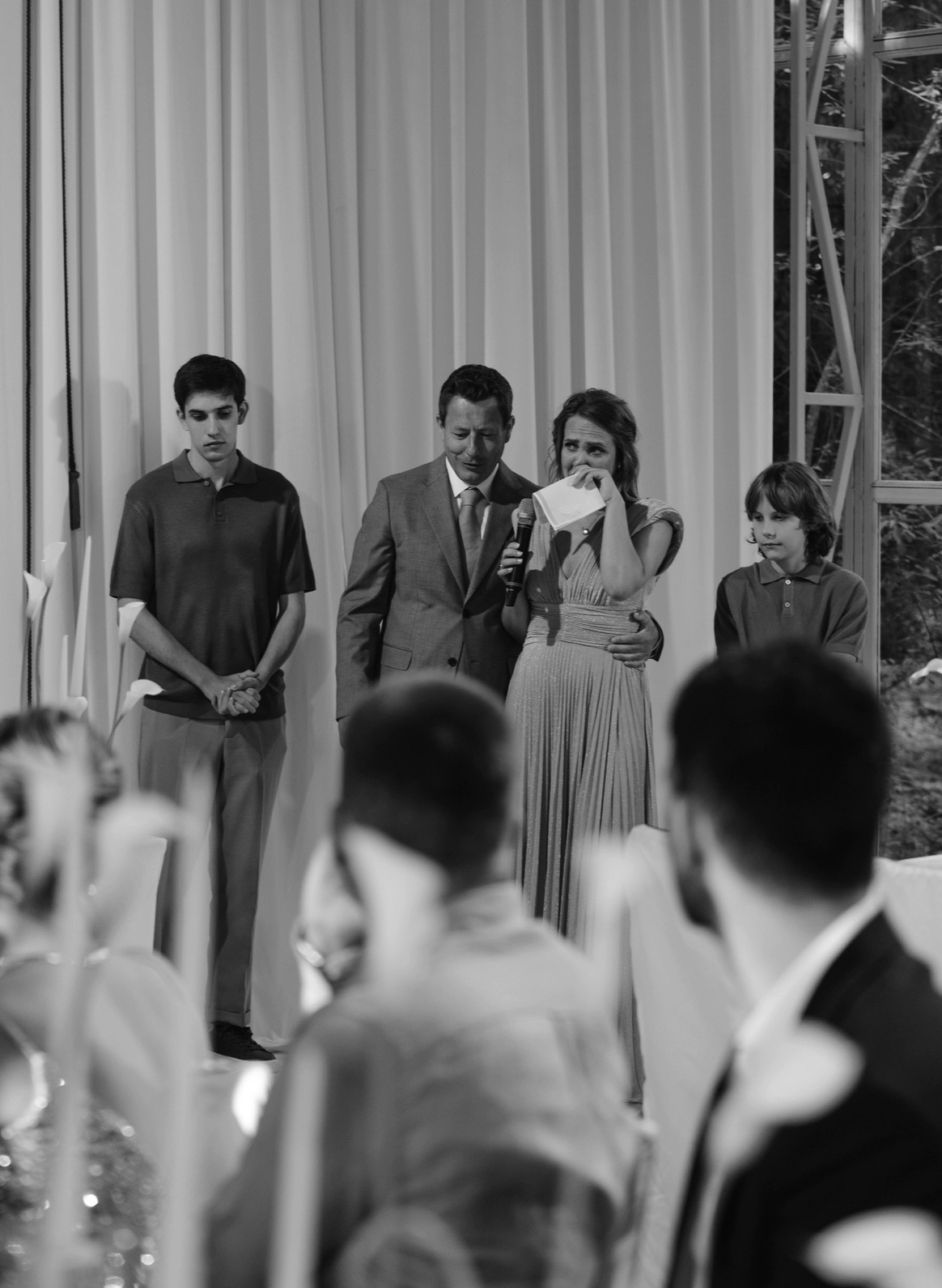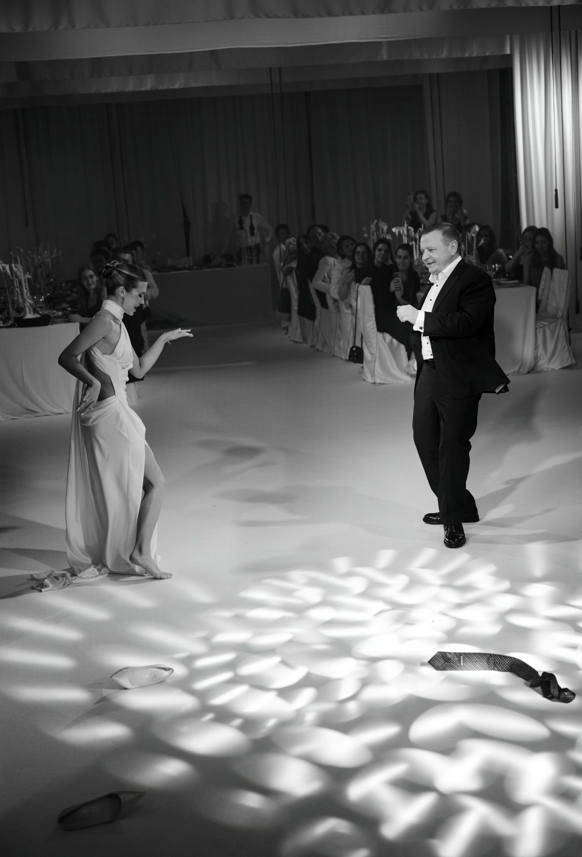 Пространство выстроено как путь: две линии сходятся в центре, где пара встречается лицом к лицу. Арка работает как портал - переход из «до» в «мы». Гости окружают этот момент, становясь свидетелями рождения семьи.