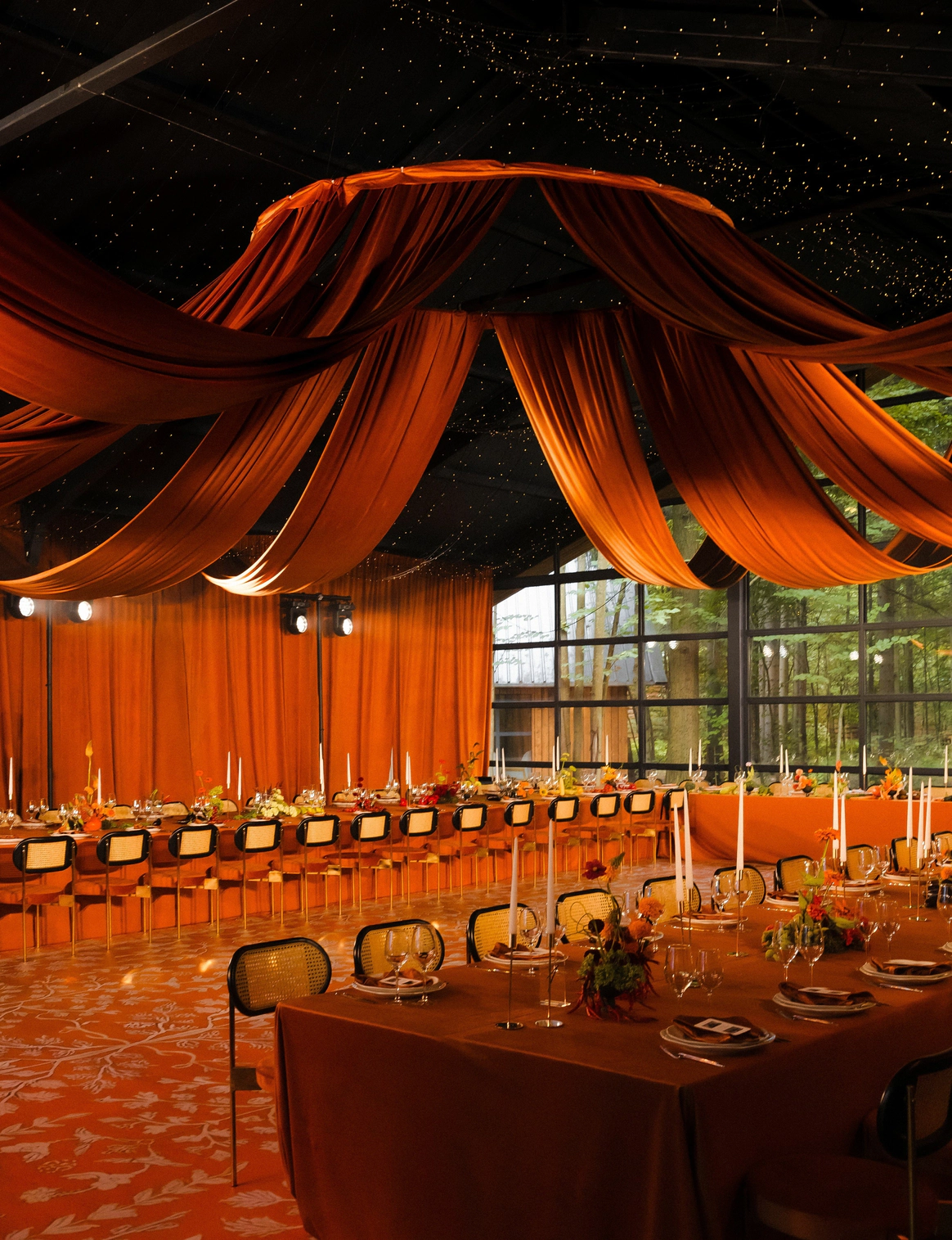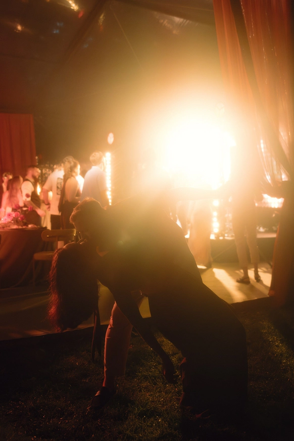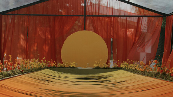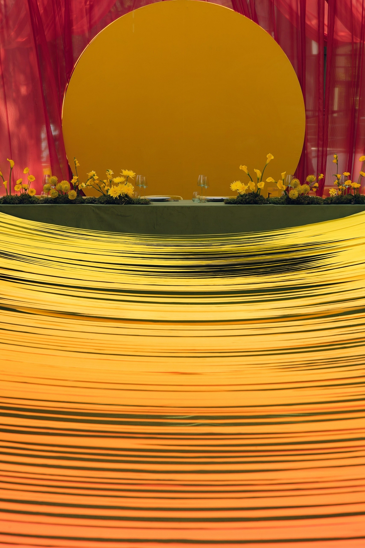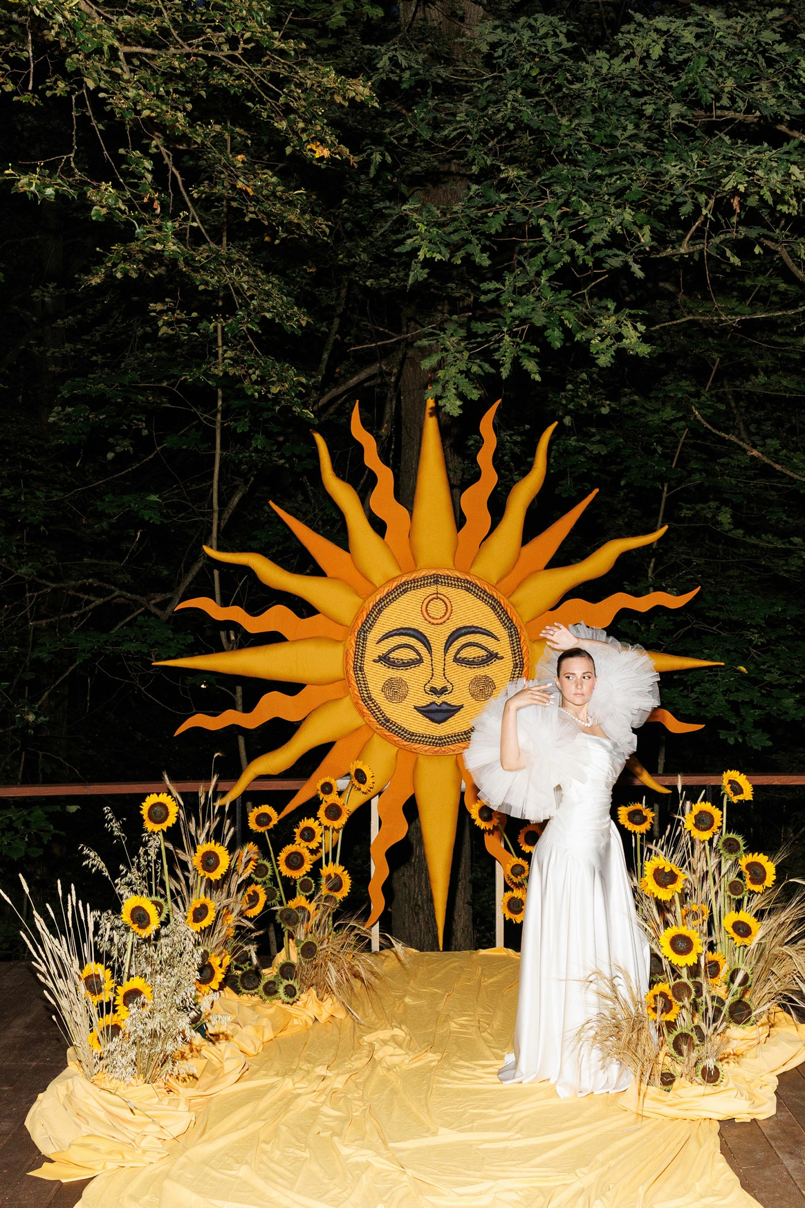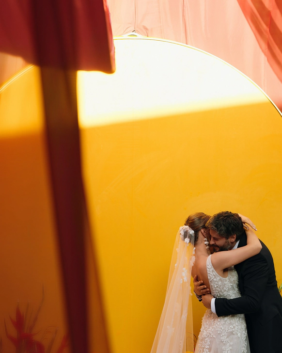 В основе концепции — рассвет как символ начала. Пространство выстраивалось через свет: от мягкого жёлтого к насыщенному оранжевому, как постепенное пробуждение дня и чувств. Солнце стало центральным элементом свадьбы — одновременно зоной церемонии и президиумом, объединяя сакральное и праздничное в одной точке. Именно здесь соединялись клятвы, взгляды и энергия гостей.