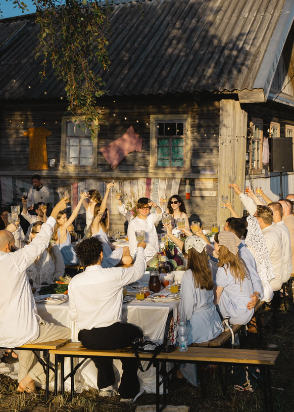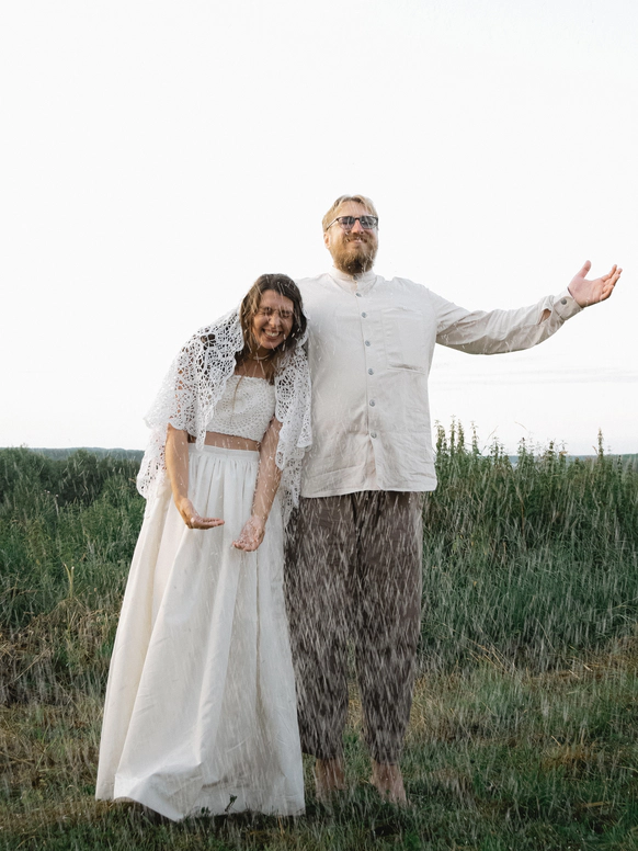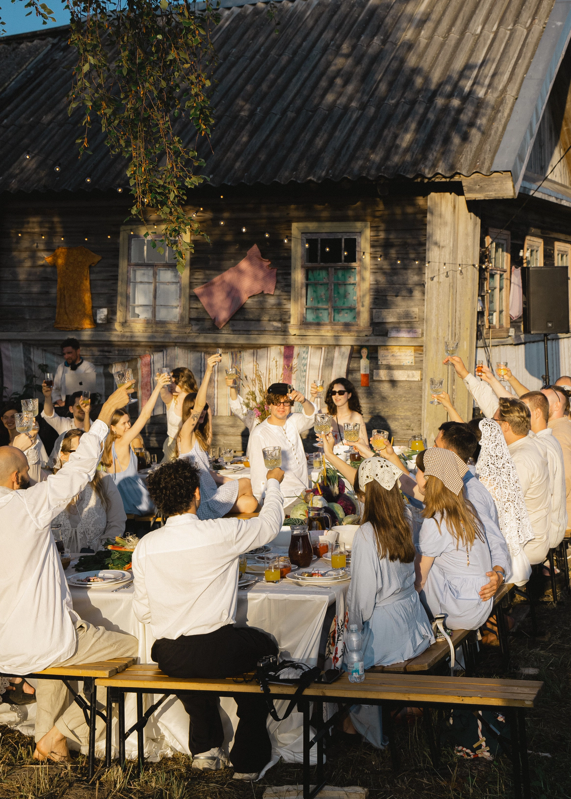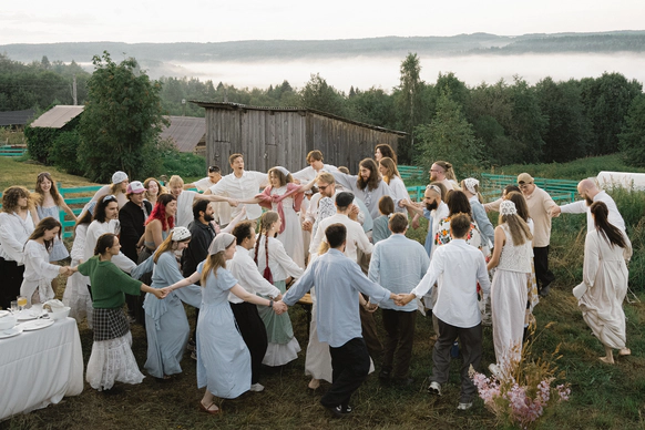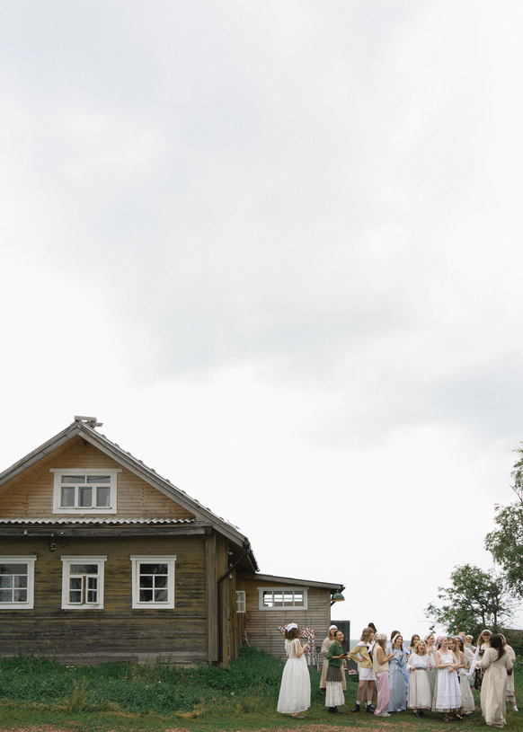 Свадьба, рождённая из любви к традициям и природе. Мы создали фольклорный праздник — современный, живой, наполненный исконным смыслом. Размещение гостей в домах глухой деревни, банные девичник и мальчишник, программа, объединяющая народный фольклор и светские традиции.