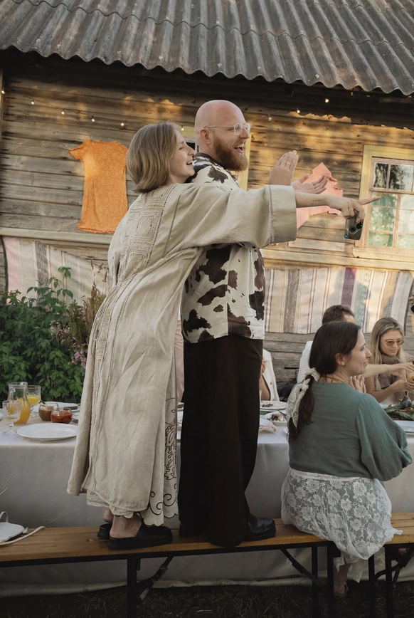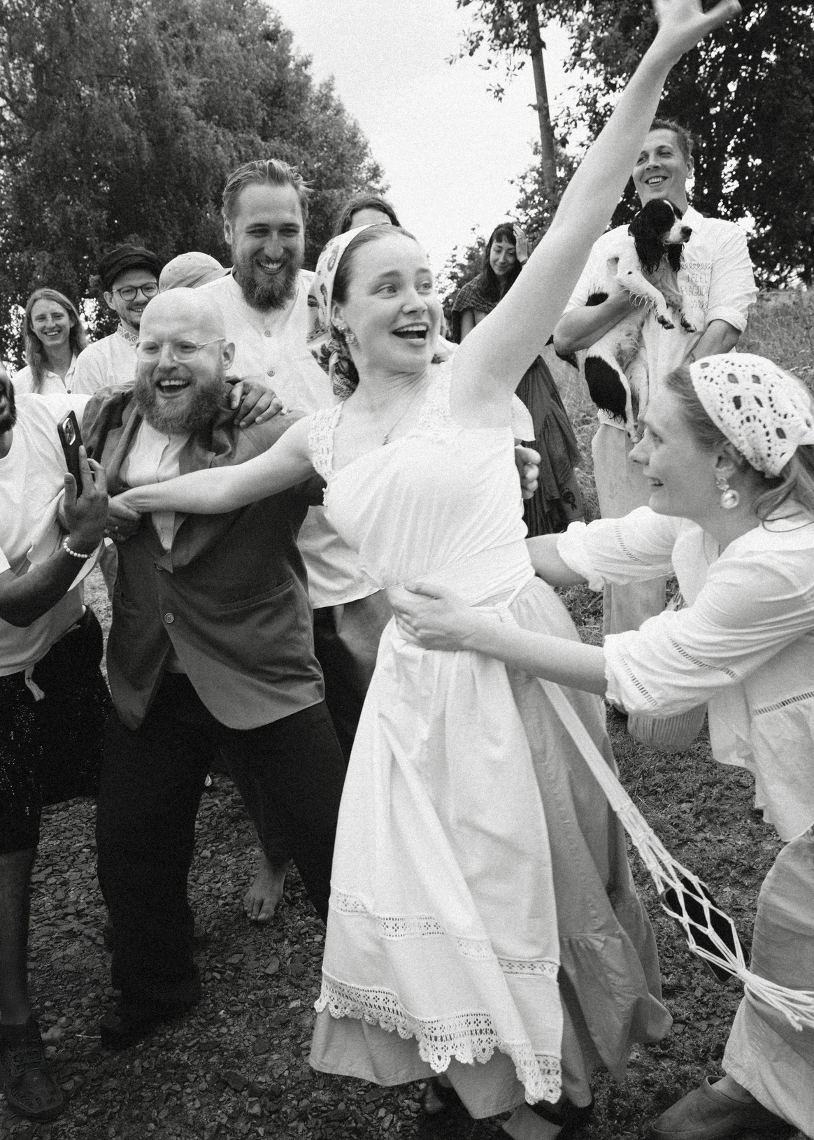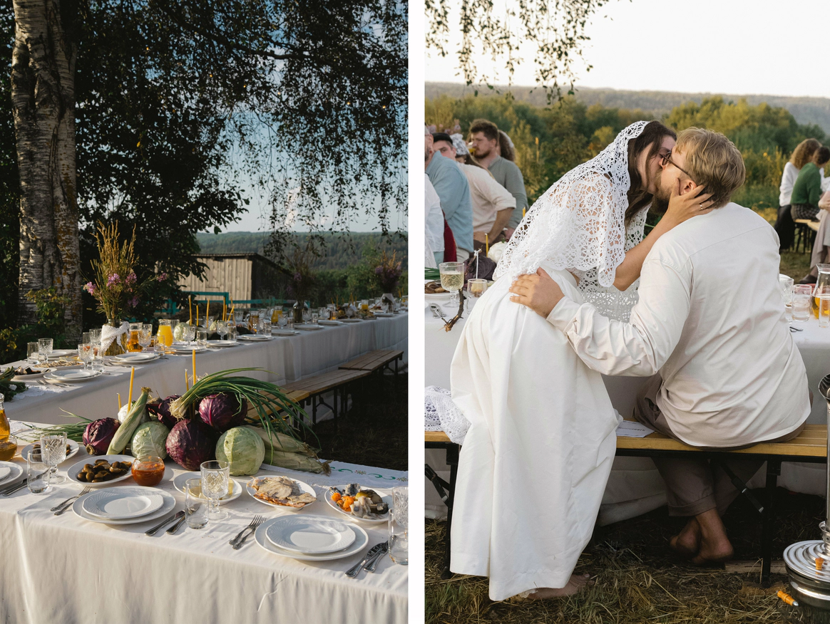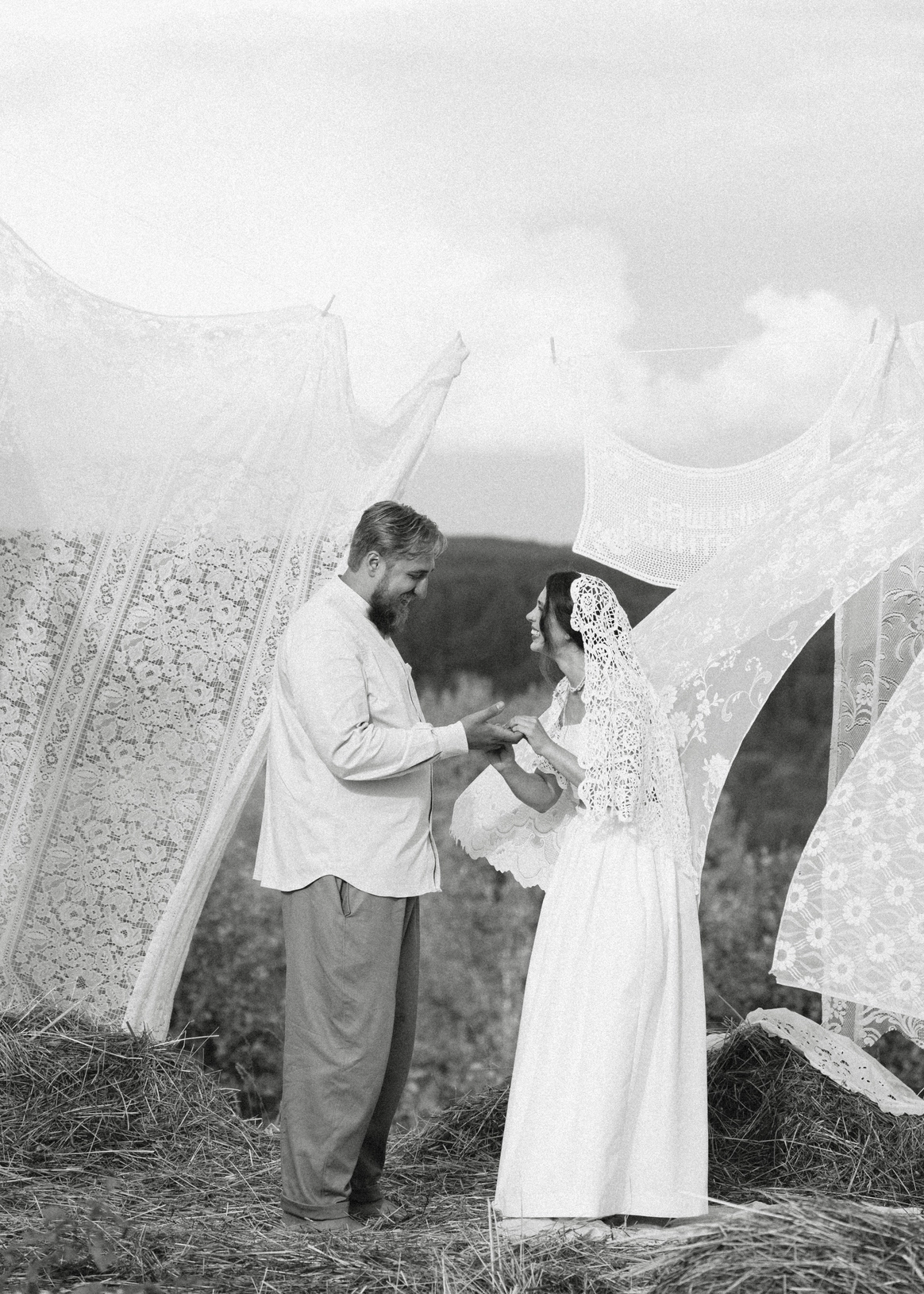 Свадьба, рождённая из любви к традициям и природе. Мы создали фольклорный праздник — современный, живой, наполненный исконным смыслом. Размещение гостей в домах глухой деревни, банные девичник и мальчишник, программа, объединяющая народный фольклор и светские традиции.