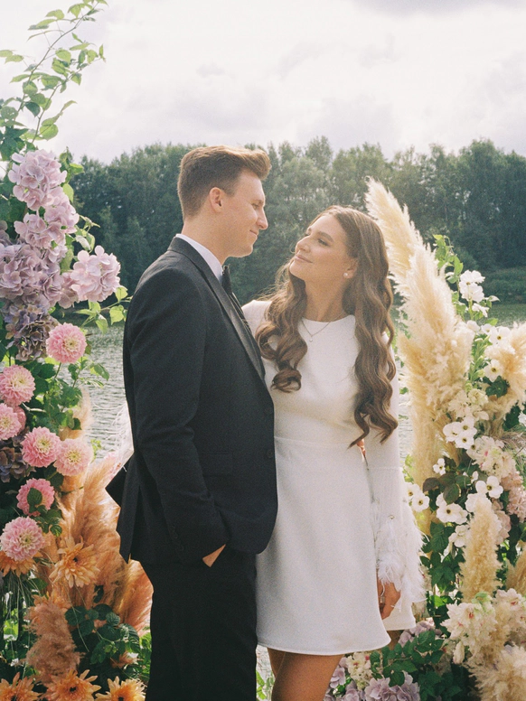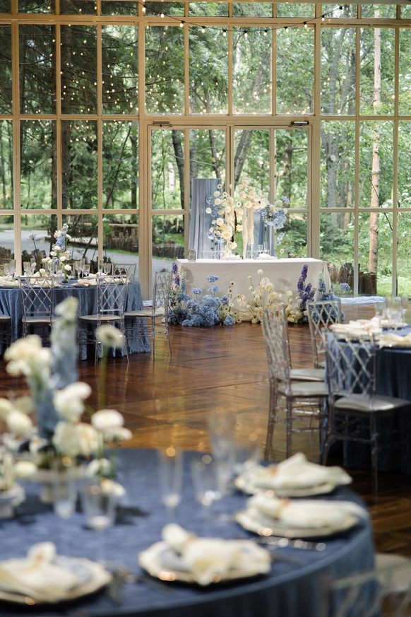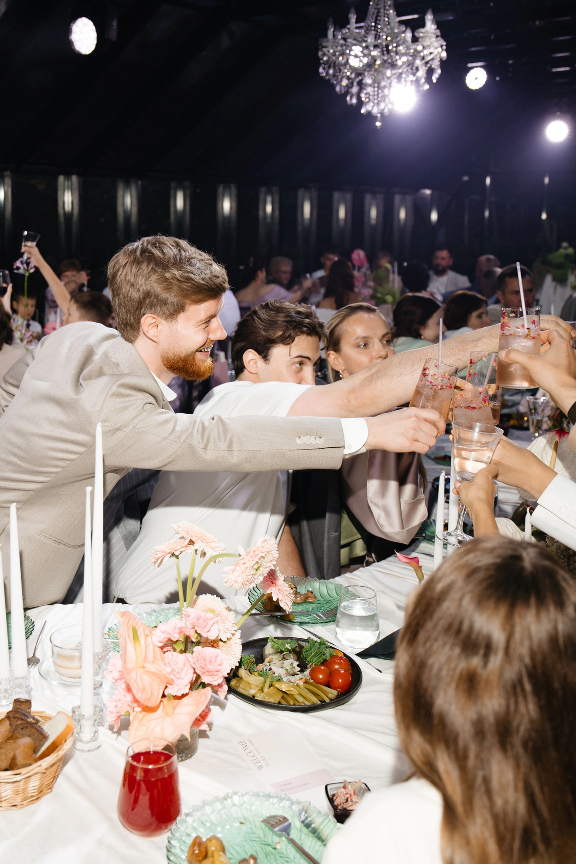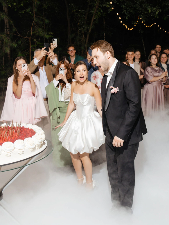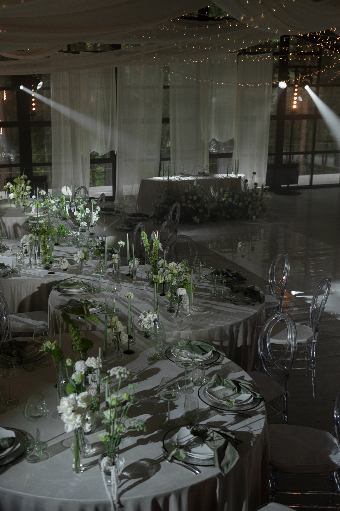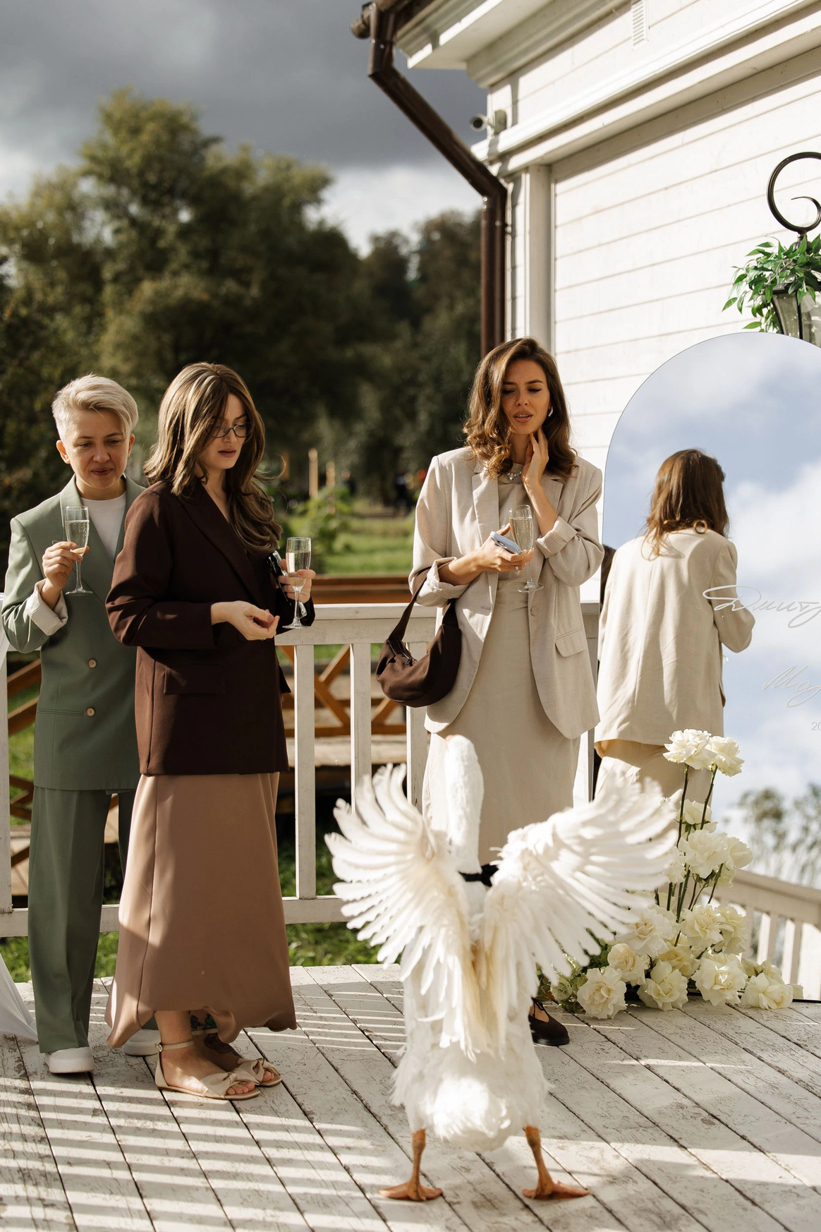 Мы нашли площадку, где всё сошлось идеально: загородные дома для размещения гостей, банкетный зал и живописная территория для выездной регистрации. При этом церемония была официальной — очень удобное решение для такой концепции.
