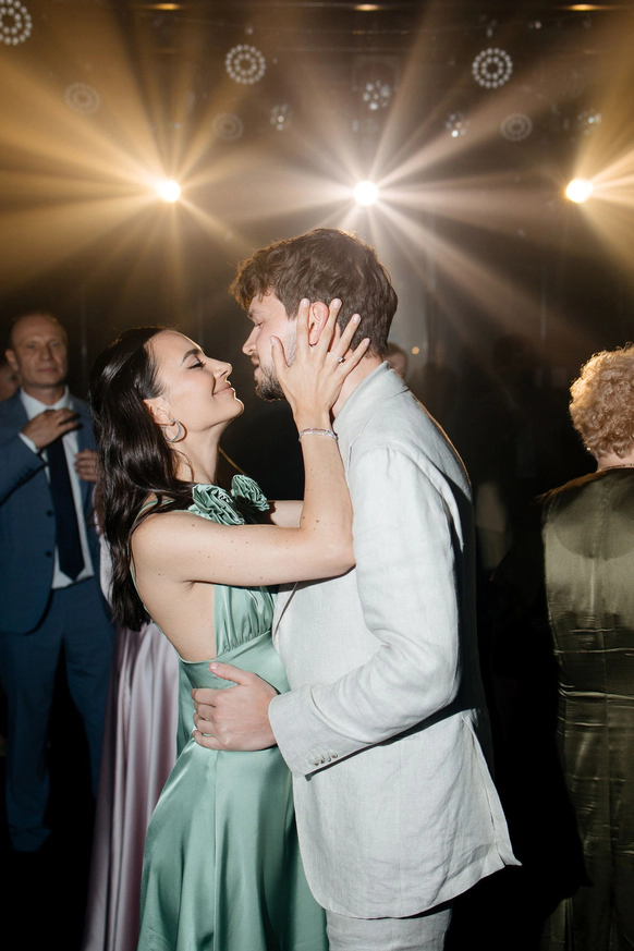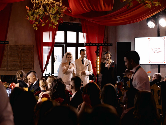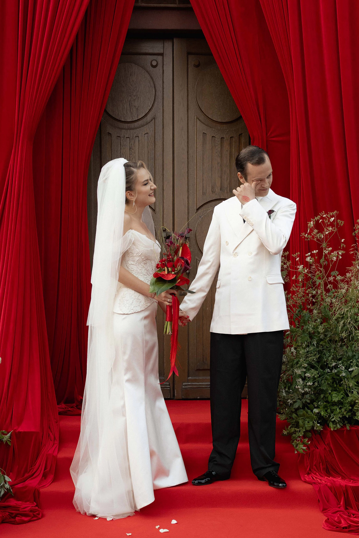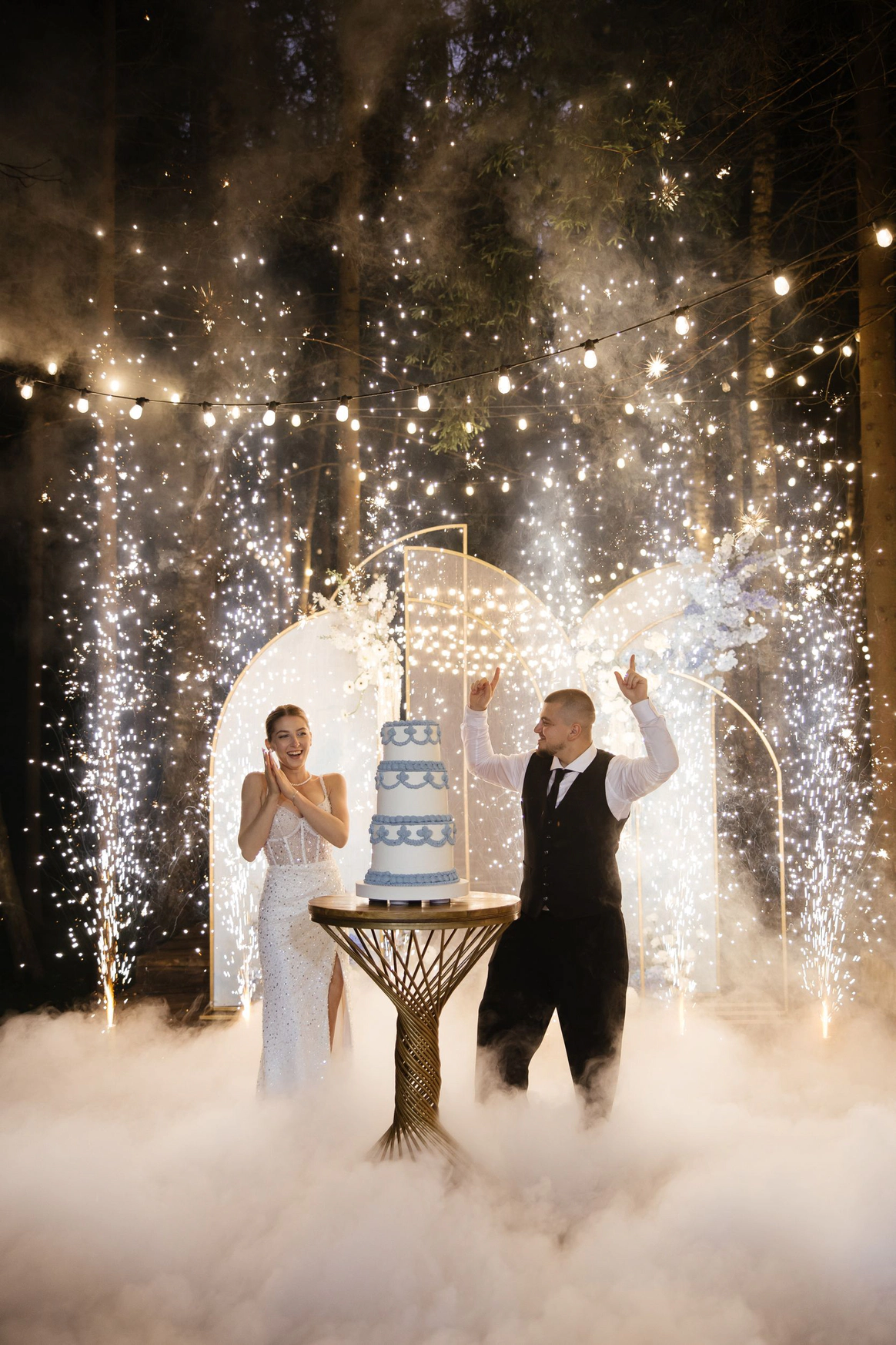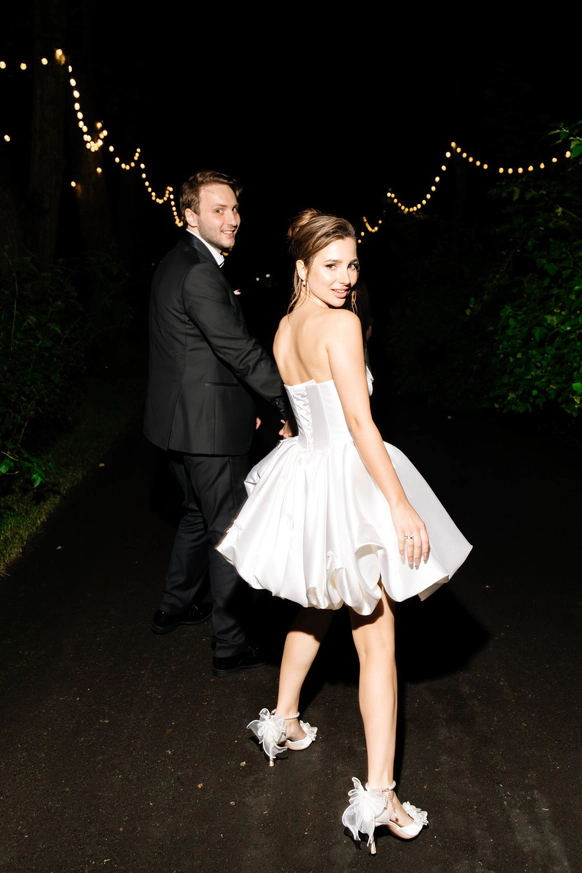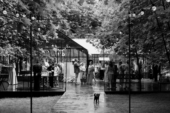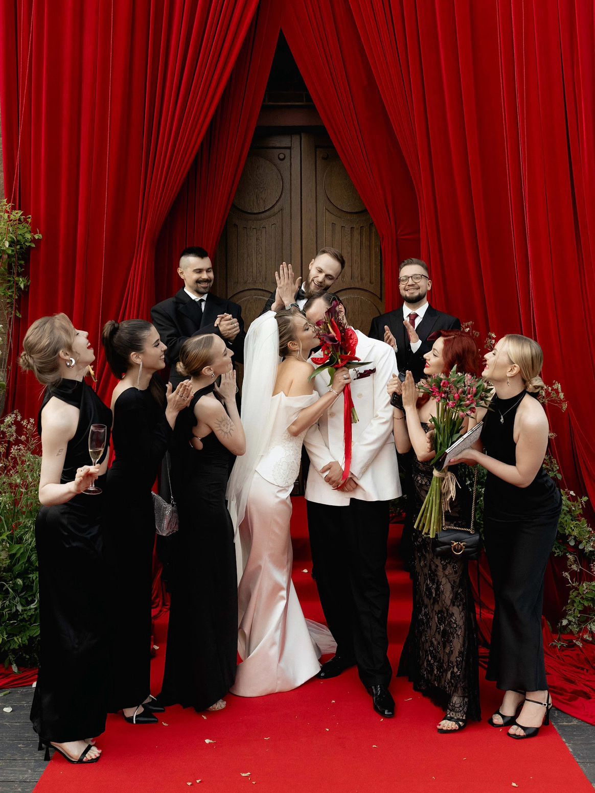 Мы нашли площадку, где всё сошлось идеально: загородные дома для размещения гостей, банкетный зал и живописная территория для выездной регистрации. При этом церемония была официальной — очень удобное решение для такой концепции.