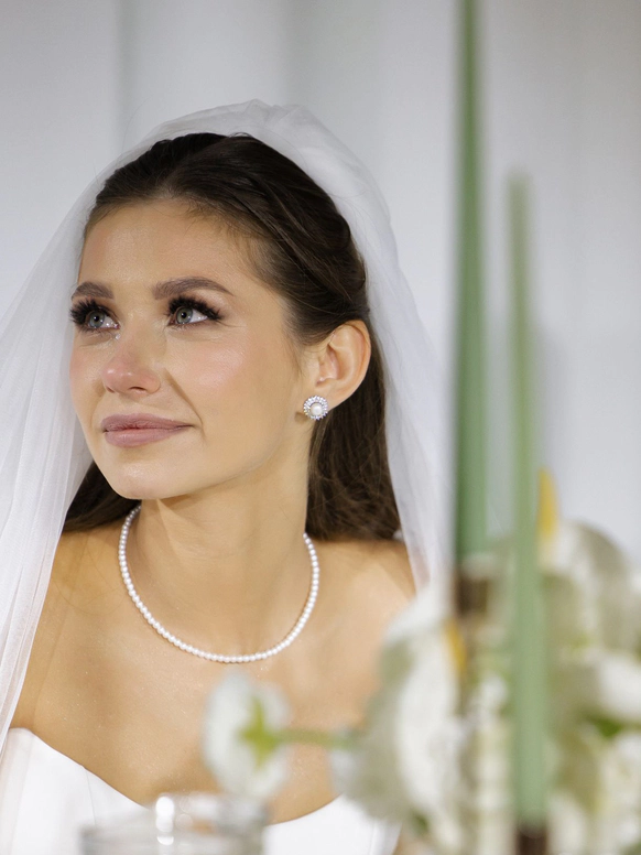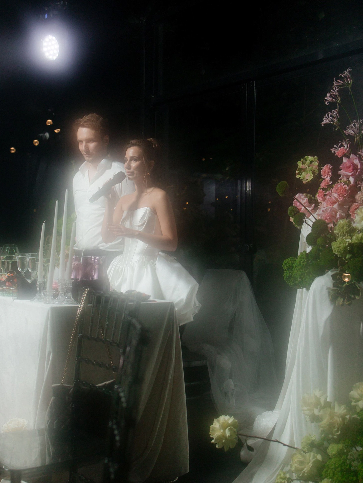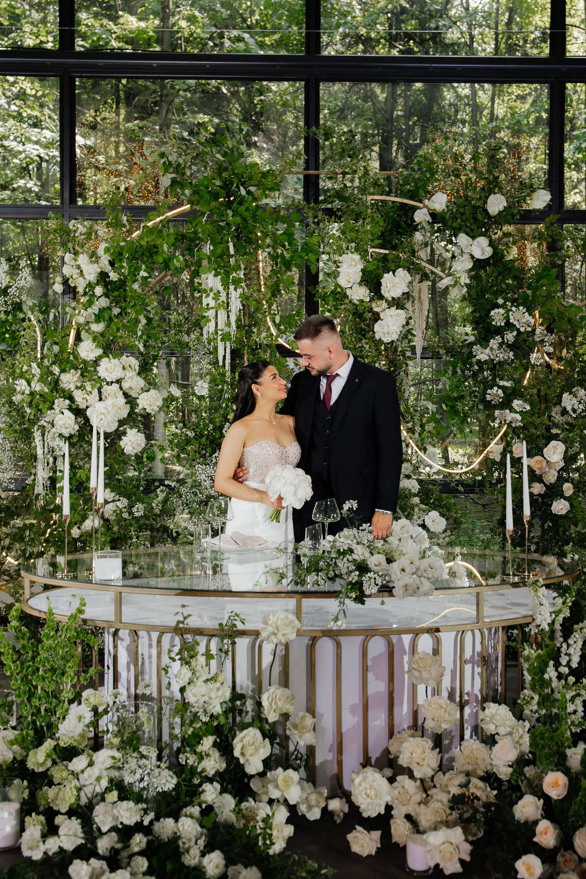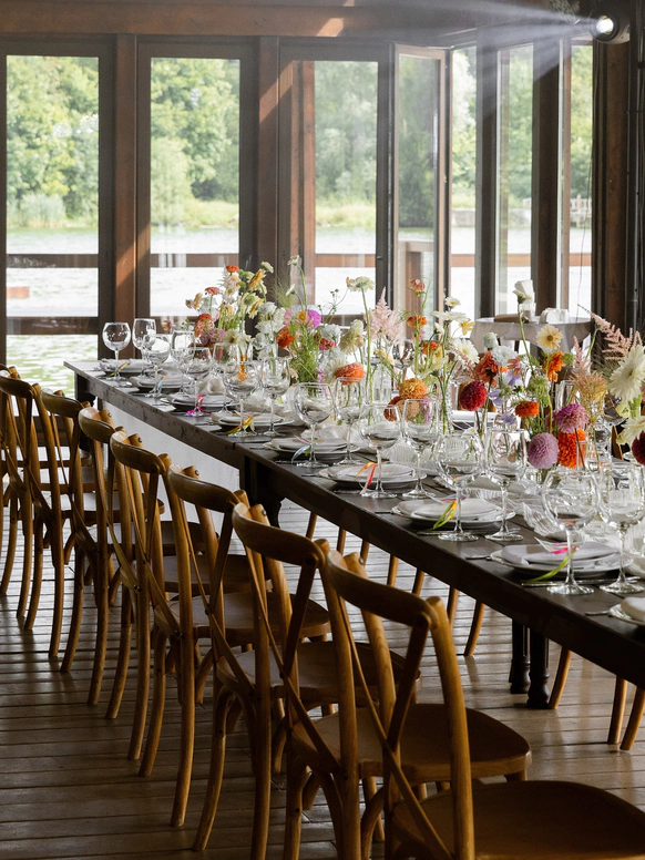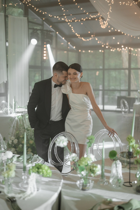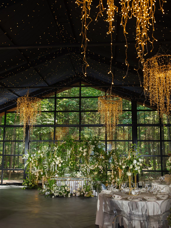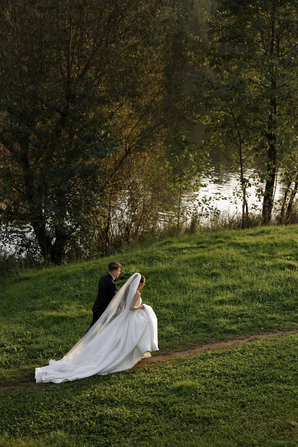 Мы нашли площадку, где всё сошлось идеально: загородные дома для размещения гостей, банкетный зал и живописная территория для выездной регистрации. При этом церемония была официальной — очень удобное решение для такой концепции.