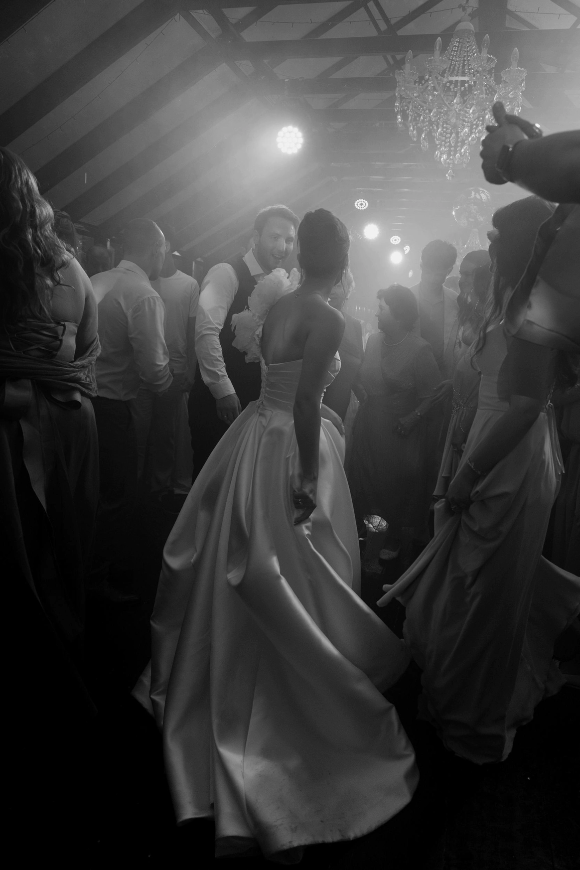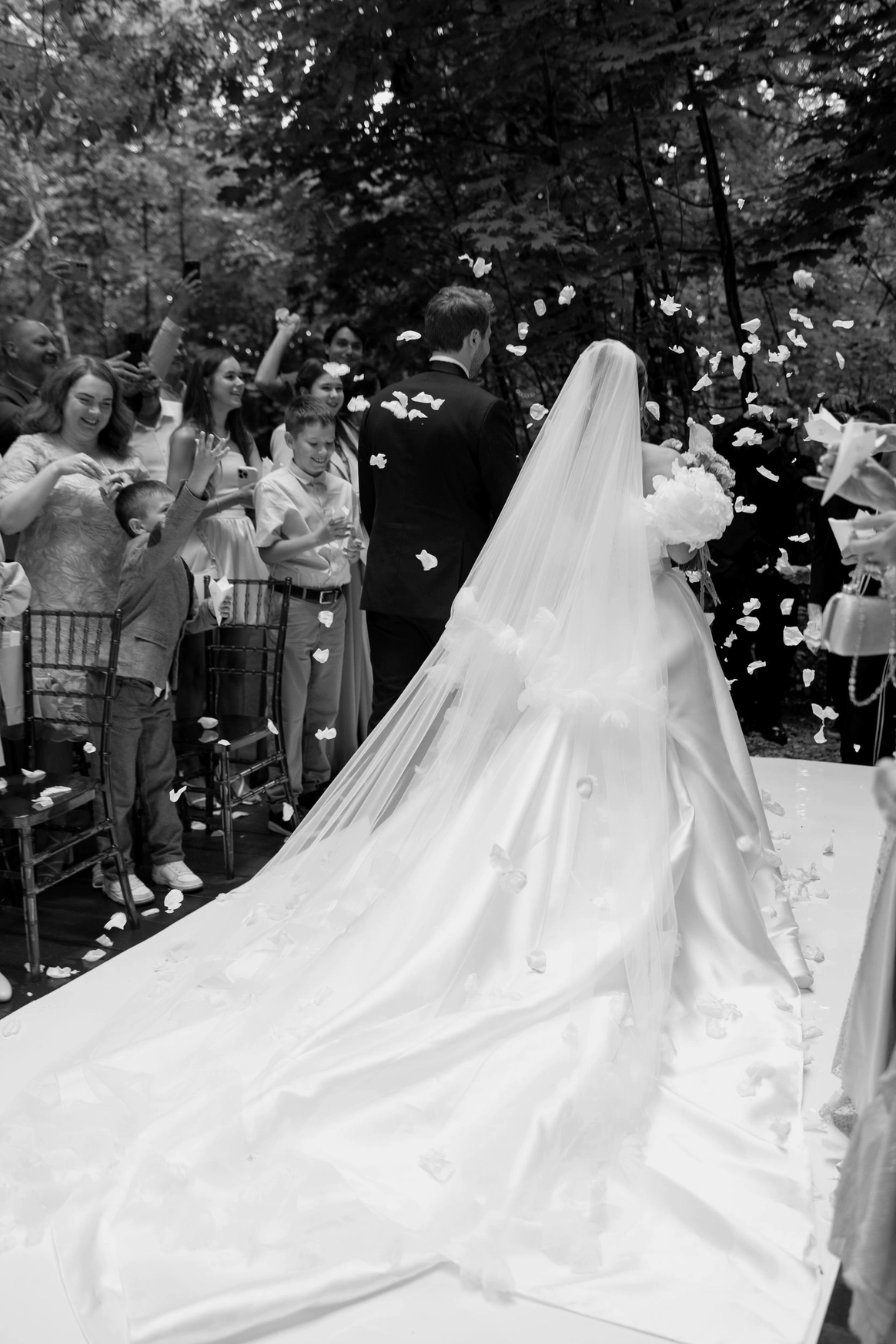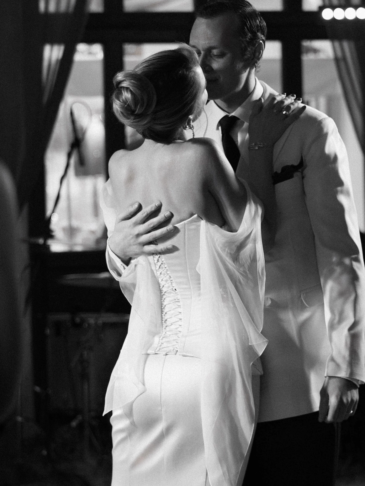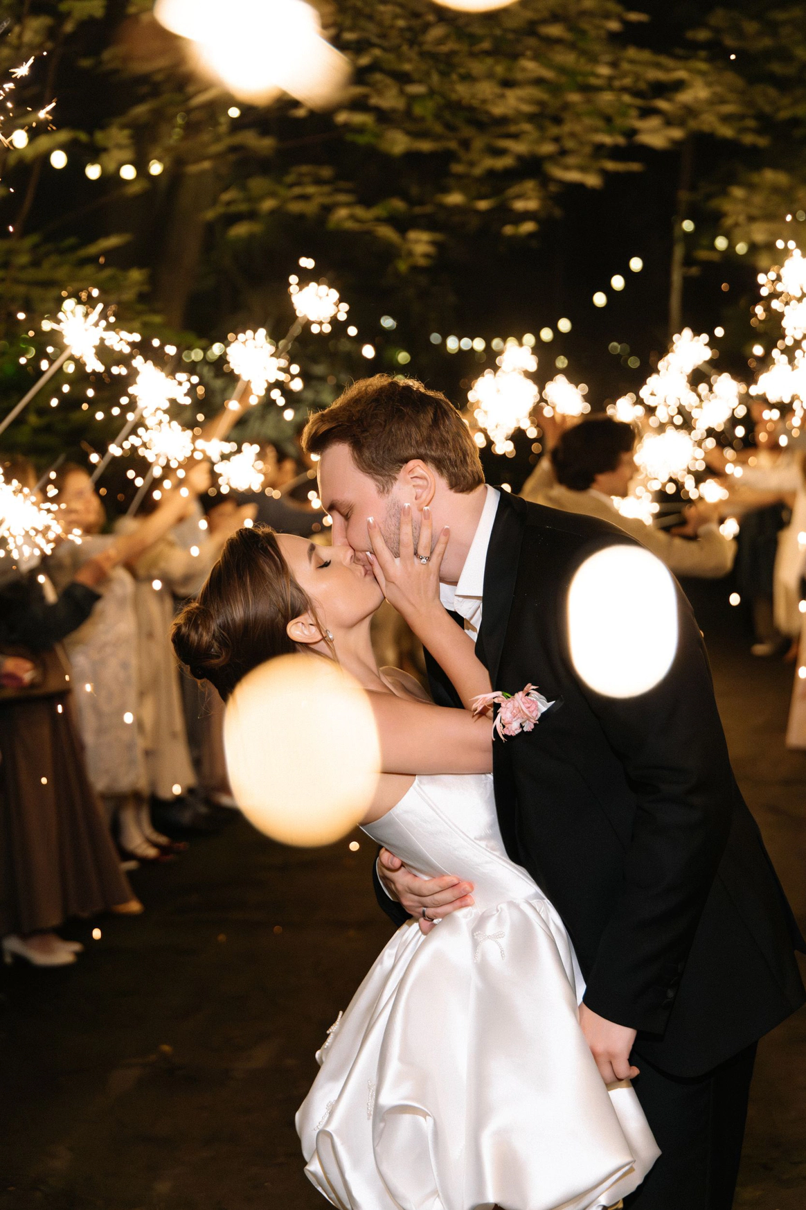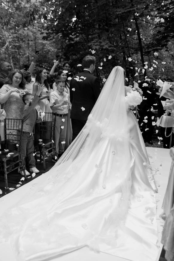 Мы нашли площадку, где всё сошлось идеально: загородные дома для размещения гостей, банкетный зал и живописная территория для выездной регистрации. При этом церемония была официальной — очень удобное решение для такой концепции.