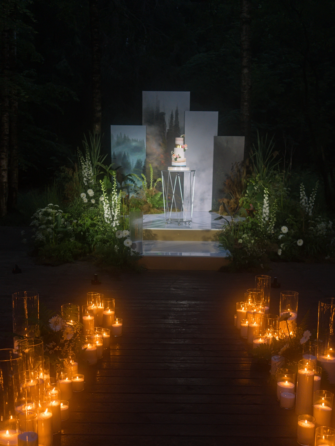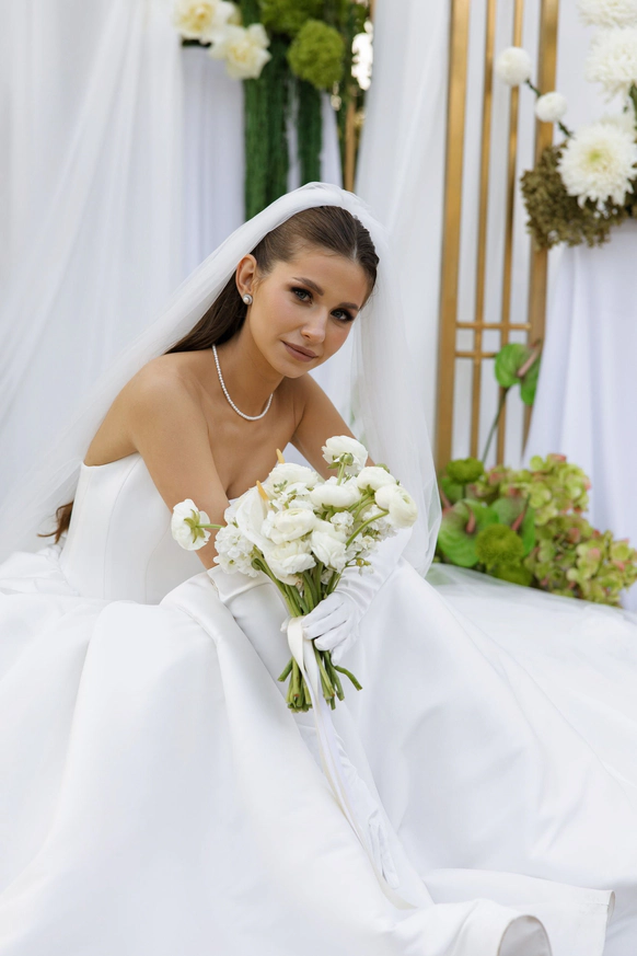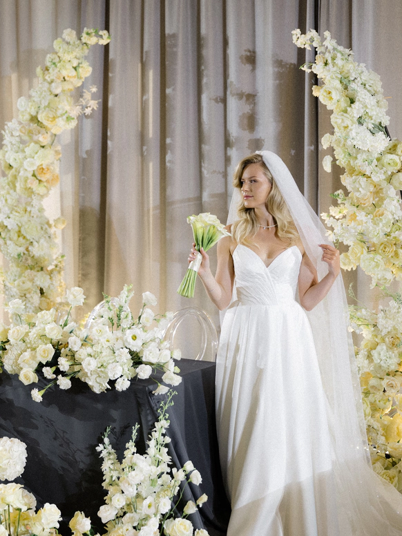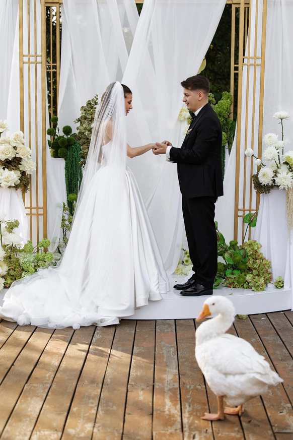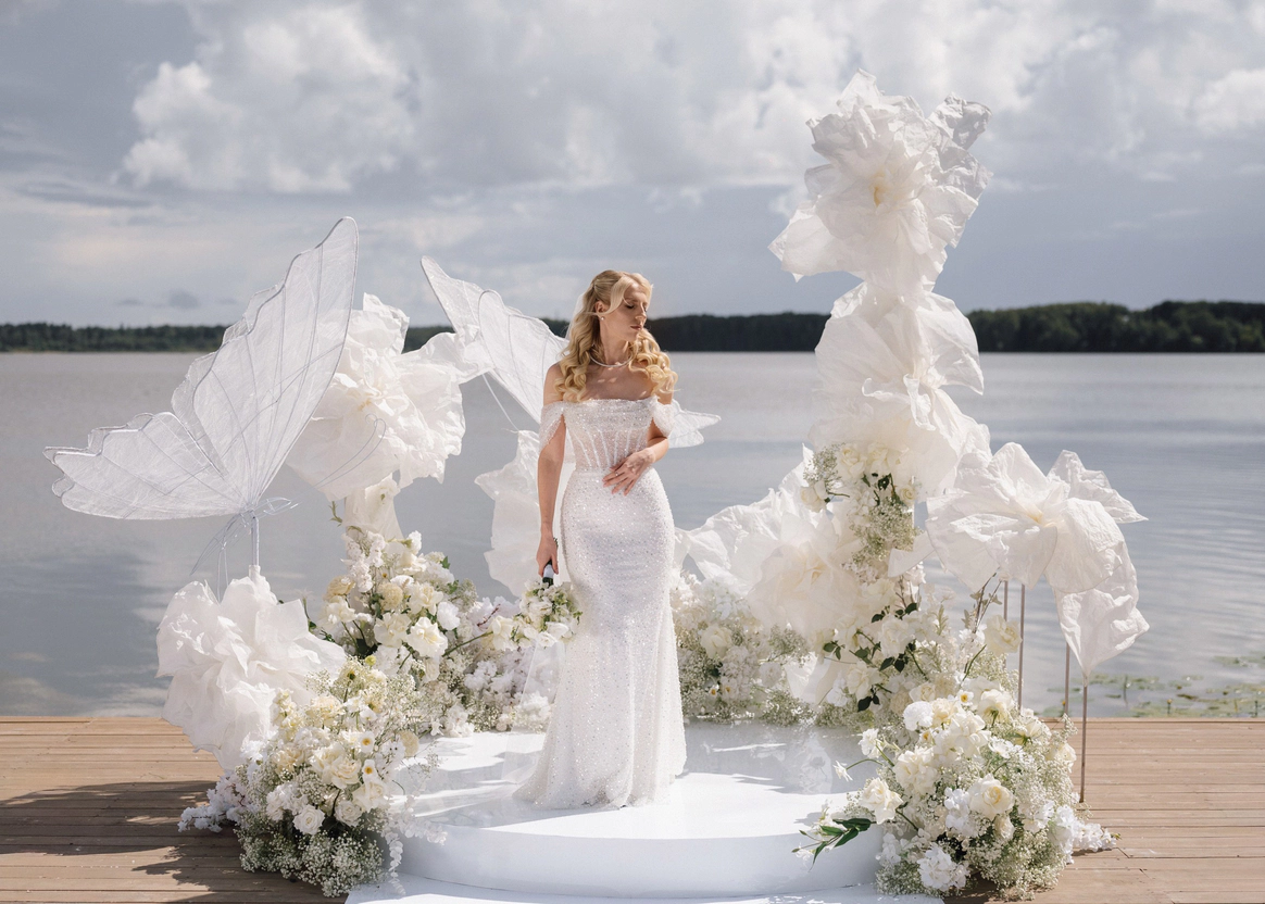 Эта комбинация позволила объединить романтичность образа невесты с естественной природной средой площадки.