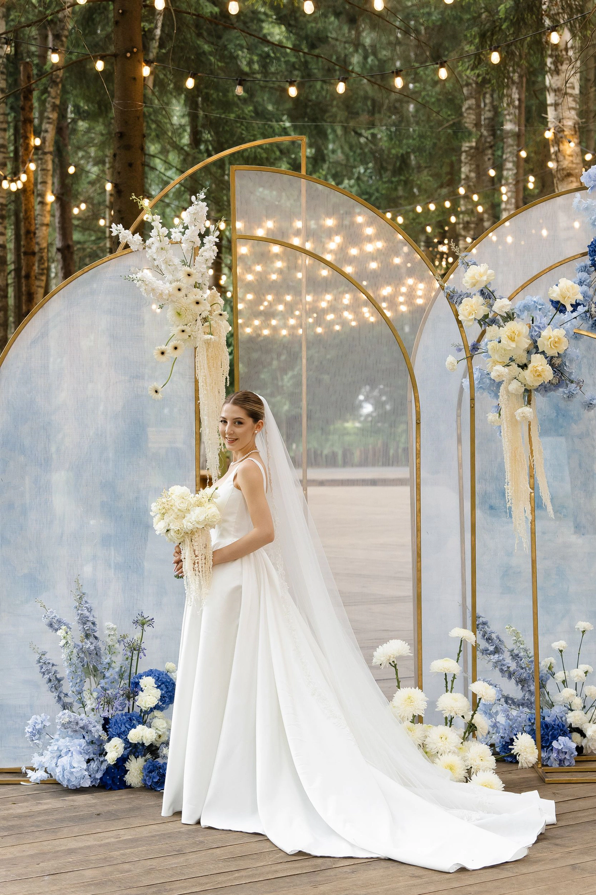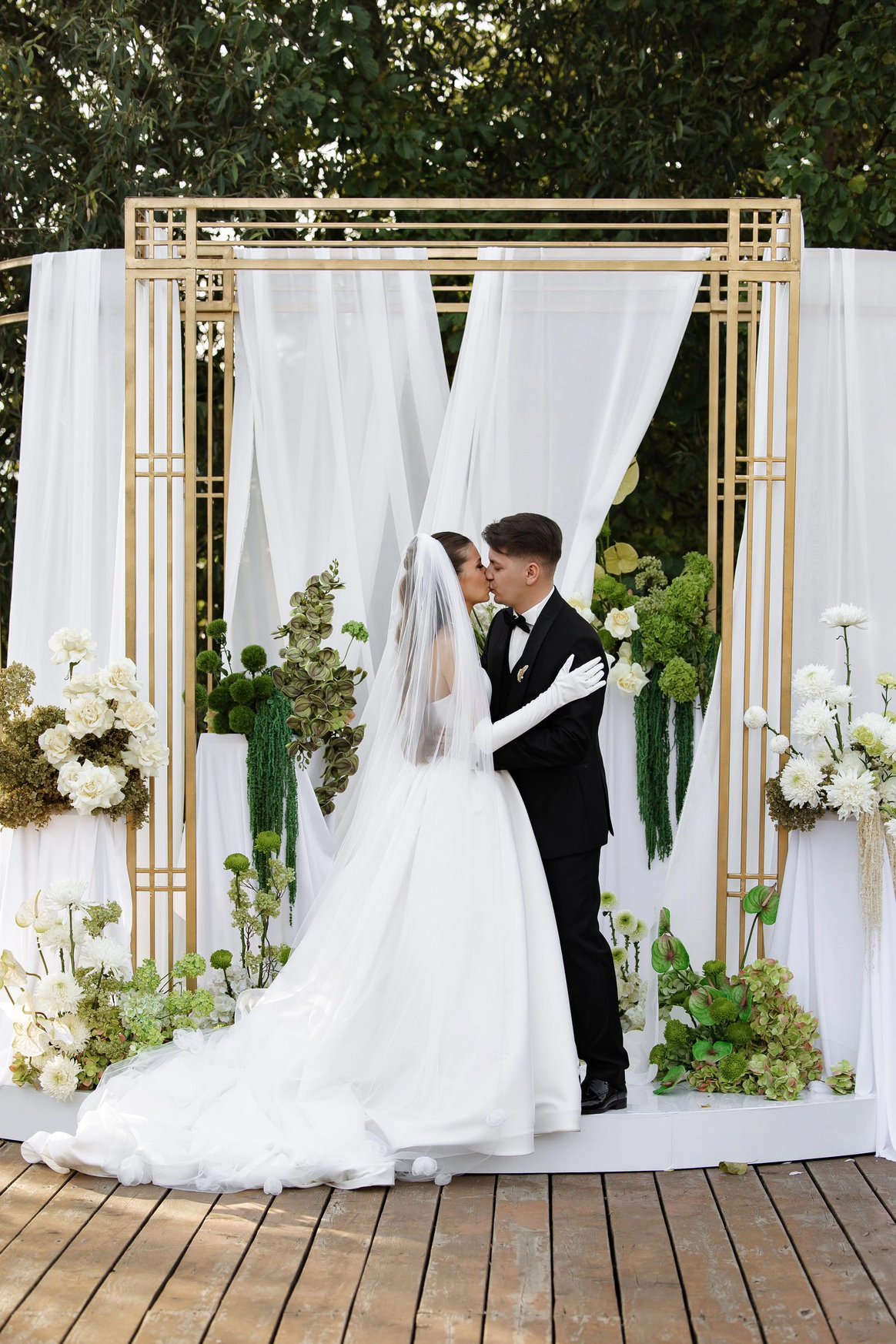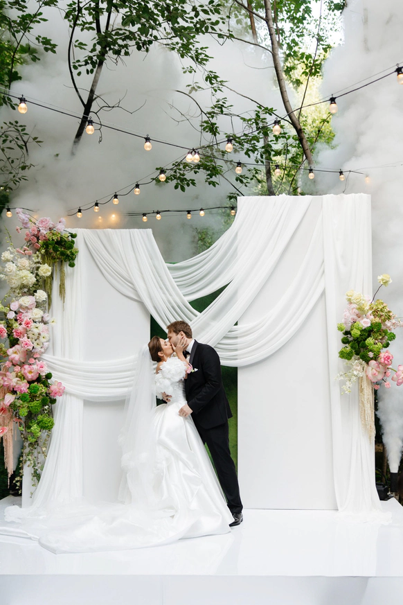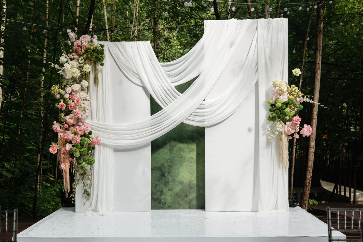 Центральным элементом оформления стала масштабная арка для церемонии с легкой драпировкой. Флористика по краям поддерживала ощущение лёгкости словно застыв в воздухе.