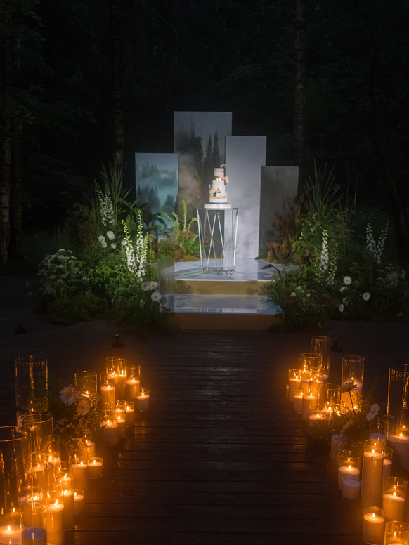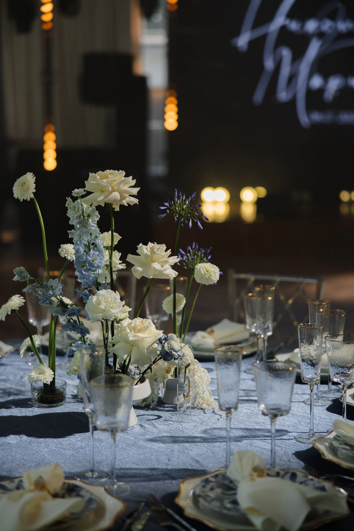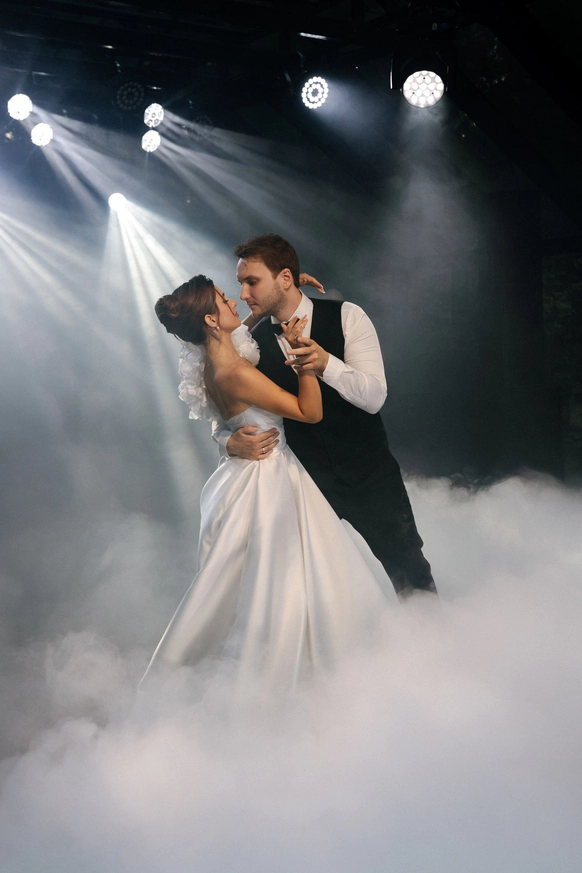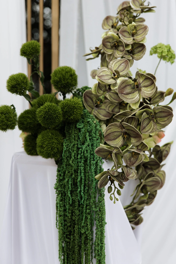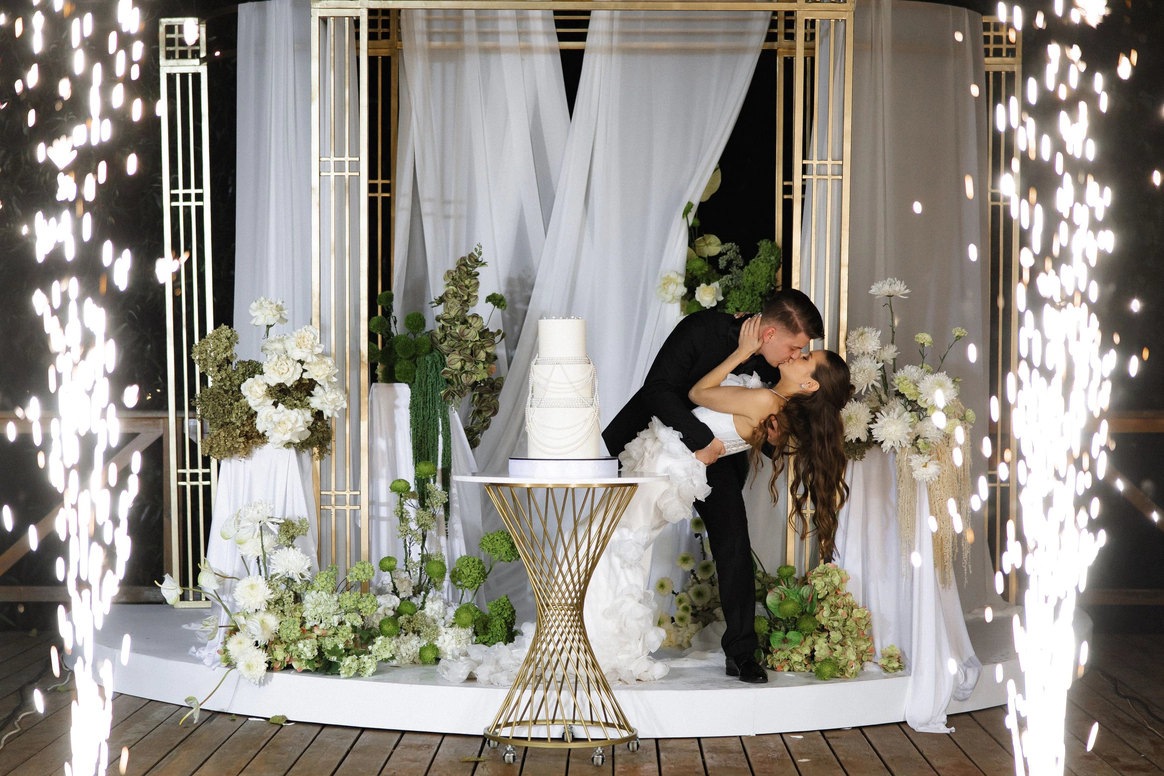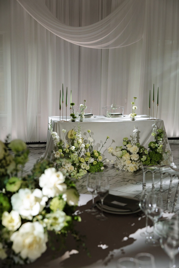 Центральным элементом оформления стала масштабная арка для церемонии с легкой драпировкой. Флористика по краям поддерживала ощущение лёгкости словно застыв в воздухе.