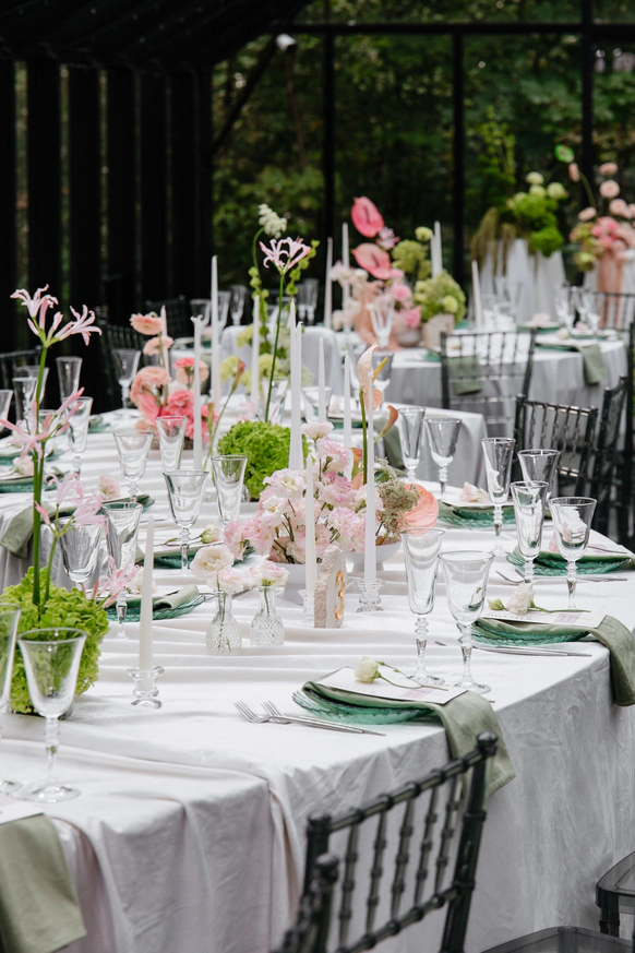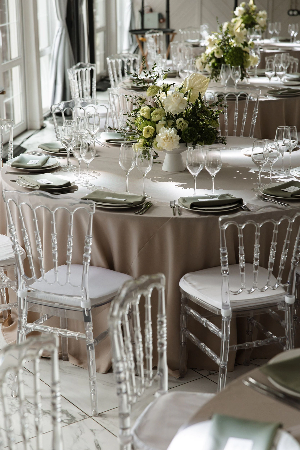 Круглые столы дополнили двумя длинными «змейками». Скатерти уложили внахлёст, создавая ощущение лёгкой небрежности.