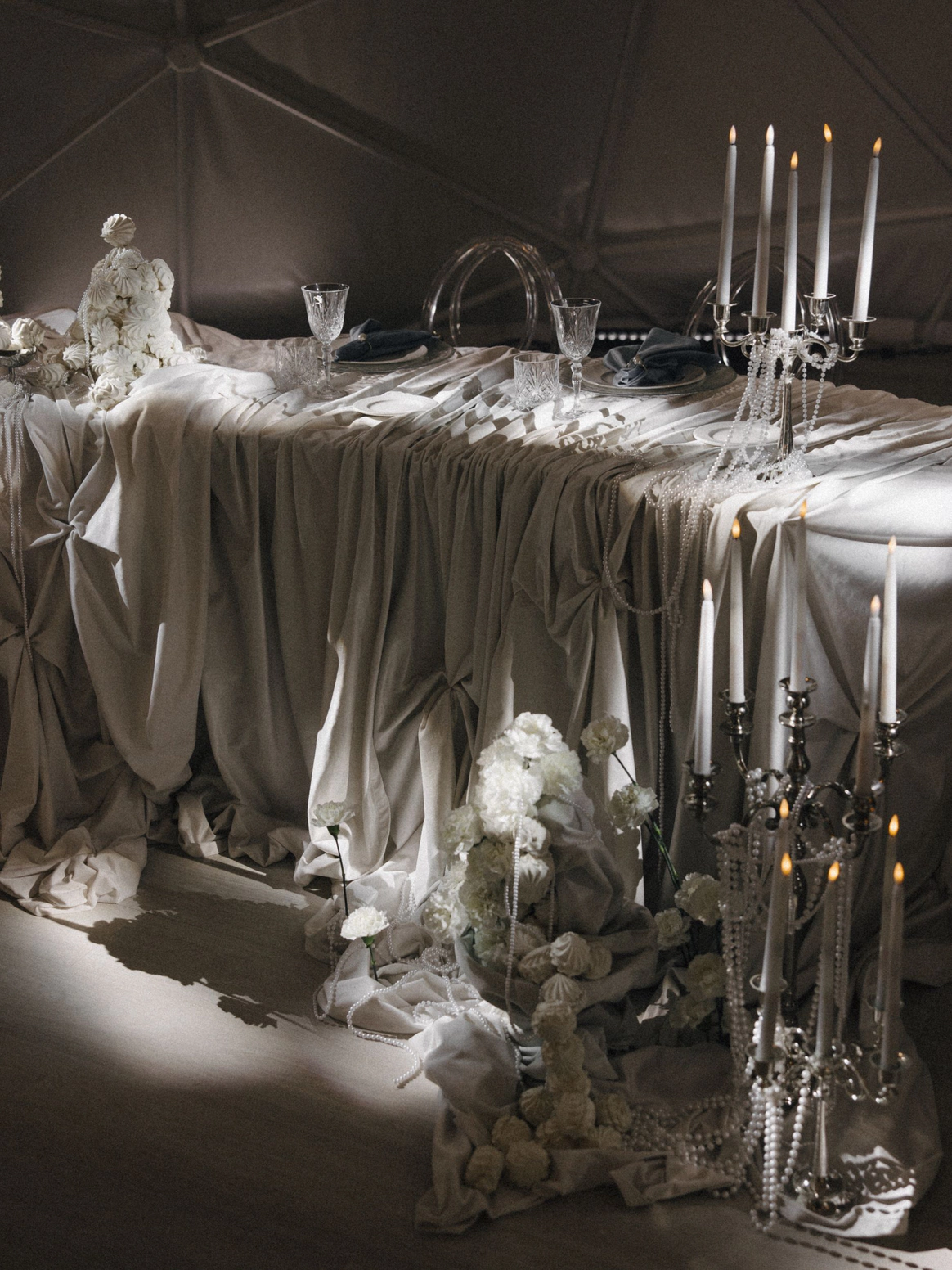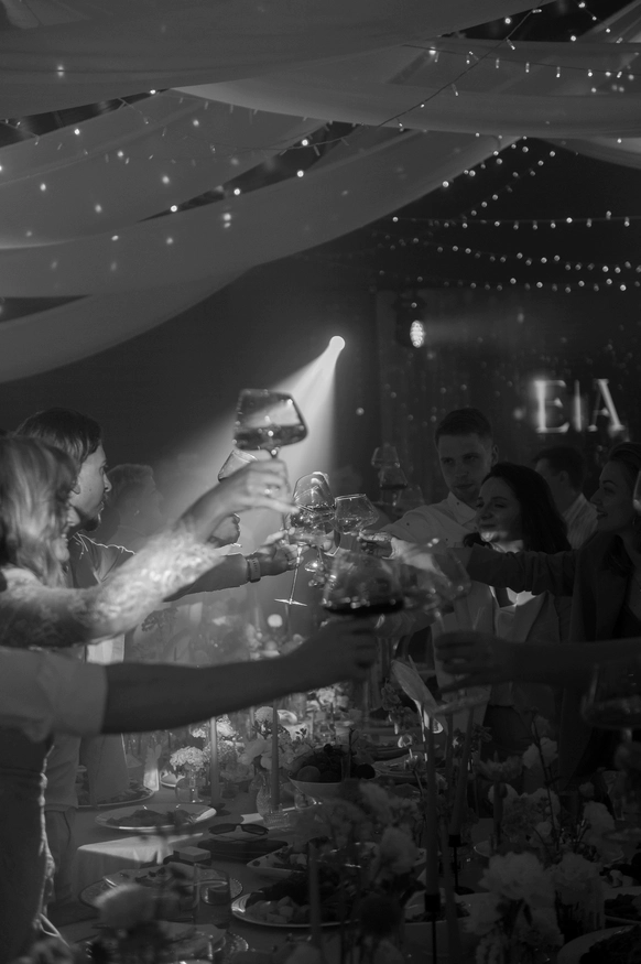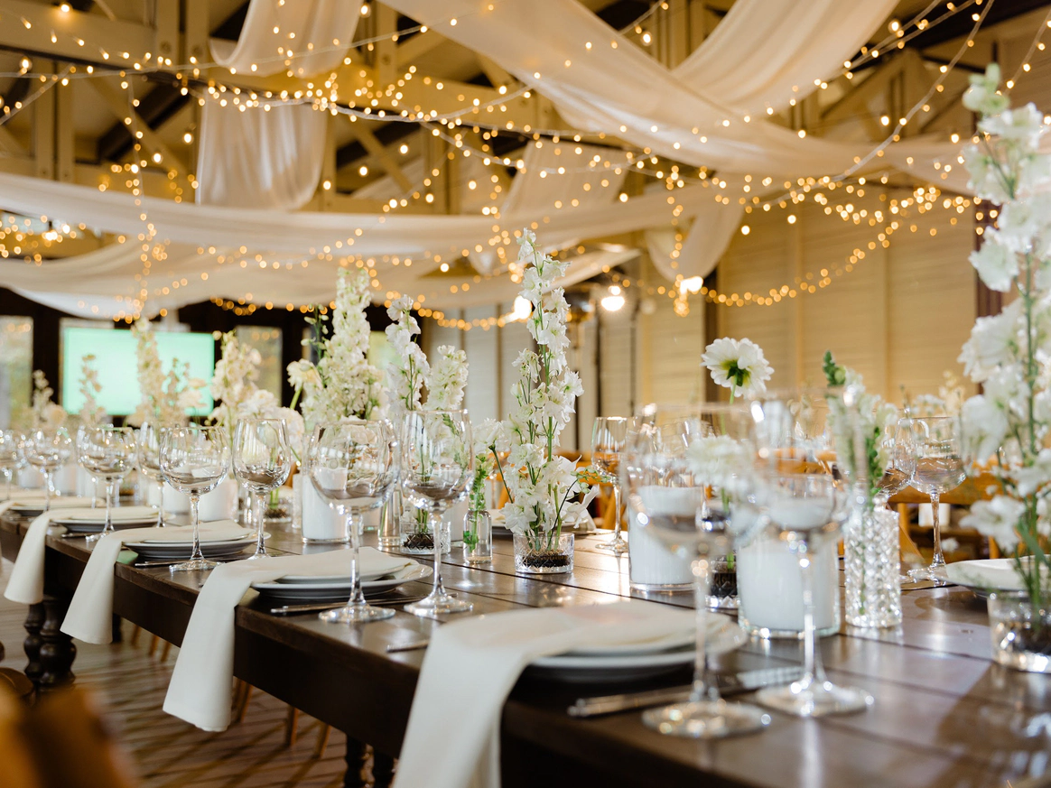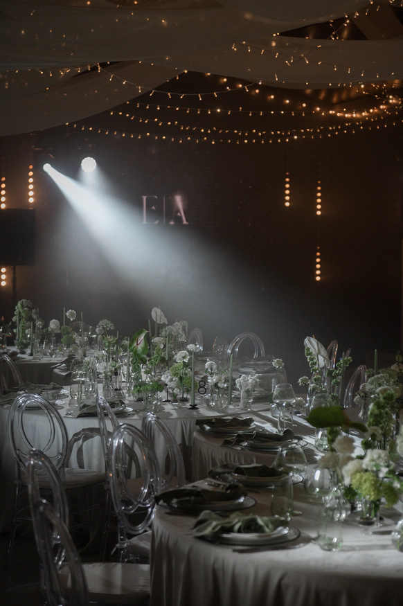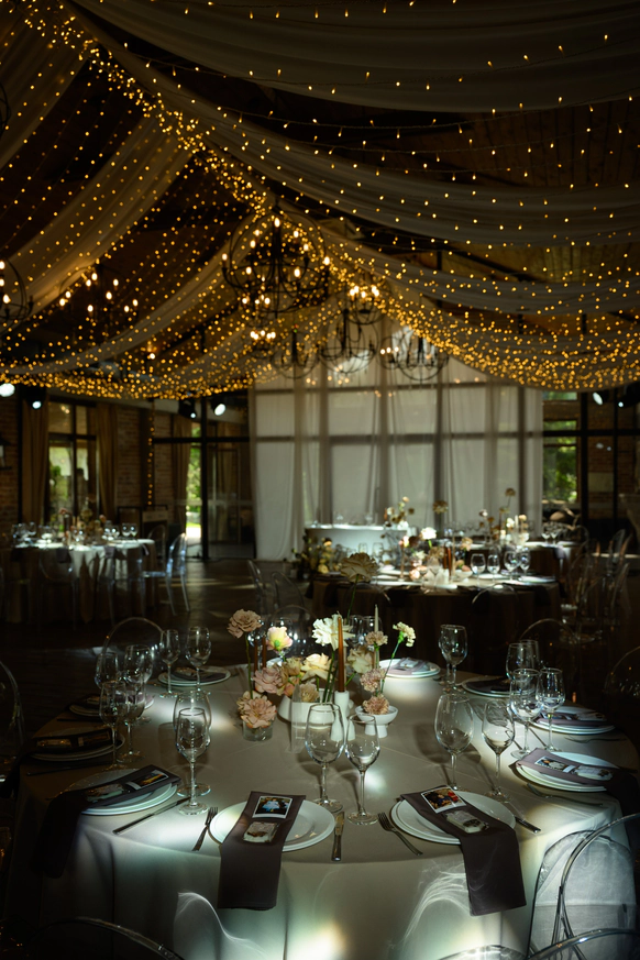 В банкетном зале мы продолжили ту же линию: легкие ткани, светлая палитра, аккуратная классическая сервировка и теплые гирлянды лампочек под потолком.