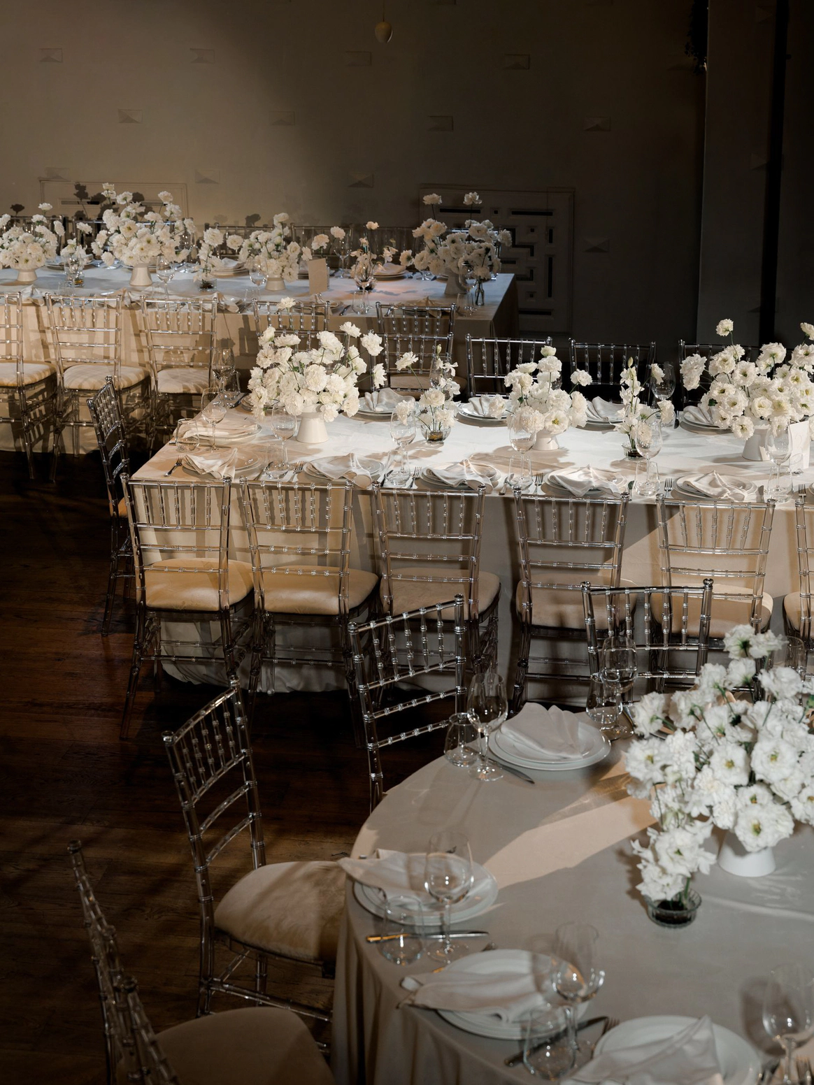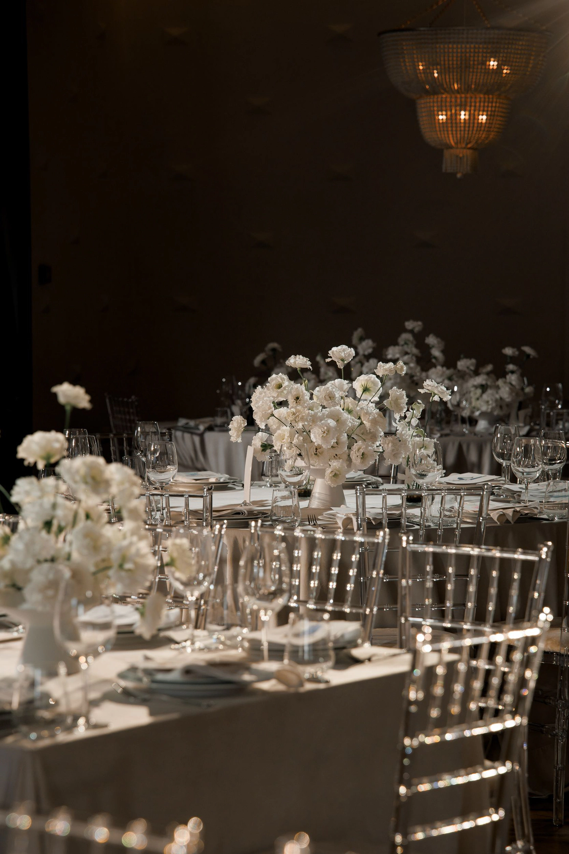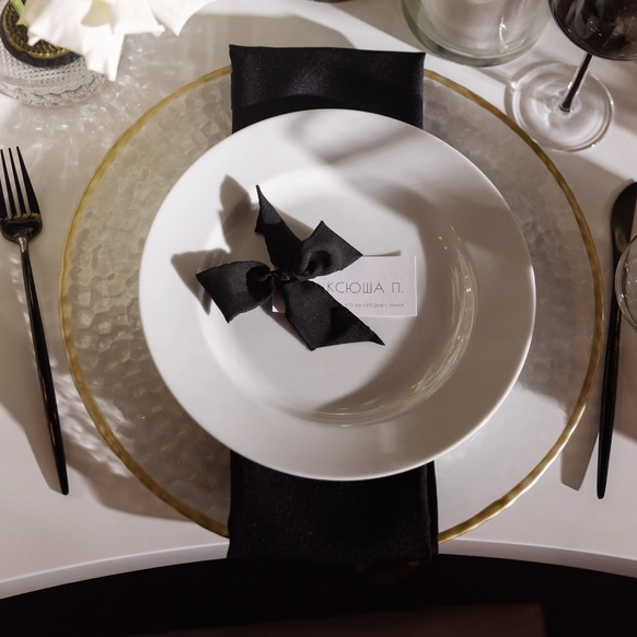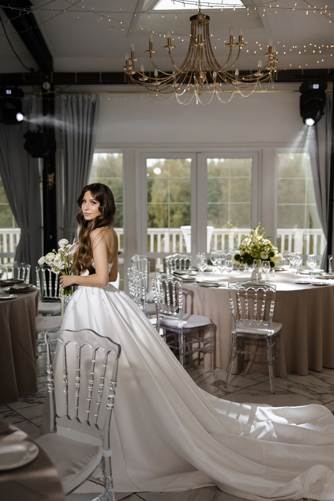 В банкетном зале мы продолжили ту же линию: легкие ткани, светлая палитра, аккуратная классическая сервировка и теплые гирлянды лампочек под потолком.
