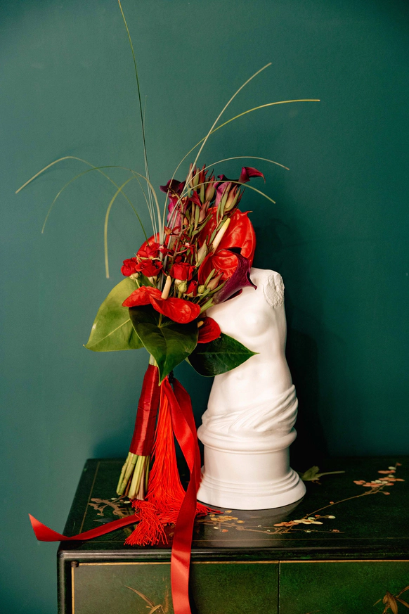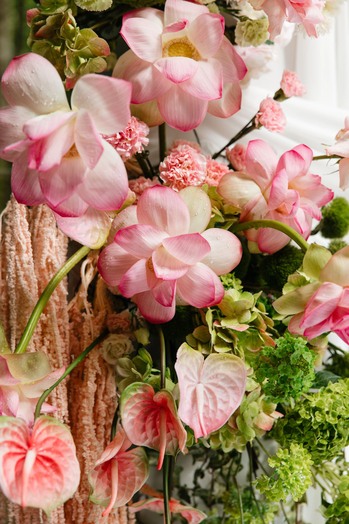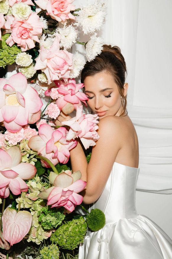 В композициях использовали большое разнообразие цветов, а главным символом стал лотос — цветок, о котором невеста мечтала.