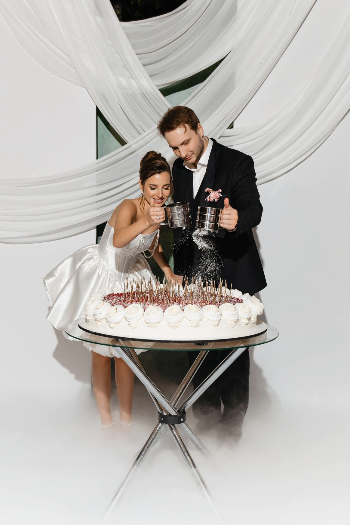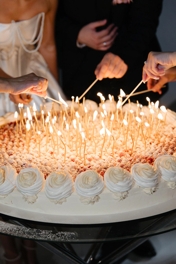 Ребята самостоятельно посыпали его сахарной пудрой, украсили свечами и вместе с гостями зажгли их, после чего загадали своё первое совместное желание.