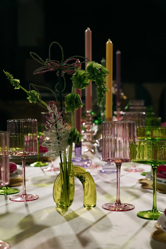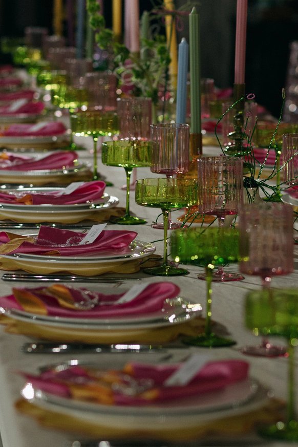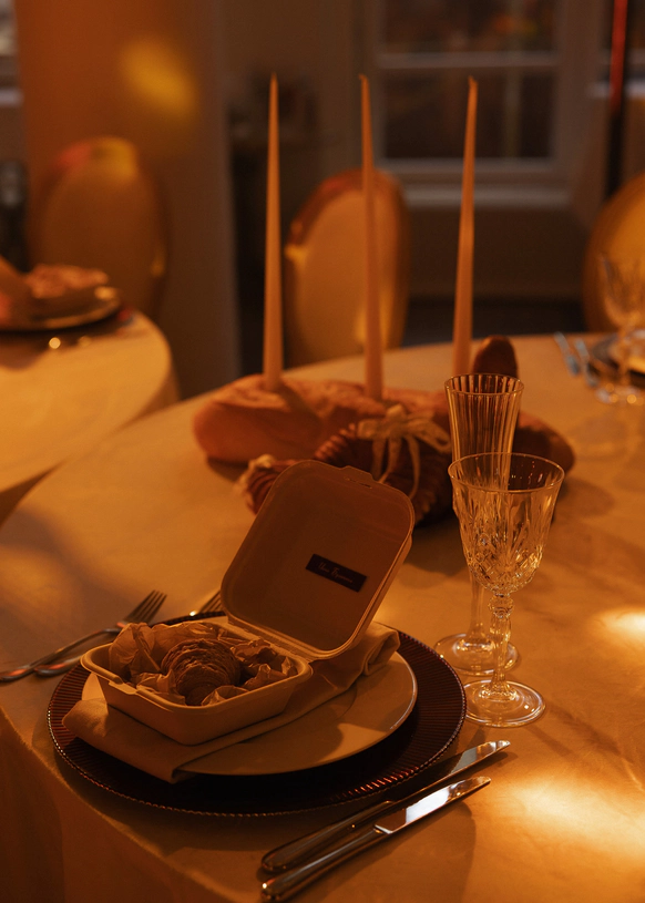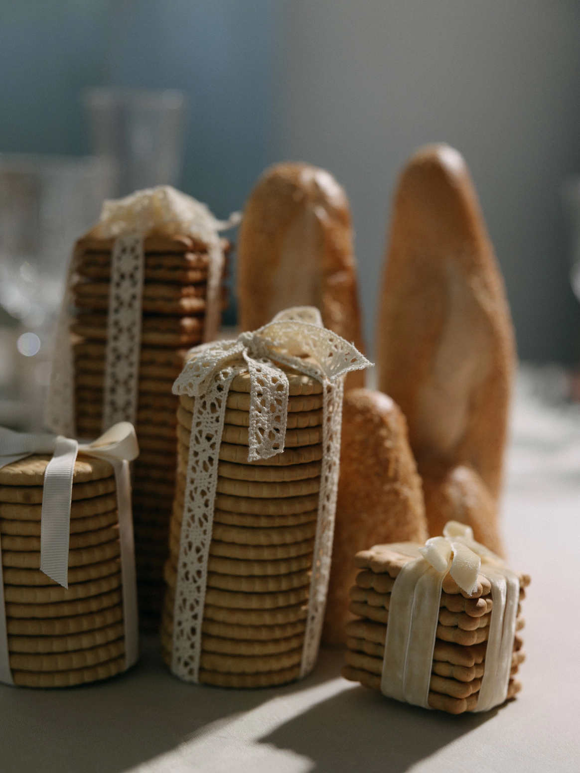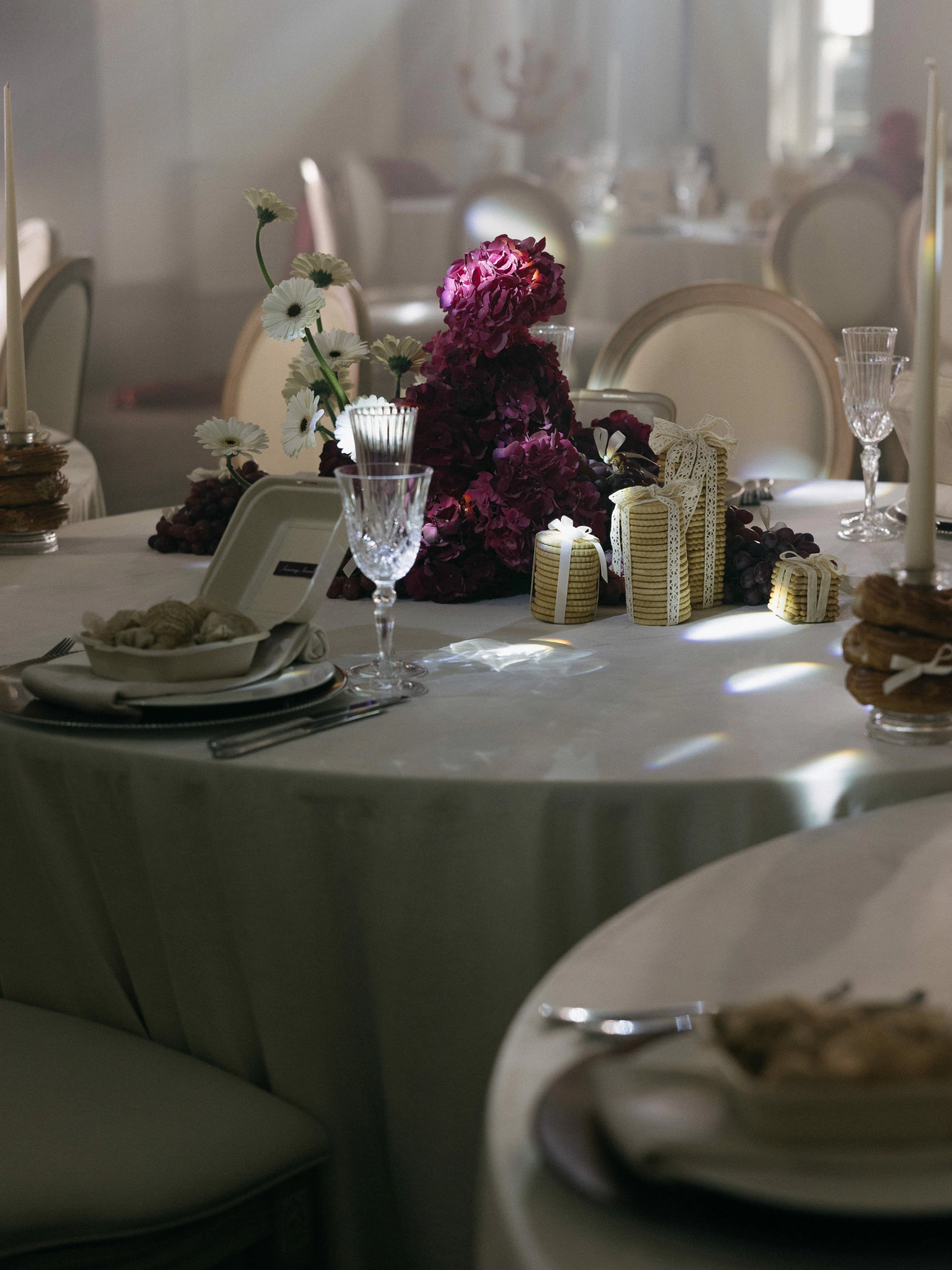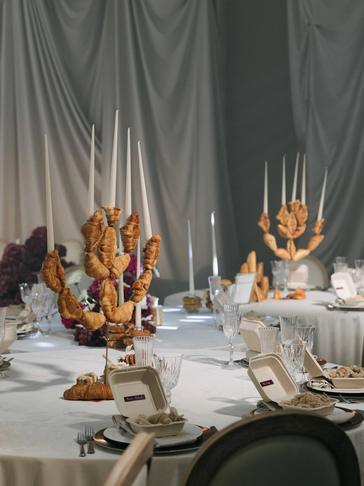 Выпечка была интегрирована в декор в разных формах: подсвечники из круассанов, композиции с хлебом, заварные кольца и профитроли. Печенье стало игривой отсылкой к детству, а общий тон пространства поддерживался сочетанием массивных стульев, хрустальных бокалов, аккуратной сервировкой и текстилем в нежном оттенке.